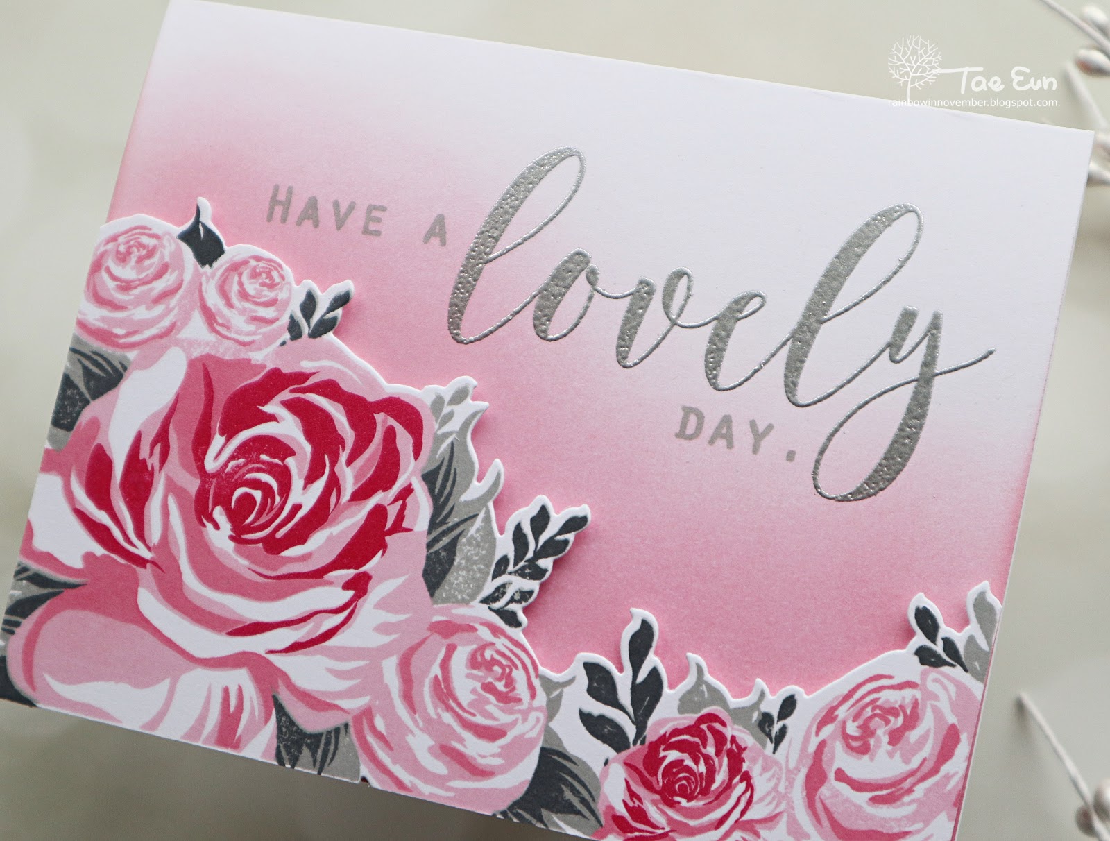 I stamped the flowers in Rose Quartz, Soft Garnet and Red Sangria and the leaves in Smoky Quartz and Light Onyx (all inks are from The Ton). I then cut the floral cluster using coordinating die. I blended Rose Quartz and Soft Garnet on the white cardbase and silver heat embossed the big sentiment. The small sentiment was stamped in Smoky Quartz. I finished off the card by foam mounting the floral panel onto the card.