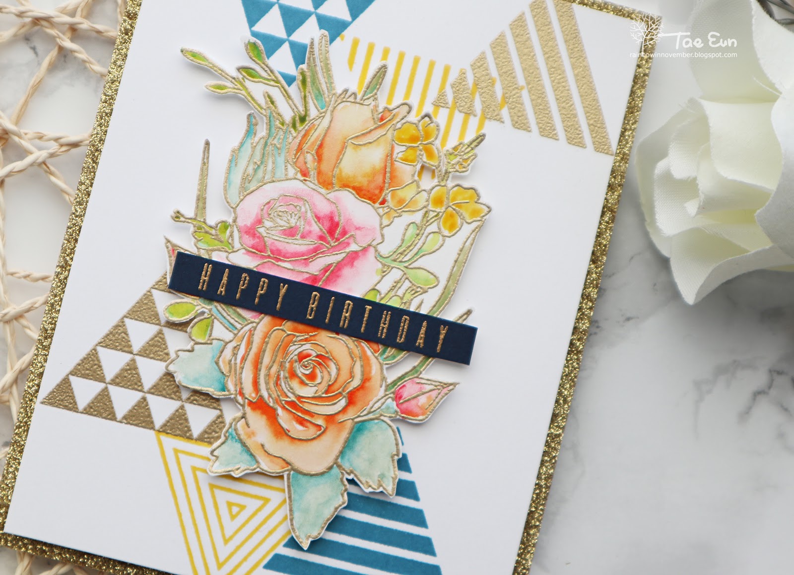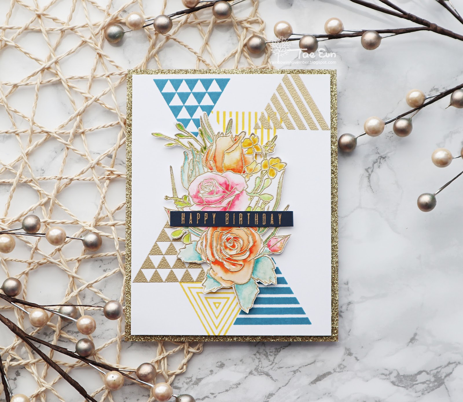I started by making the background panel. I stamped the triangles from Trigonometry in Dusk from Cool Summer Night Mini cube set and Maple Yellow from Pocketful Sunshine set. I gold heat embossed two triangles onto the panel. I gold heat embossed the rose cluster from Forever and Always on a Bristol Vellum panel, watercolored and fussy cut the image. The sentiment from Trigonometry was gold heat embossed on a strip of dark navy cardstock.