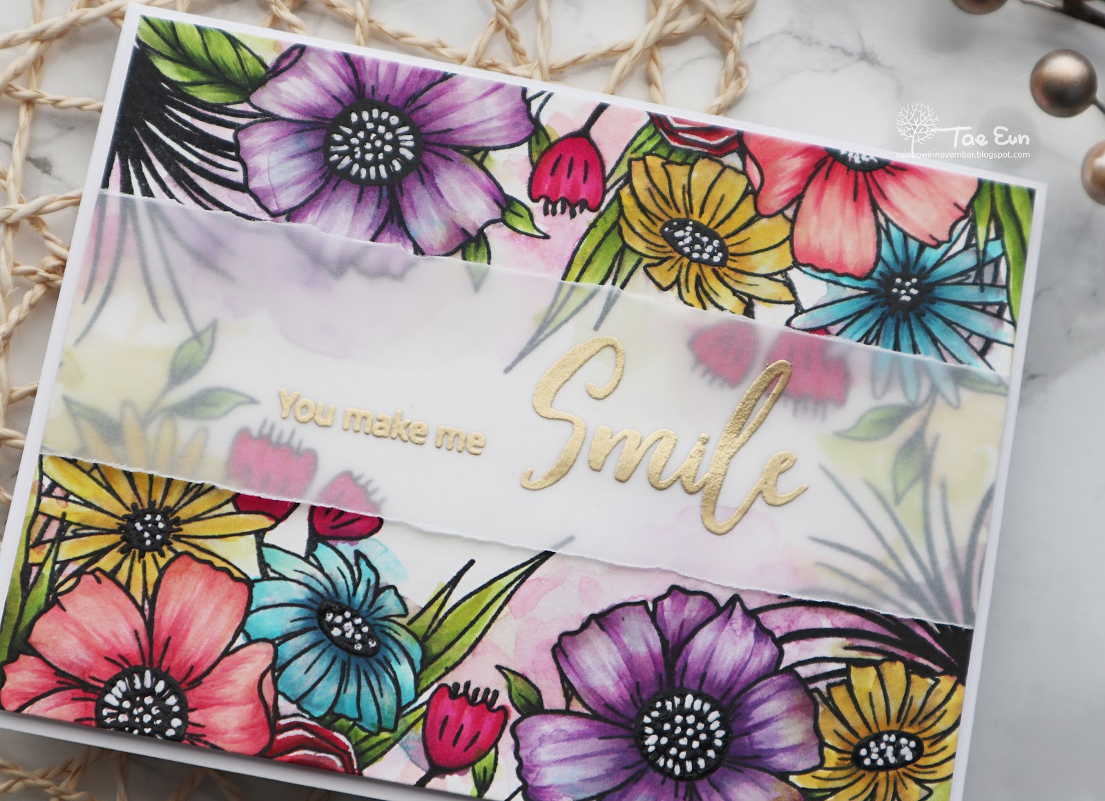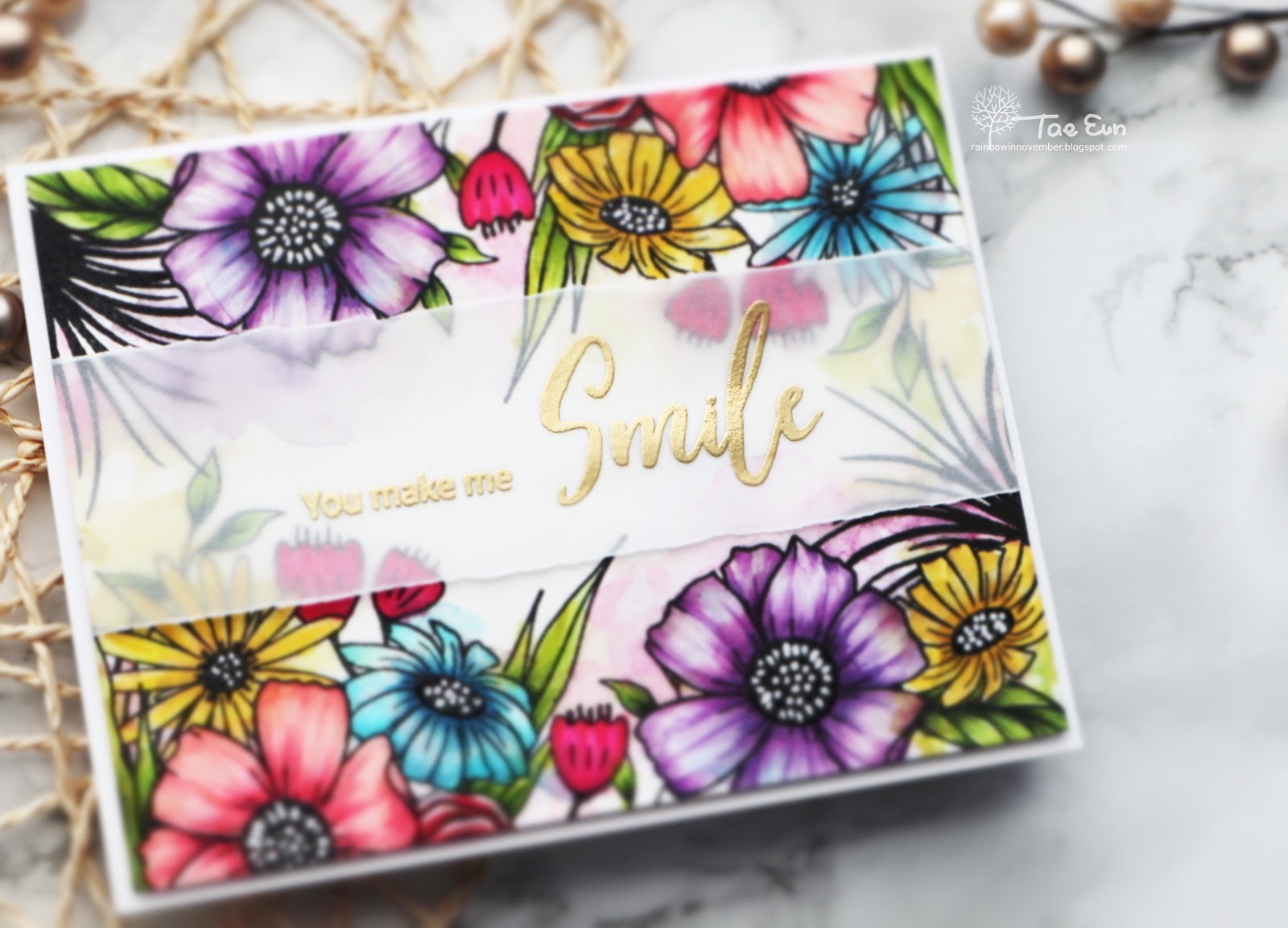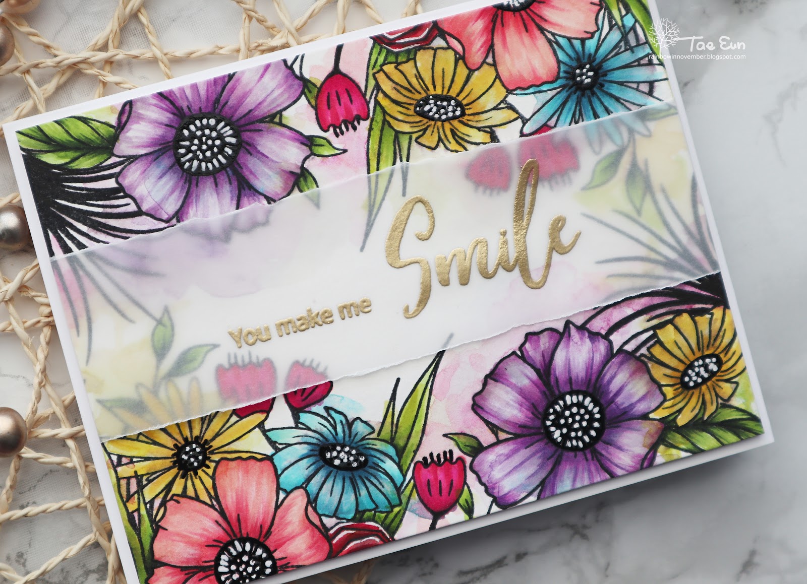 I stamped the flower bouquet from Happy Bloom set two times on top and bottom of an Canson watercolor paper panel in some copic-friendly black ink. I colored the whole panel with watercolors in purple, pink, yellow and light blue with lots of water to created a loose watercolor wash background. I then colored the image using Altenew Artist markers except for the small pink flowers.