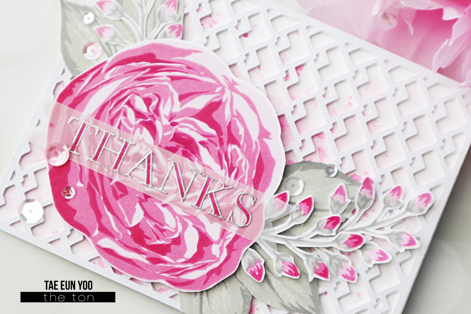 I made a pink watercolor background and glued it on the cardbase. I cut the Geo Mountain Coverplate die A three times from white cardstock and once from a white cardstock with subtle texture. I stack them all together and added it onto the card. I then arranged the florals as shown in the picture. The sentiment is from Peony Laurel set. I silver heat embossed it on a vellum banner and colored the letters in pink on the back of the vellum using Tombow brush markers.