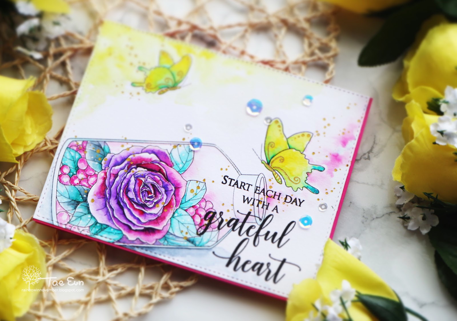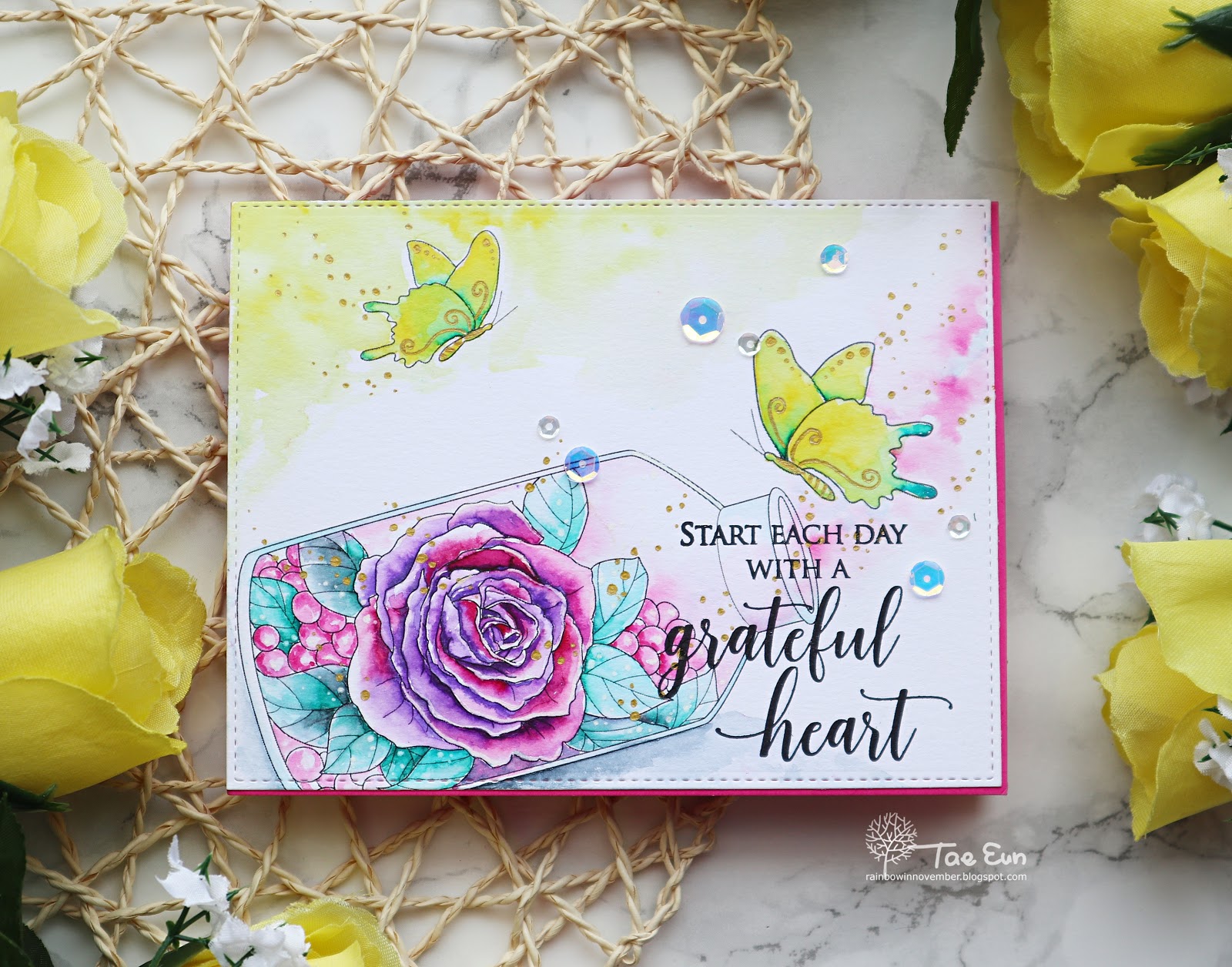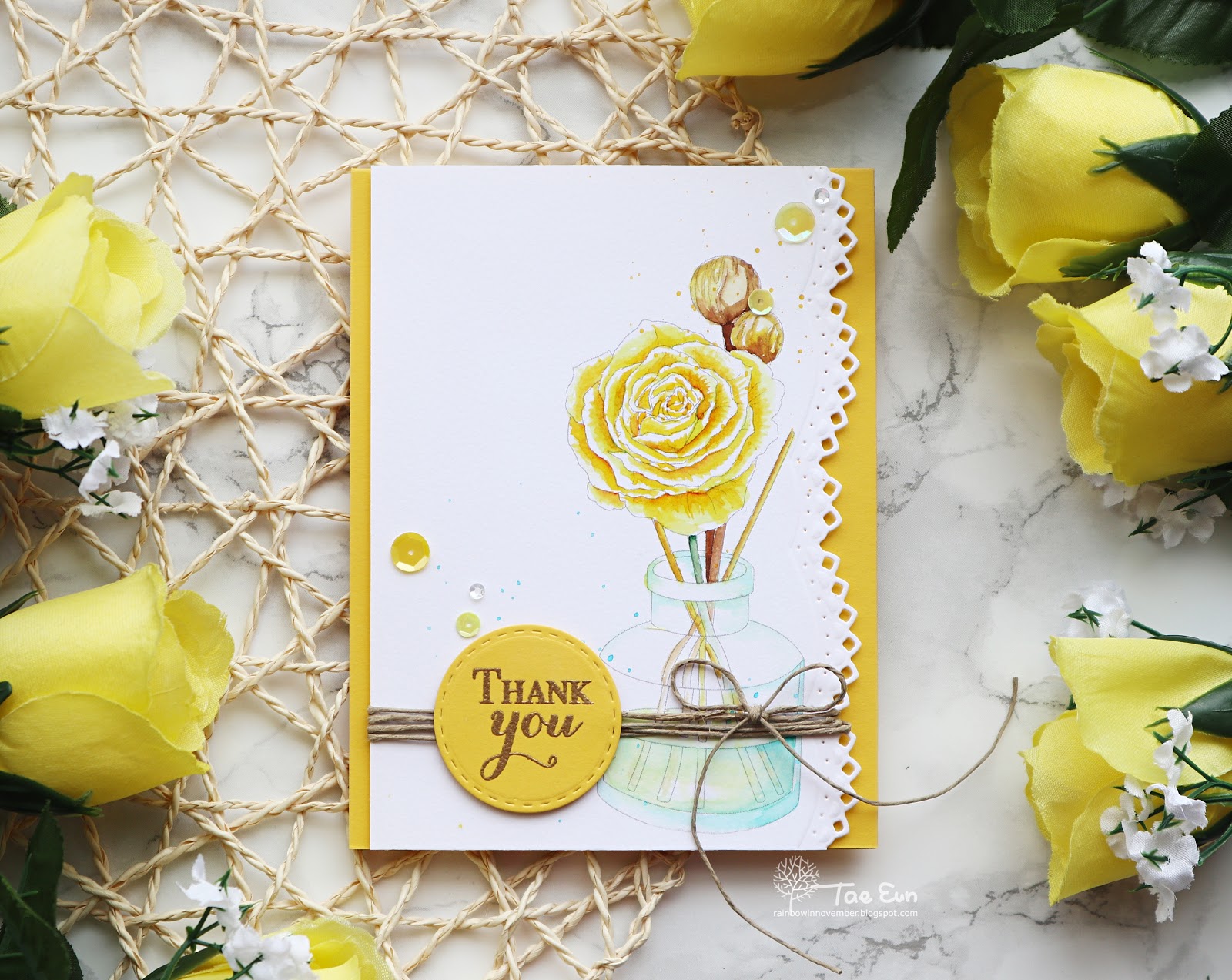 Today I have a couple of cards to share with you. They are featuring EunJi’s new digital stamp set: Bloom Rose. Bloom Rose set contains two gorgeous and unique rose diffuser images, one large rose background and one single rose image. I used the rose diffuser images for today’s cards. You can see EunJi’s beautiful cards using other stamps on her blog!