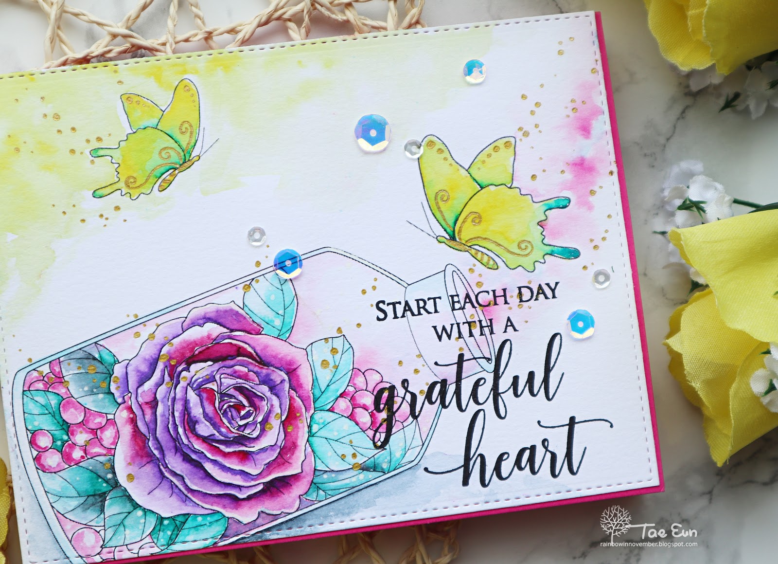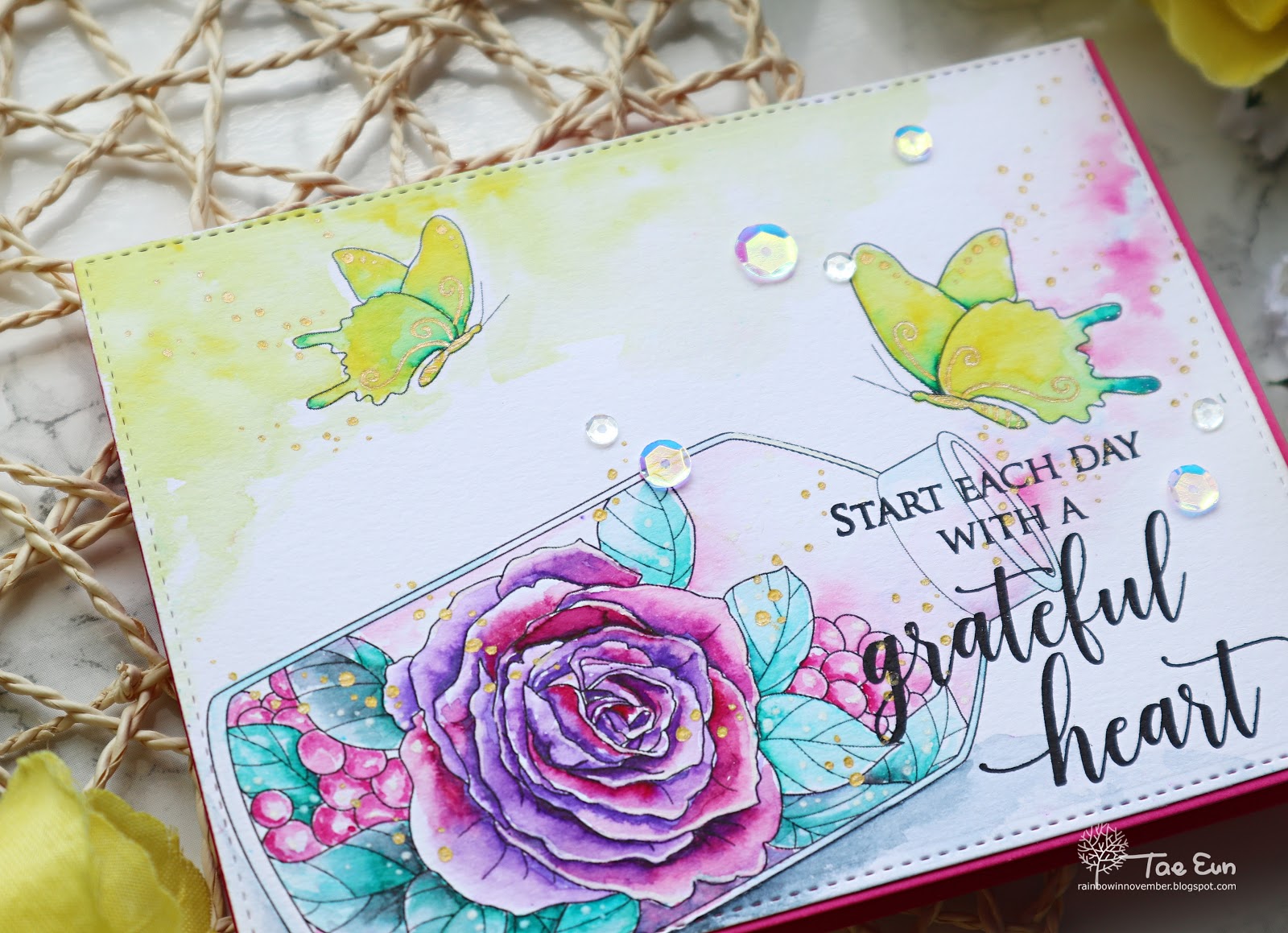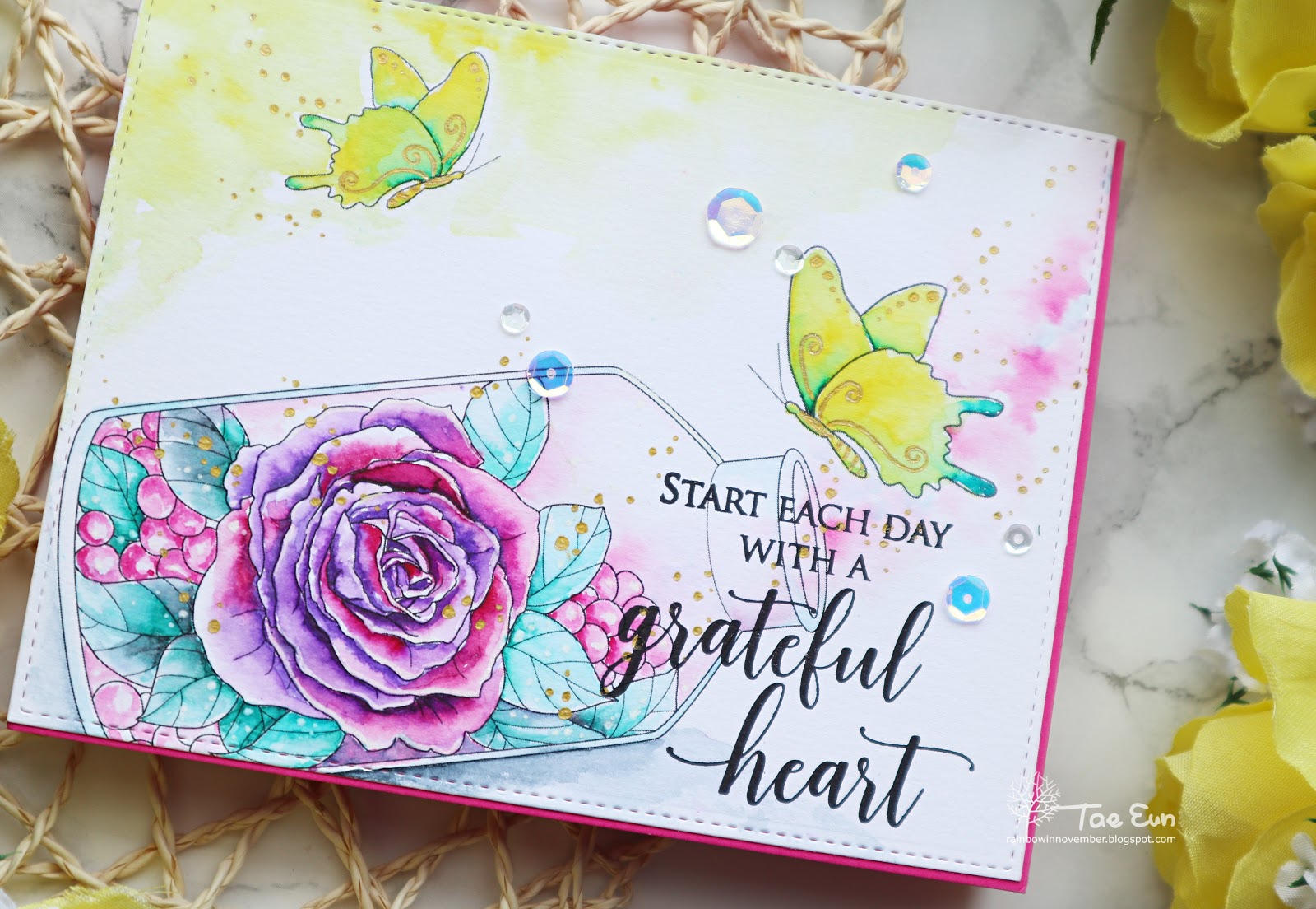 Today I have a couple of cards to share with you. They are featuring EunJi’s new digital stamp set: Bloom Rose. Bloom Rose set contains two gorgeous and unique rose diffuser images, one large rose background and one single rose image. I used the rose diffuser images for today’s cards. You can see EunJi’s beautiful cards using other stamps on her blog!