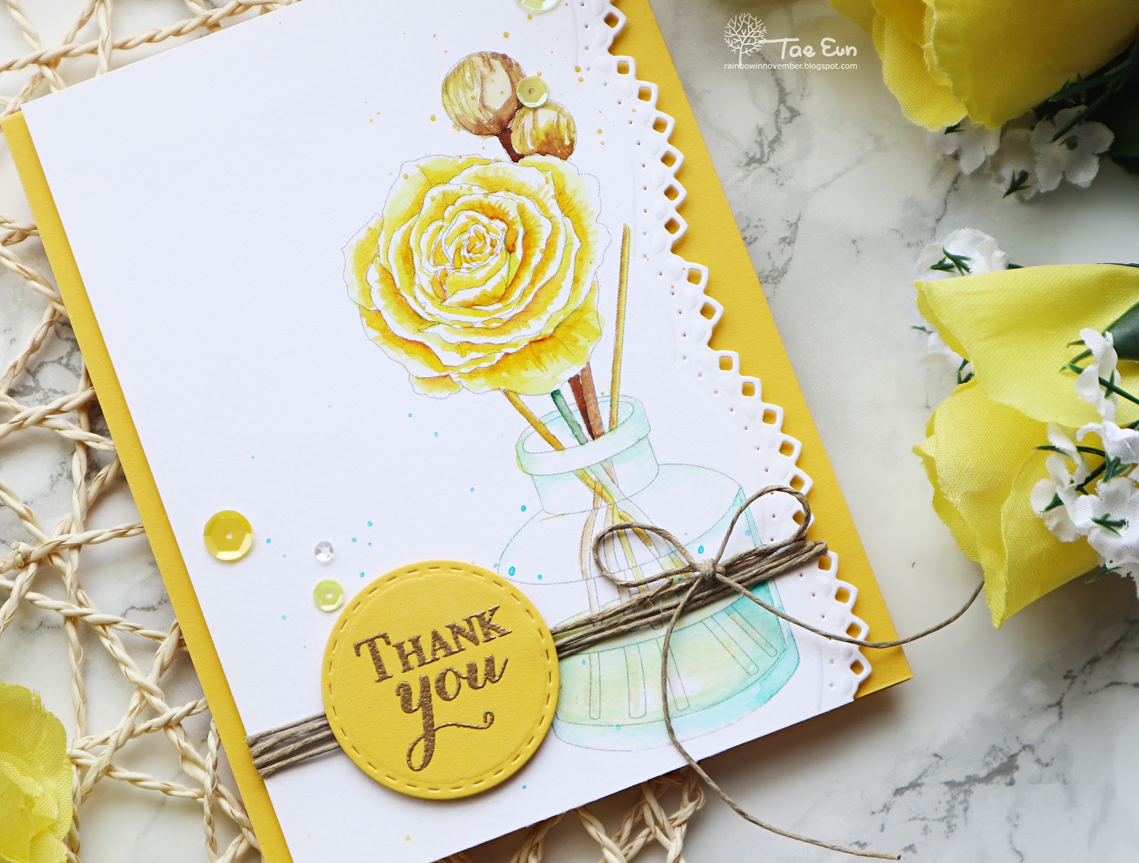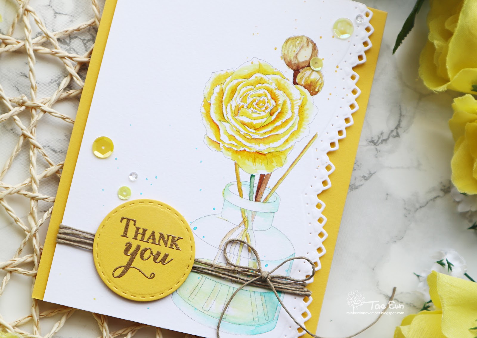 The sentiment from Painted Peonies by The Ton was gold heat embossed on some yellow cardstock, cut with a stitched circle die and added onto the twine. I added some yellow and clear sequins to finish off the card.