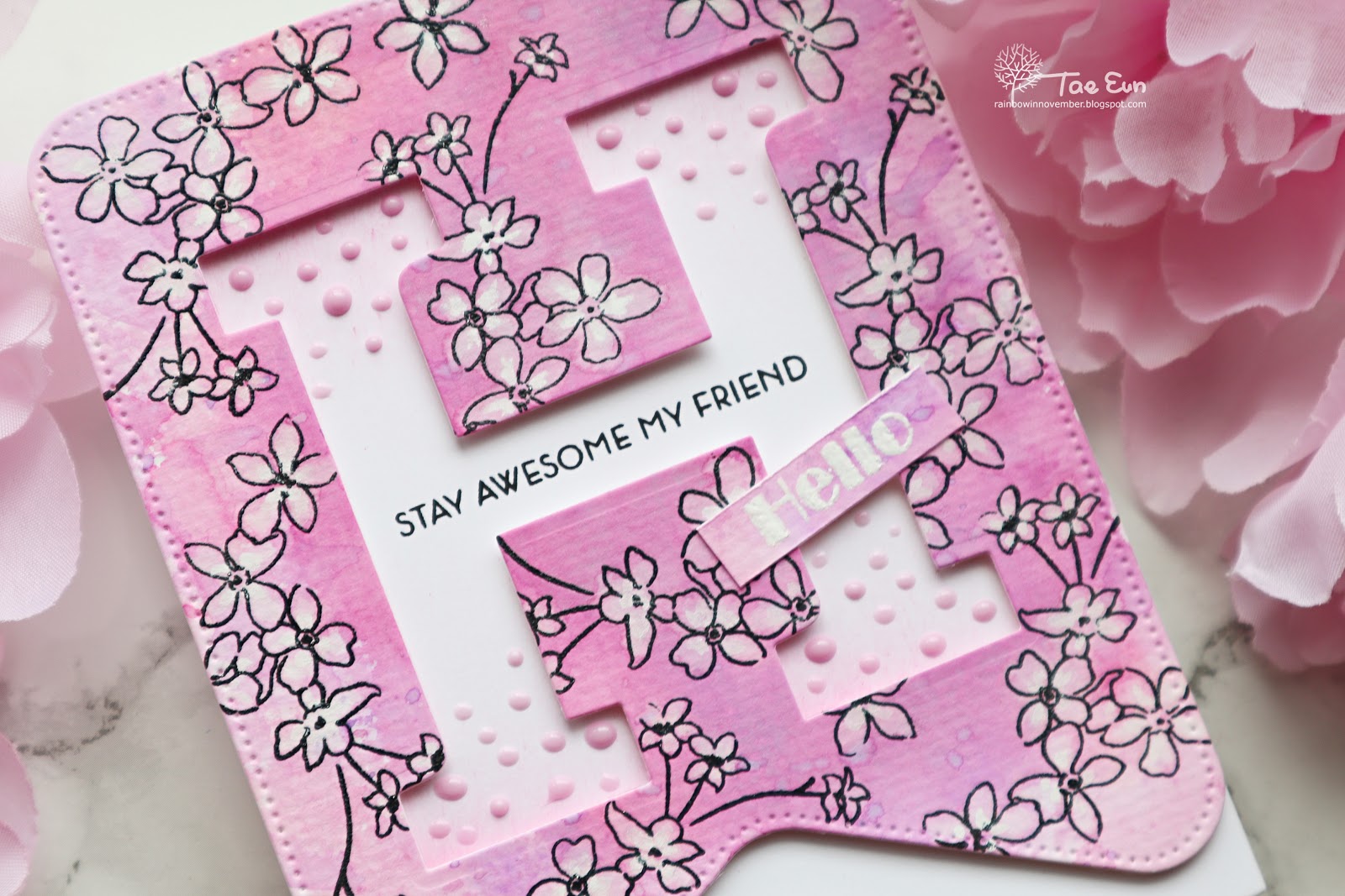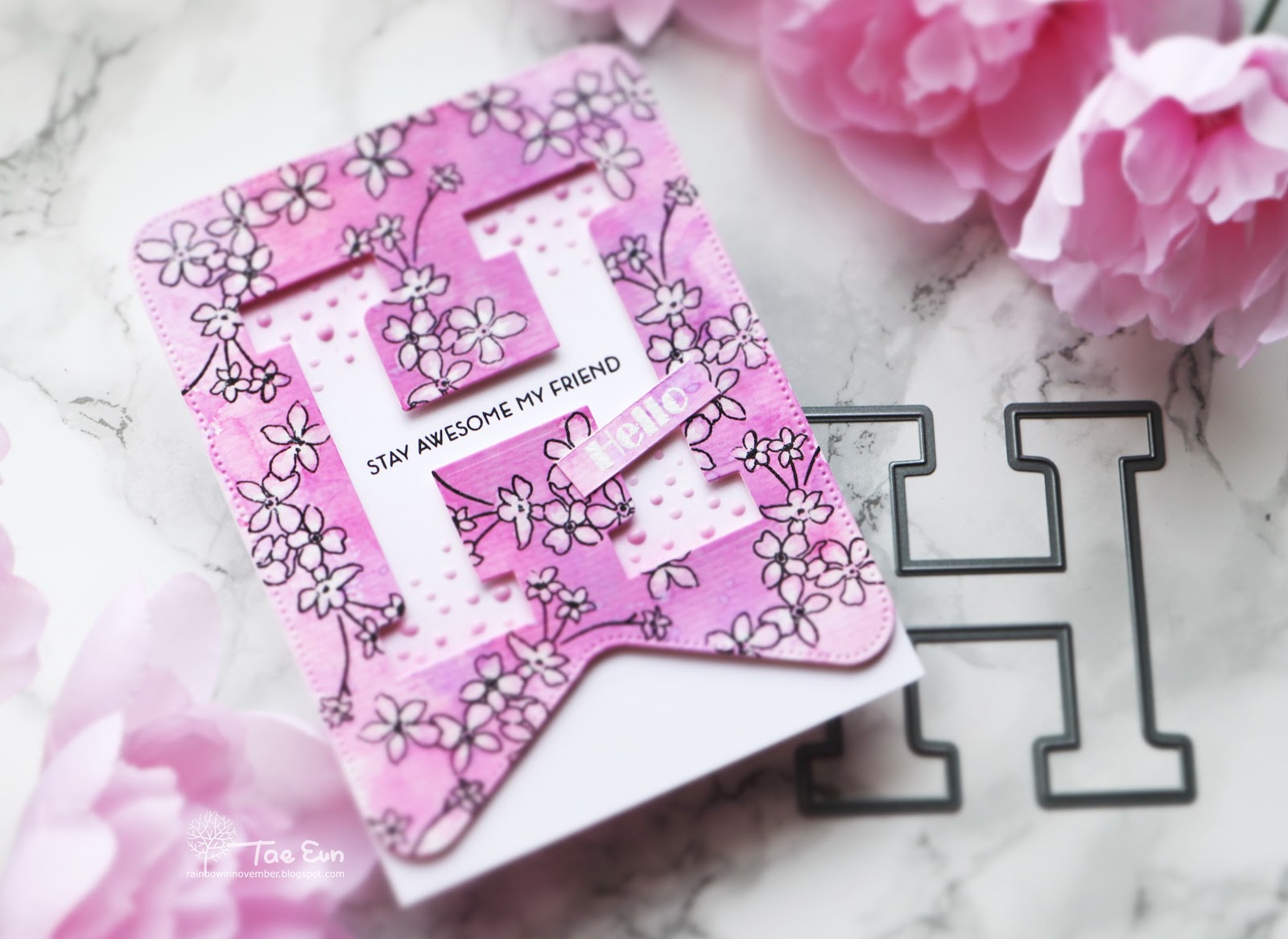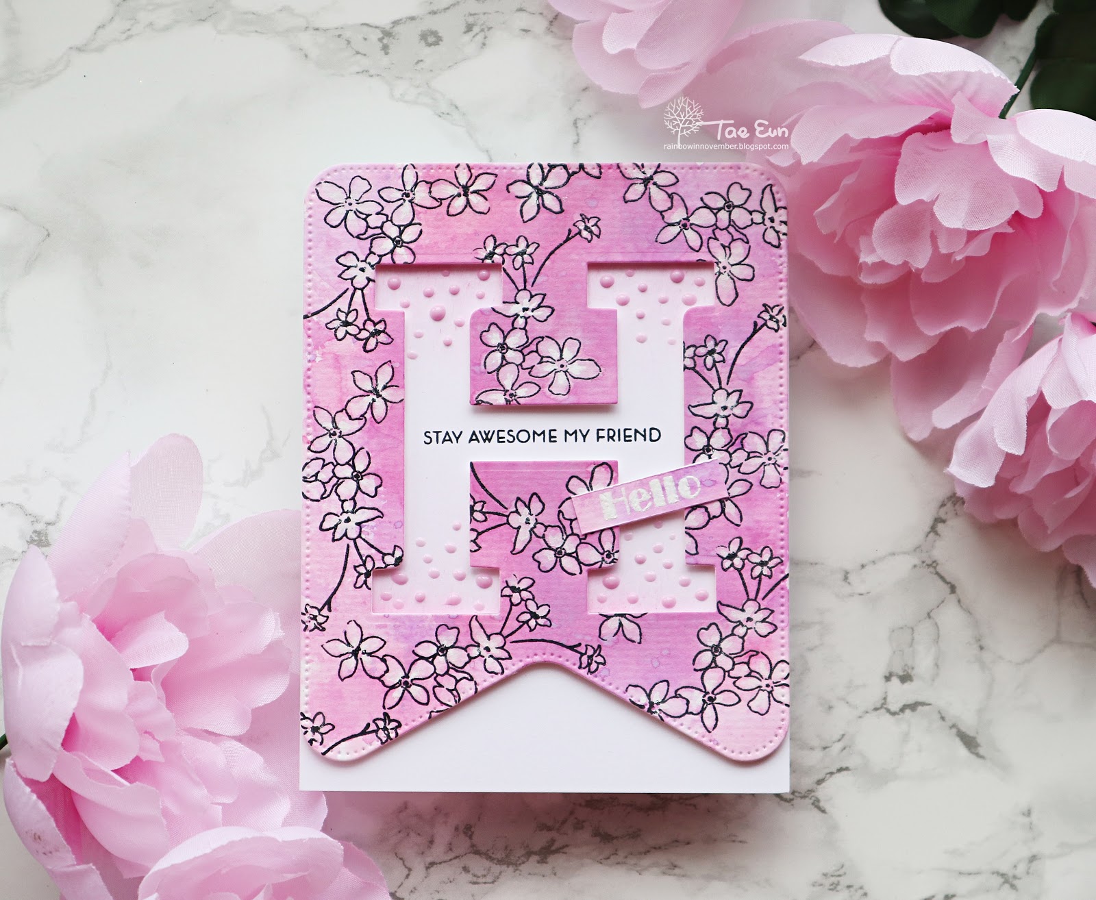 I stated off by creating a pink watercolored panel using pink DOX inks. I then cut the panel using Party Banner die and Mega Alphabet H die. The Party Banner die is 4.25 ” wide and fits perfectly onto a A2 sized card. I stamped the small floral image of Mother’s Love set randomly on the panel to create the DIY background pattern. I used black pigment ink to clear heat emboss the image afterwards.