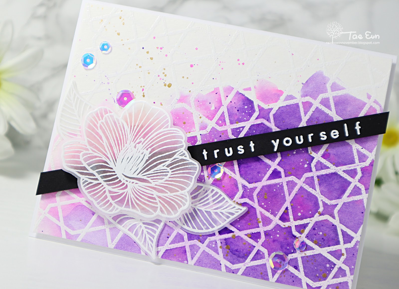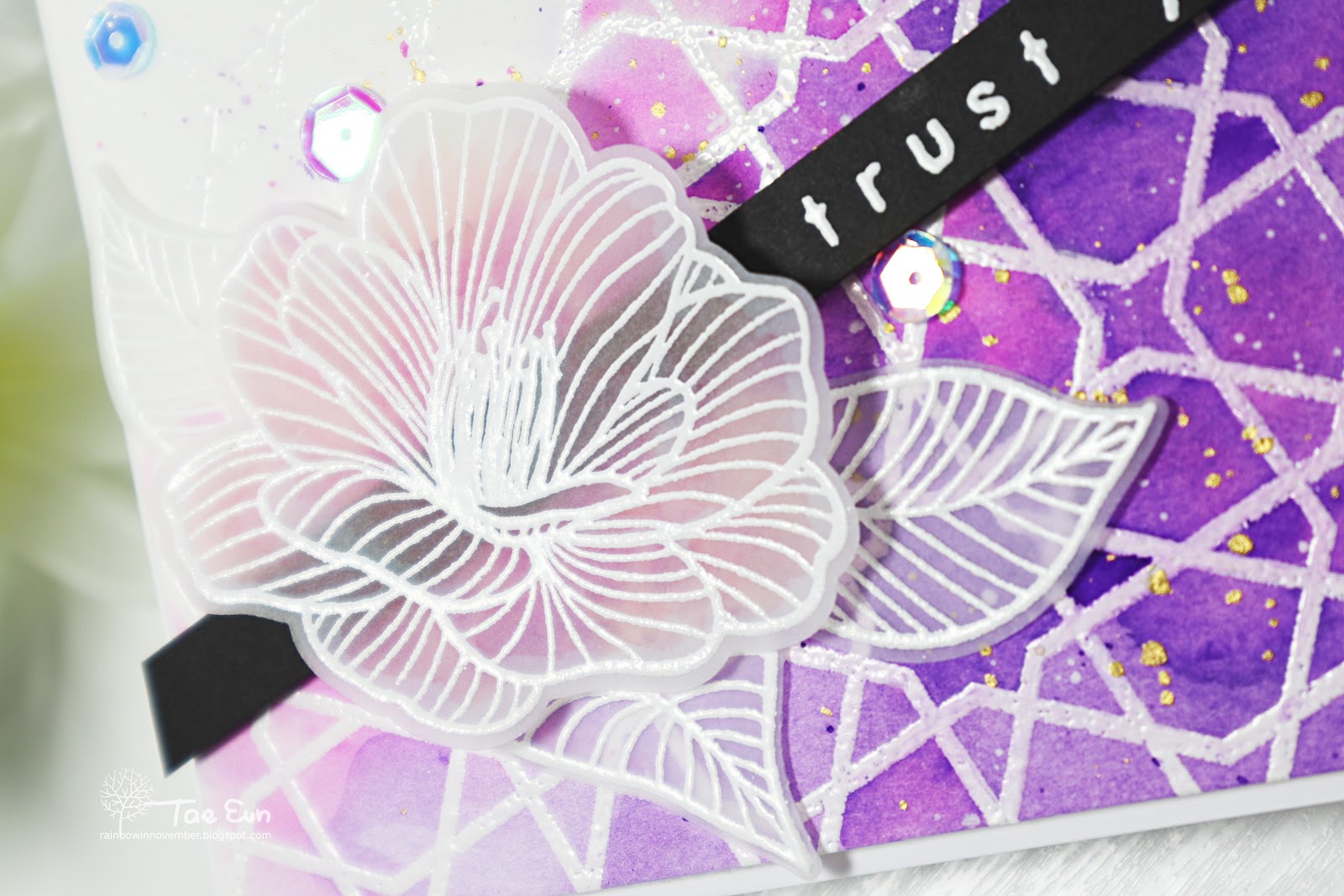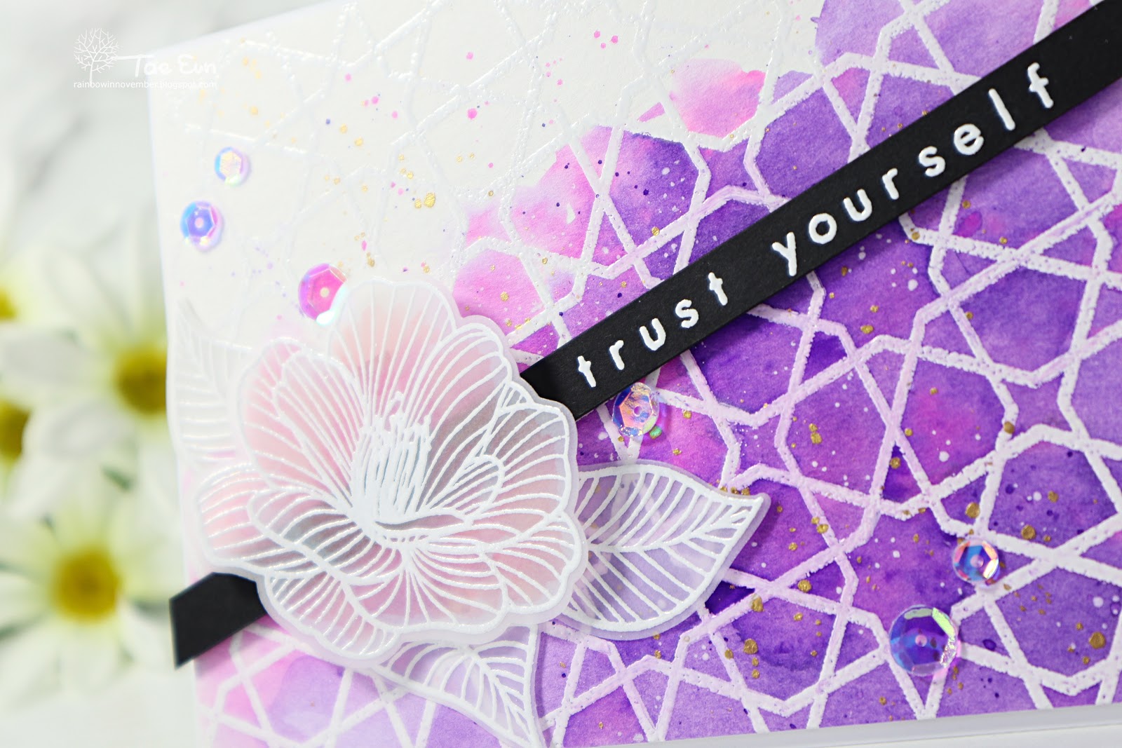First I heat embossed Moroccan Mosaic background on watercolor paper in Pure white crisp EP and colored the panel in purple and pink using liquid watercolor. I then splattered the same ink, gold and white watercolor on the panel and let the panel dry.