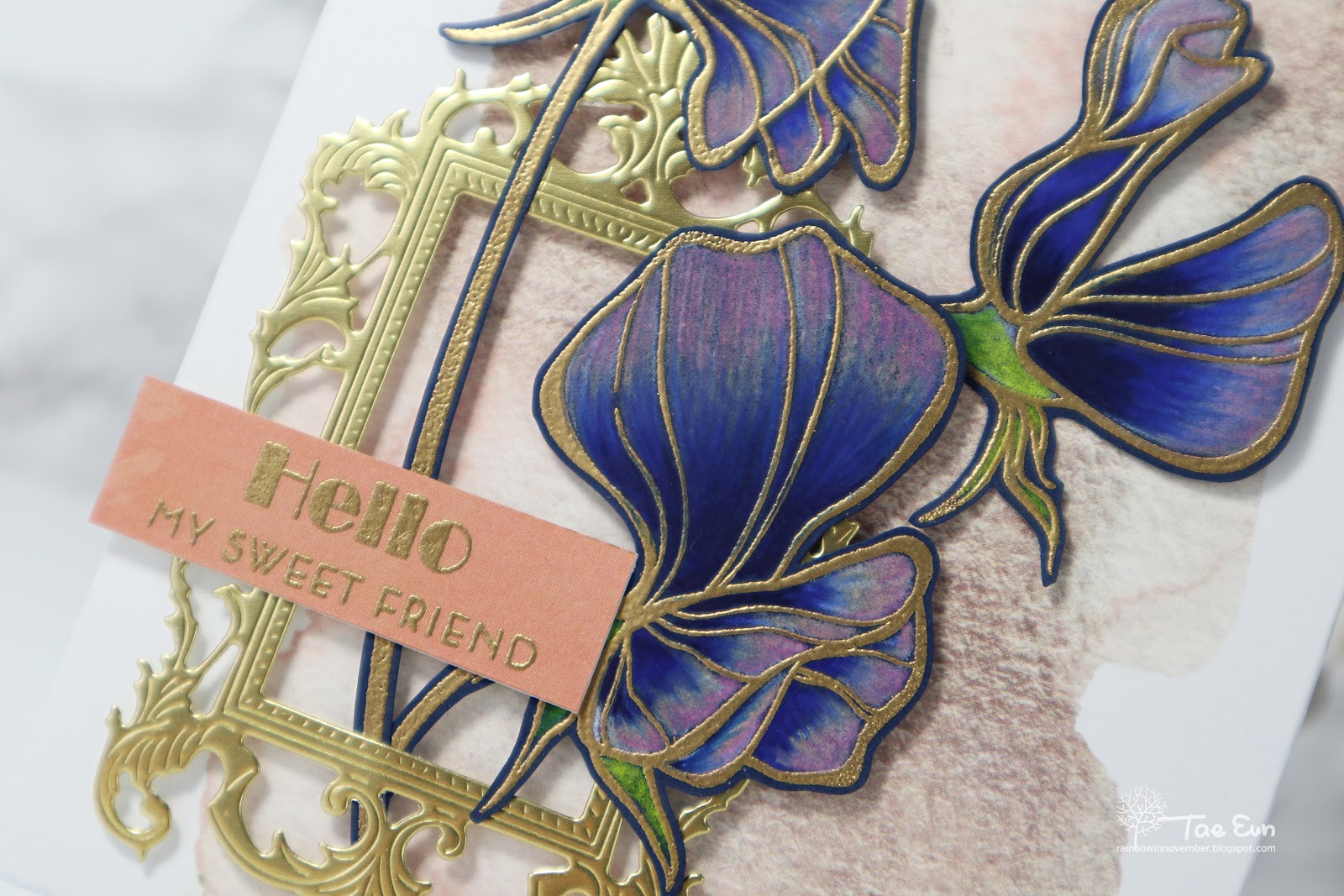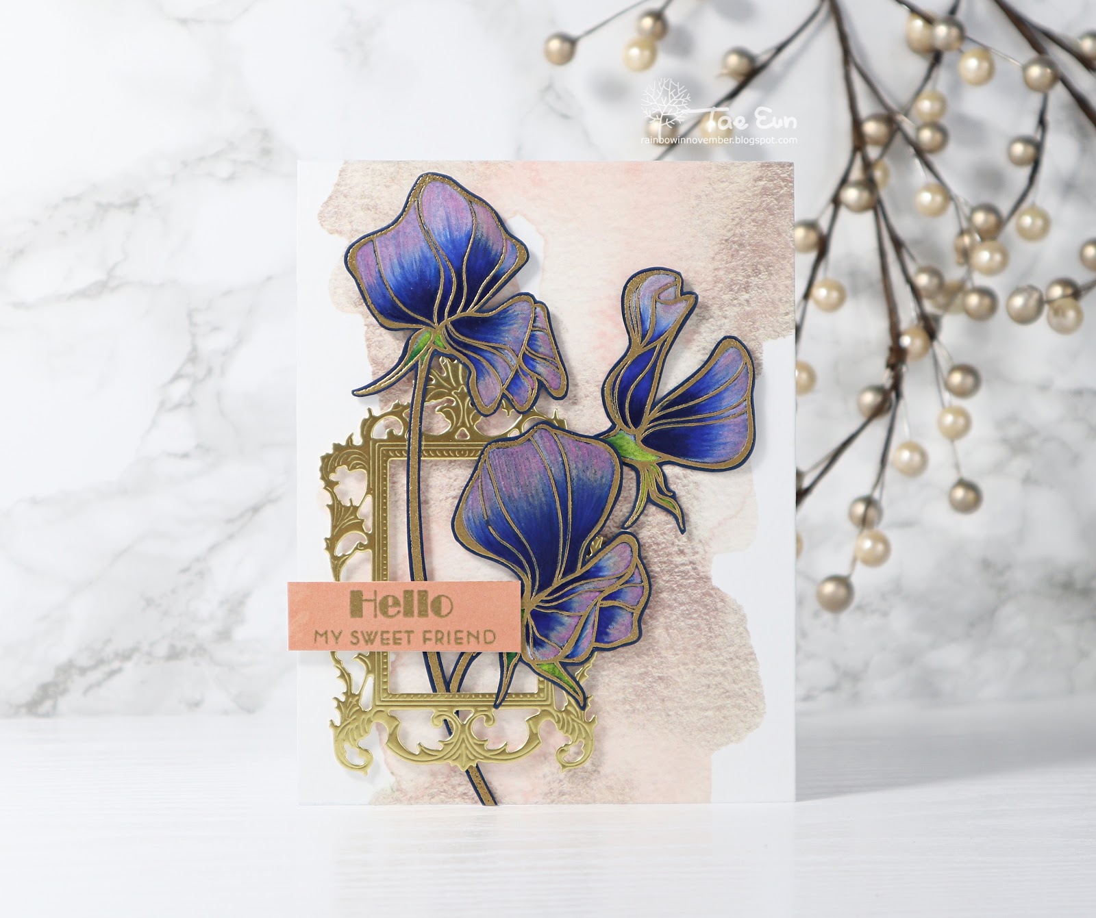 To create the background I simply adhered Peach Gold washi tape on a white cardbase. It was so quick and I’ve got this gorgeous background! The golden frame was cut with the die included in New Day Card Kit. I used the golden cardstock also from New Day Card Kit. I foam mounted the frame and the sweet pea flowers onto the card.