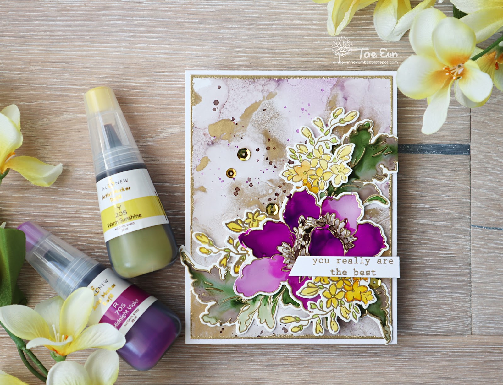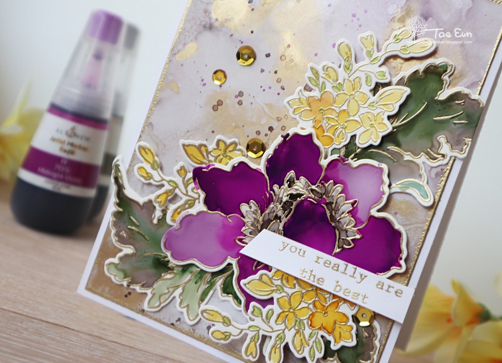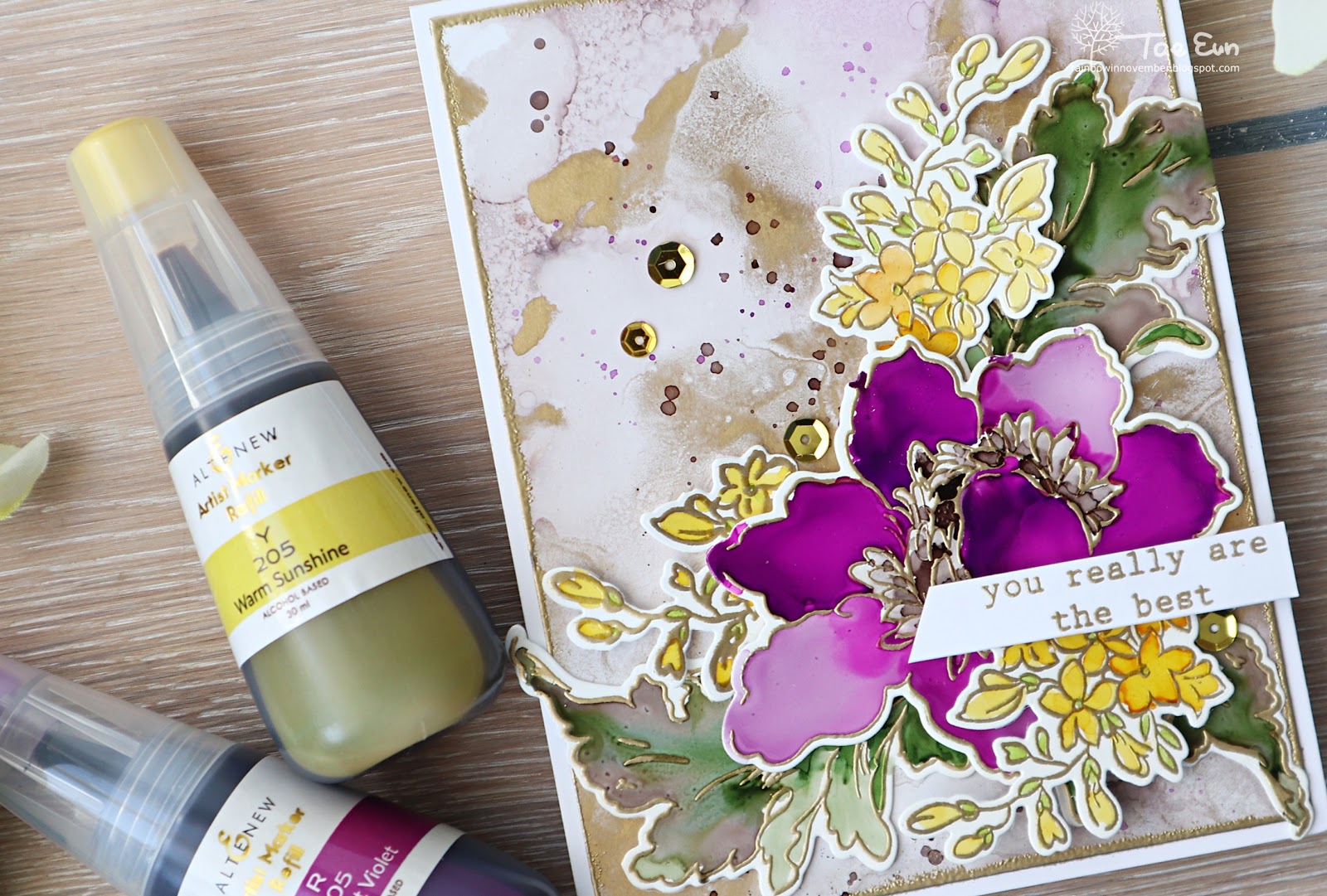 Altenew released Artist Marker Refills for Artist Marker set A, set B and set C. I wanted to apply alcohol ink coloring technique on my image using Artist Marker Refills as alcohol ink. So I chose the big flower from Crown Bloom stamp set to color and Artist Marker Refill set B for a color scheme of purple, yellow and gold.