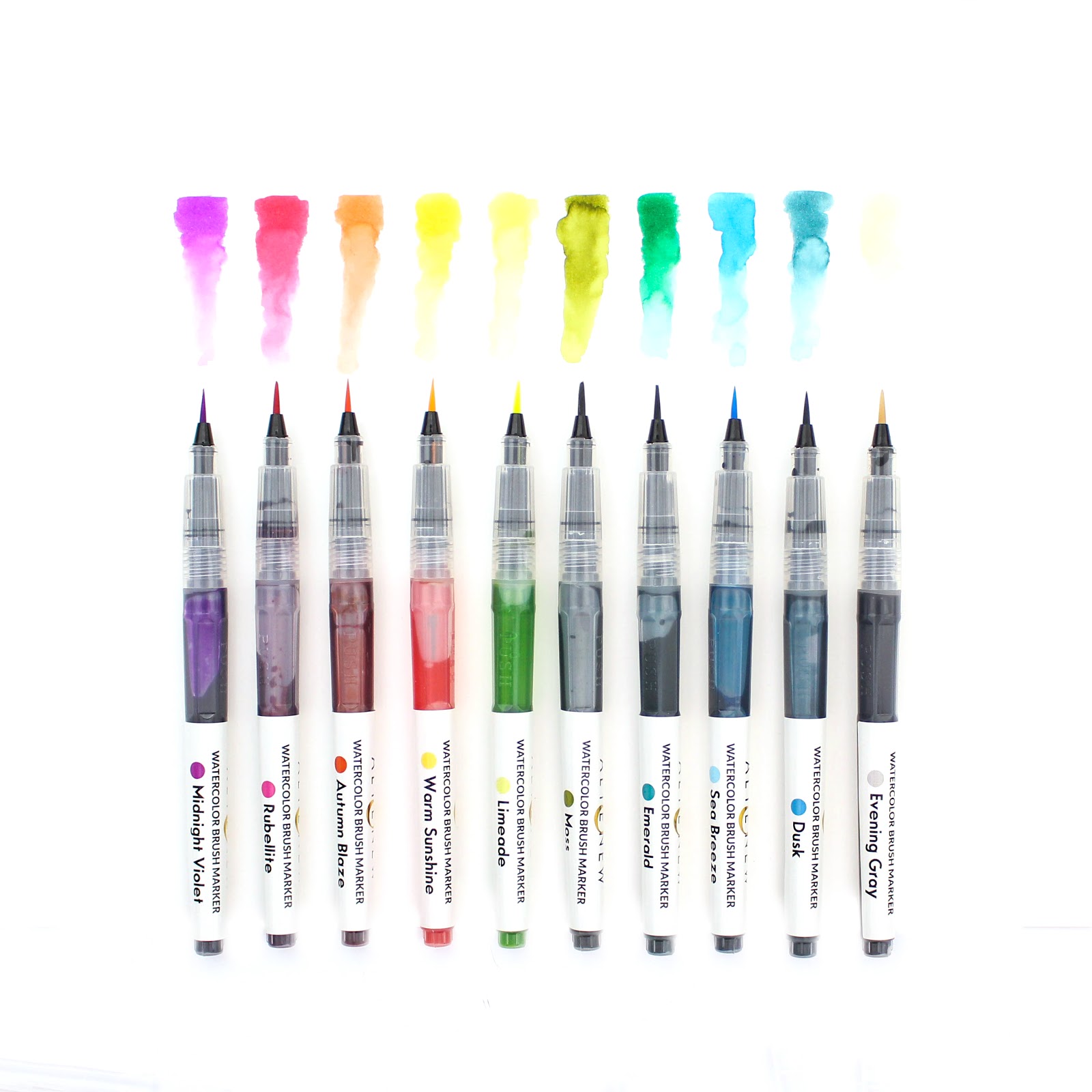 Create stunning works of art with our Watercolor Brush Markers! The barrel is filled with water-based color, and coordinates with our line of inks. The flexible, yet sturdy bristles on the brush tip allow you to form both broad and fine strokes. Color can be applied straight from the marker, or diluted with water for a softer look.