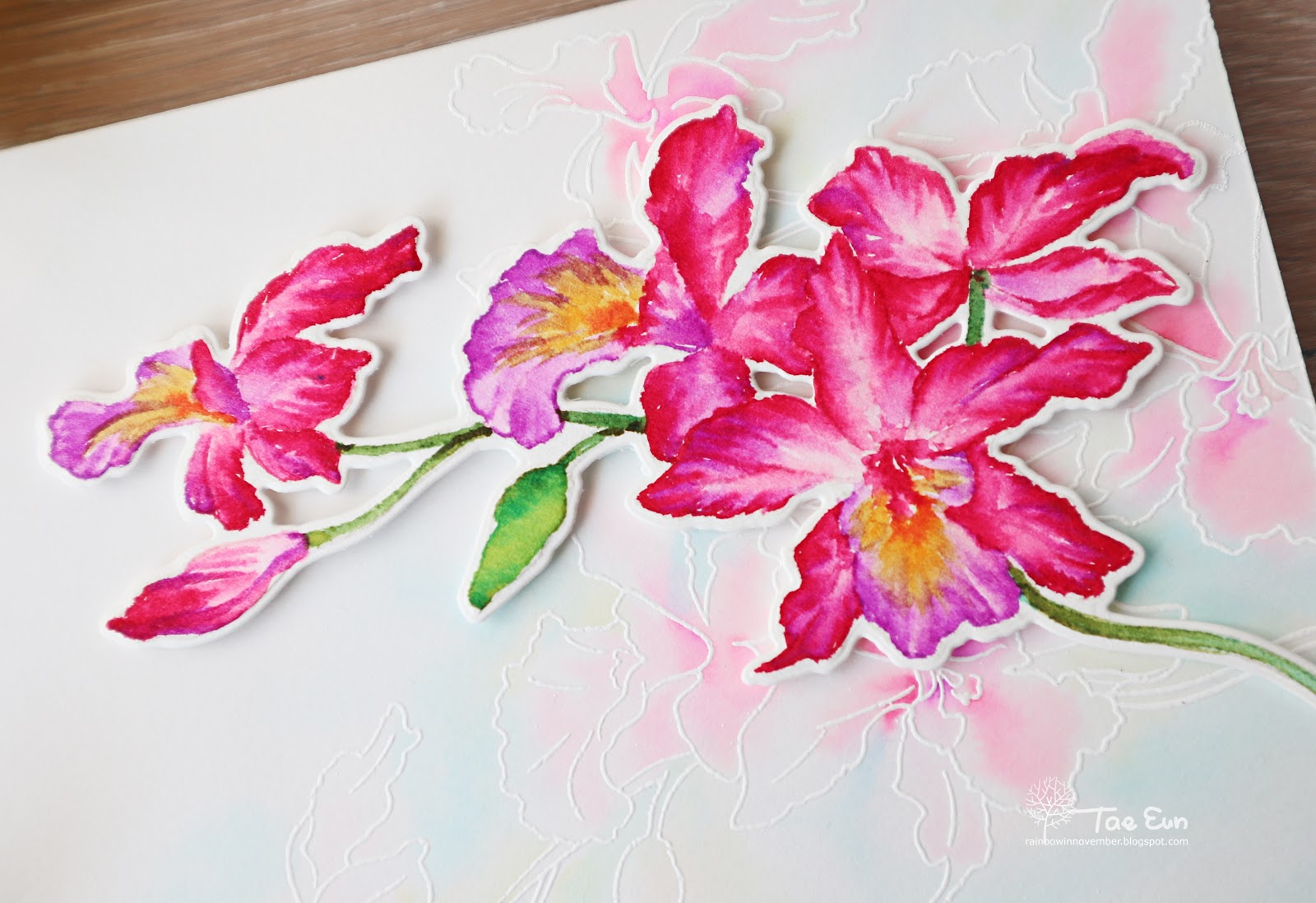 To create the background I white heat embossed the BAF: Cattleya on a watercolor paper panel. I added lots of water onto the panel before I applied Rubellite, Midnight Violet, Sea Breeze and Limeade on it. After the panel was dry I stamped the sentiment from BAF: Camellia in Midnight Violet. I assembled the card together by foam mounting the colored and cut Cattleya onto the background panel.