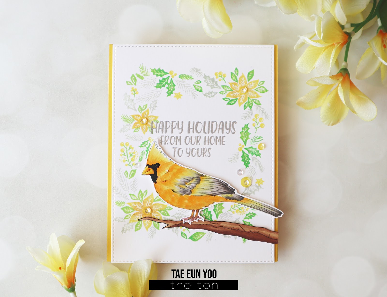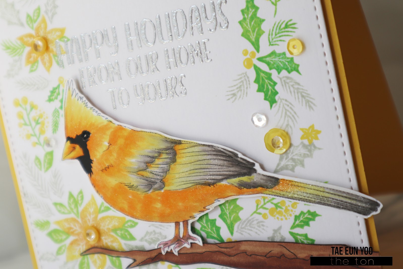The yellow cardinal from Cardinal Friends was colored using yellow and warm gray Copics. I fussy cut the cardinal and the branch and foam mounted them onto the card. To finish off I scattered some sequins from Lemon Chiffon, Glass Slippers sequins and New Year Couture Mix.