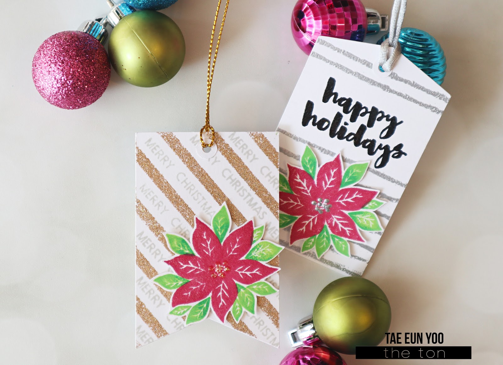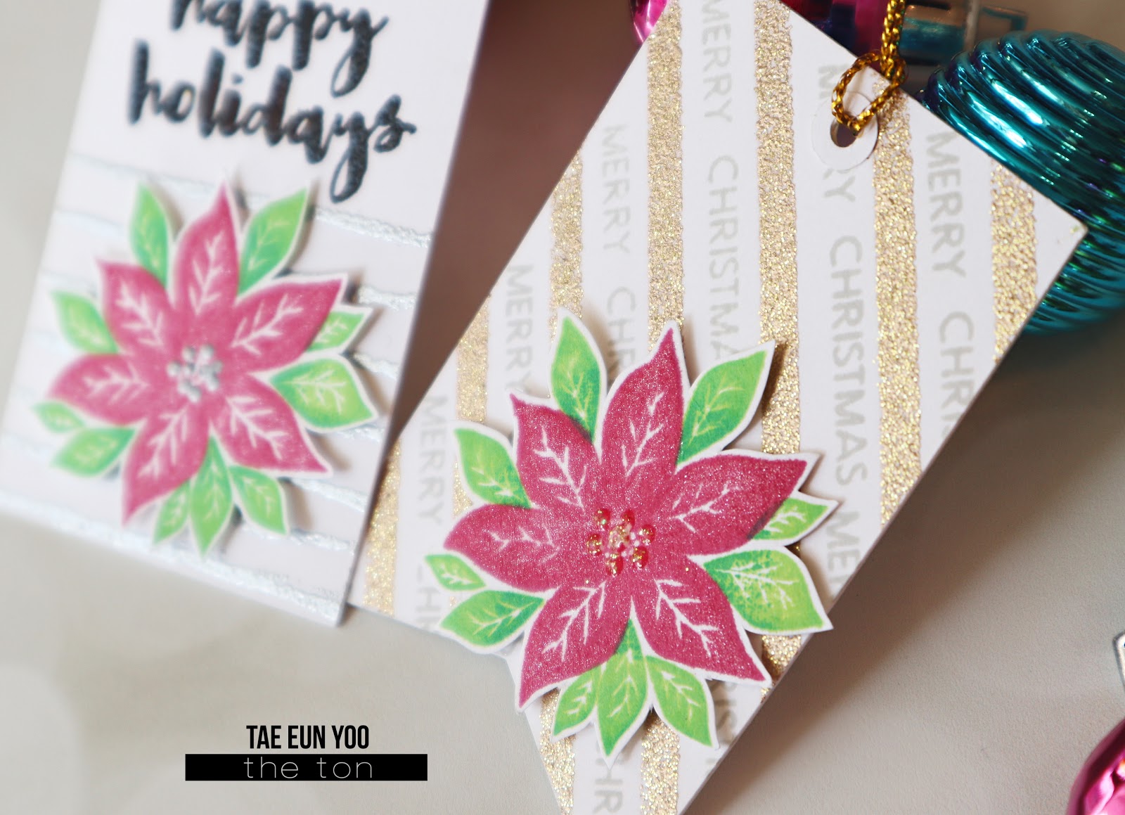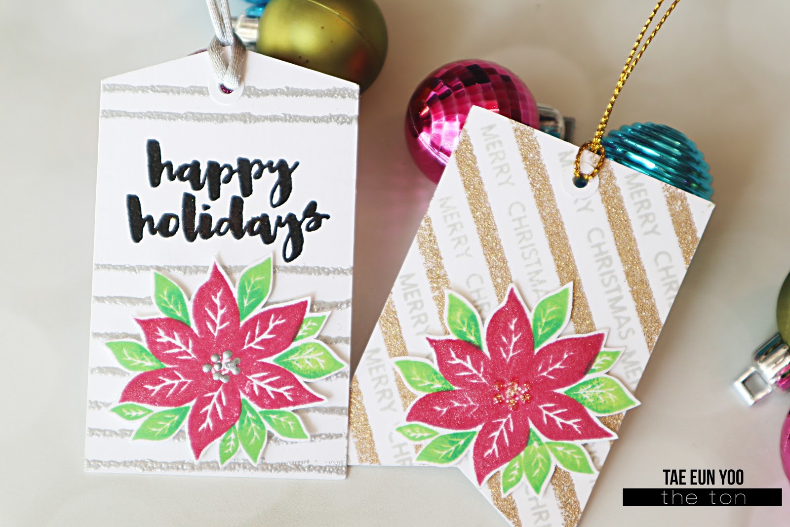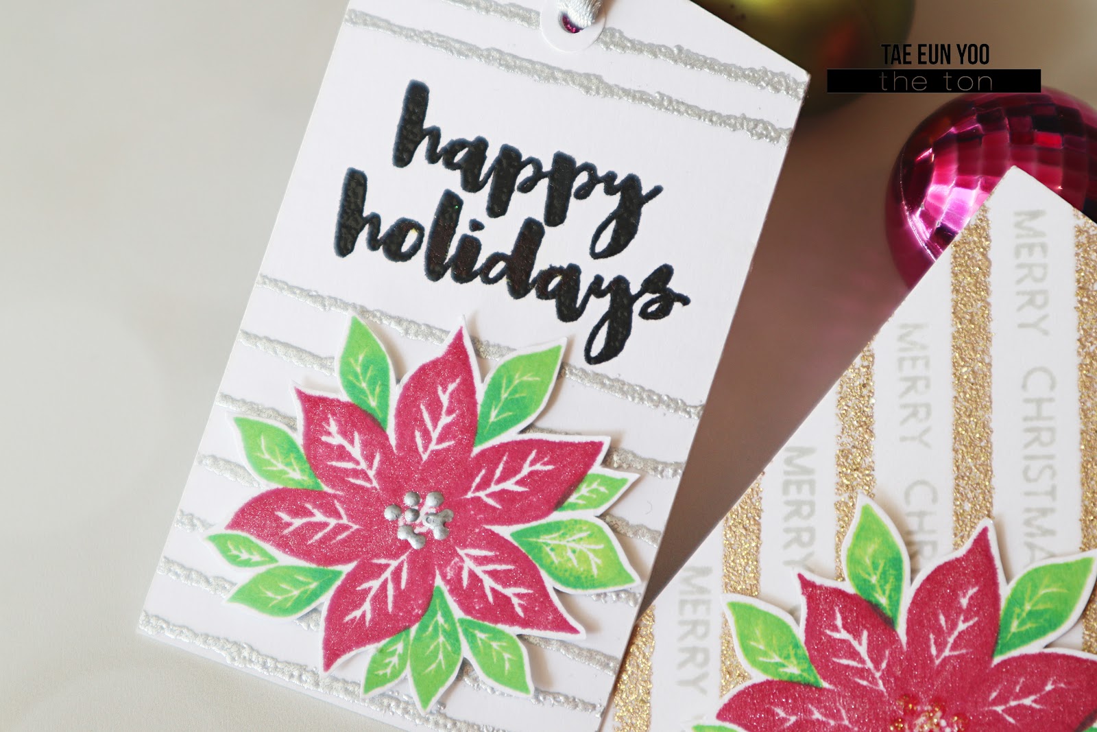 For this tag I stamped the sentiment from Holiday Chic Tags in Noir and clear heat embossed. The silver heat embossed line pattern is also from Holiday Chic Tags set. I covered the poinsettias with a coat of clear glitter and foam mounted them on the tags.