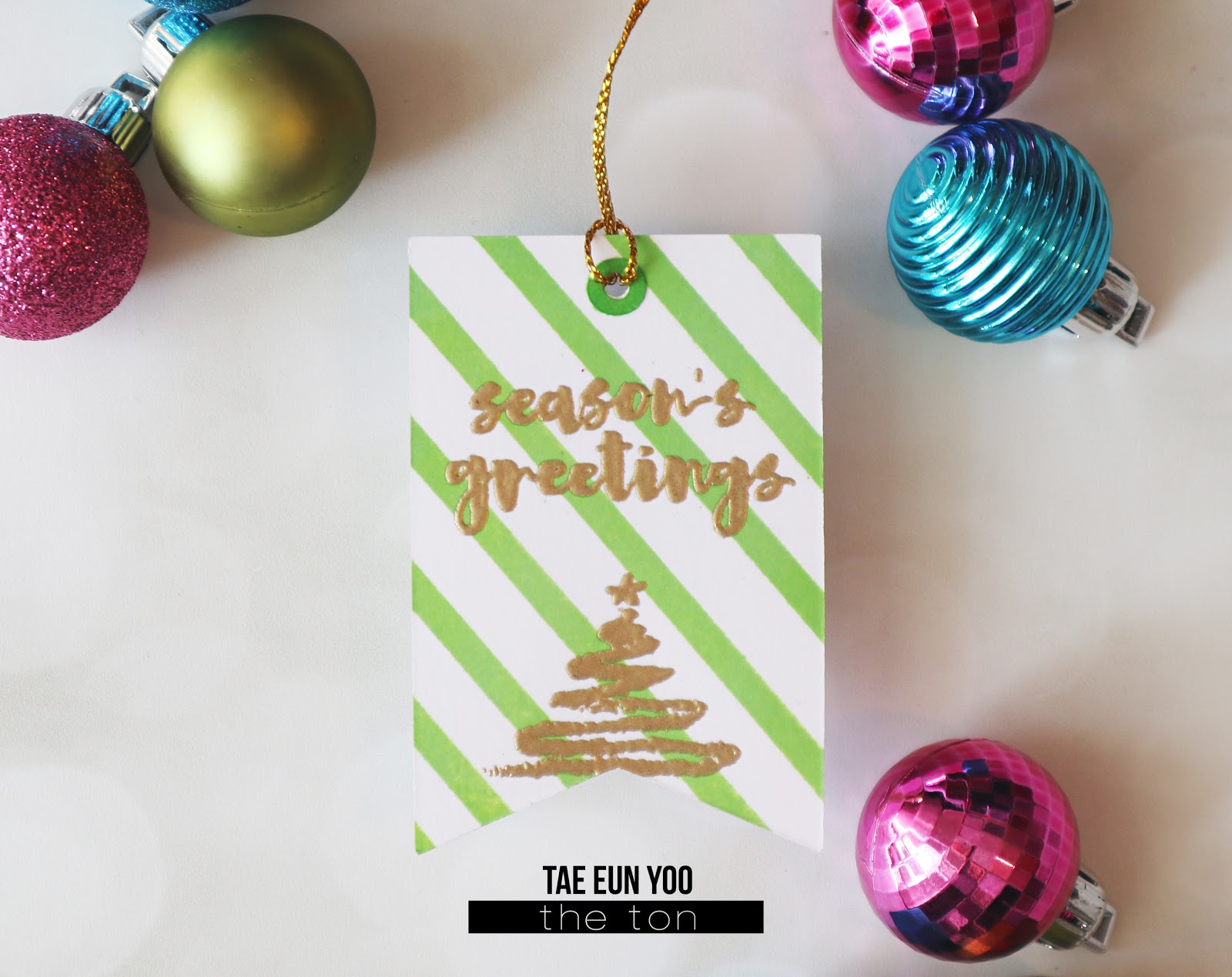 Here I heat embossed the diagonal stripes in gold tinsel and stamped the sentiment from Banners-Holiday Add On repeatedly between the lines.