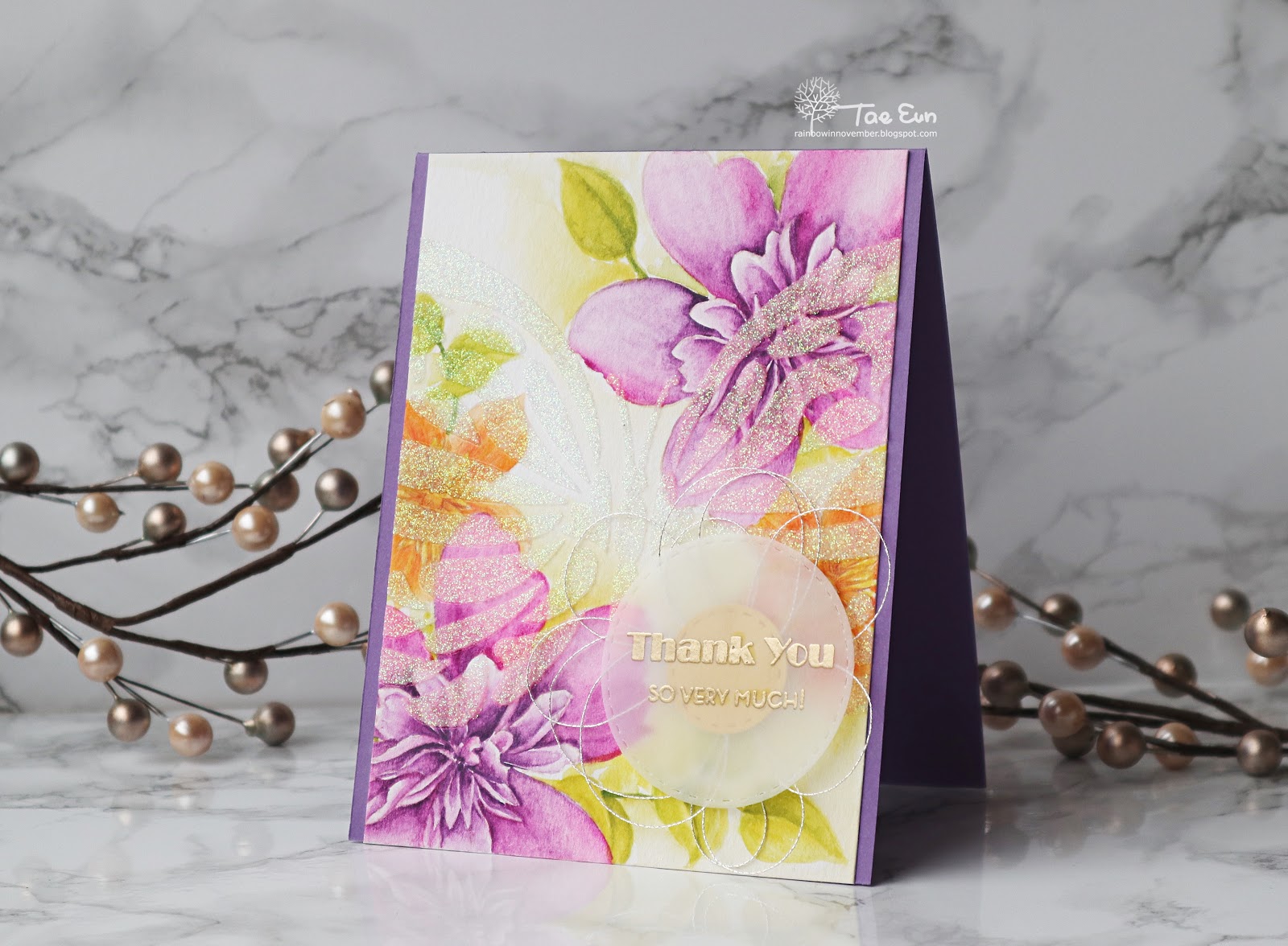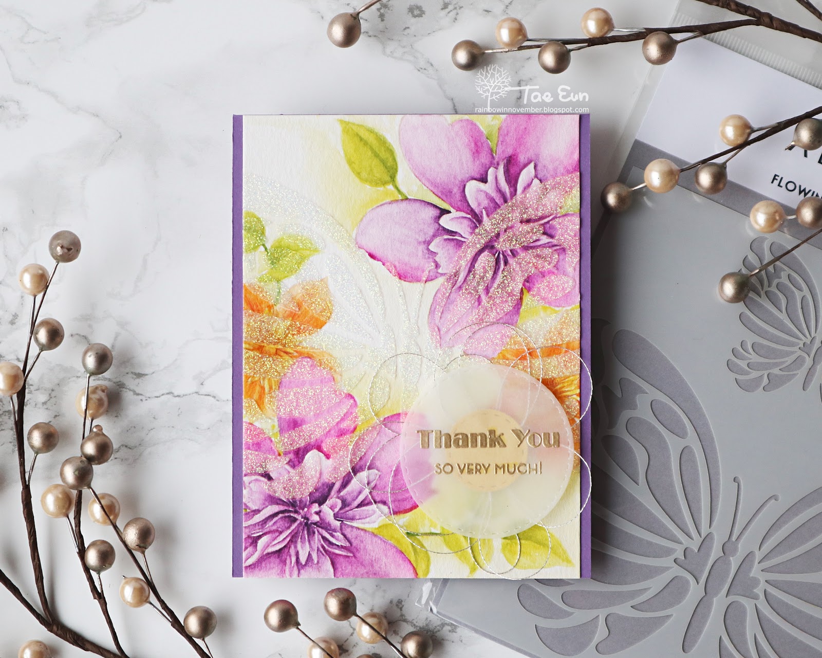 On my second card I embellished an watercolored panel using Flowing Butterfly stencil and a clear glitter embossing paste.