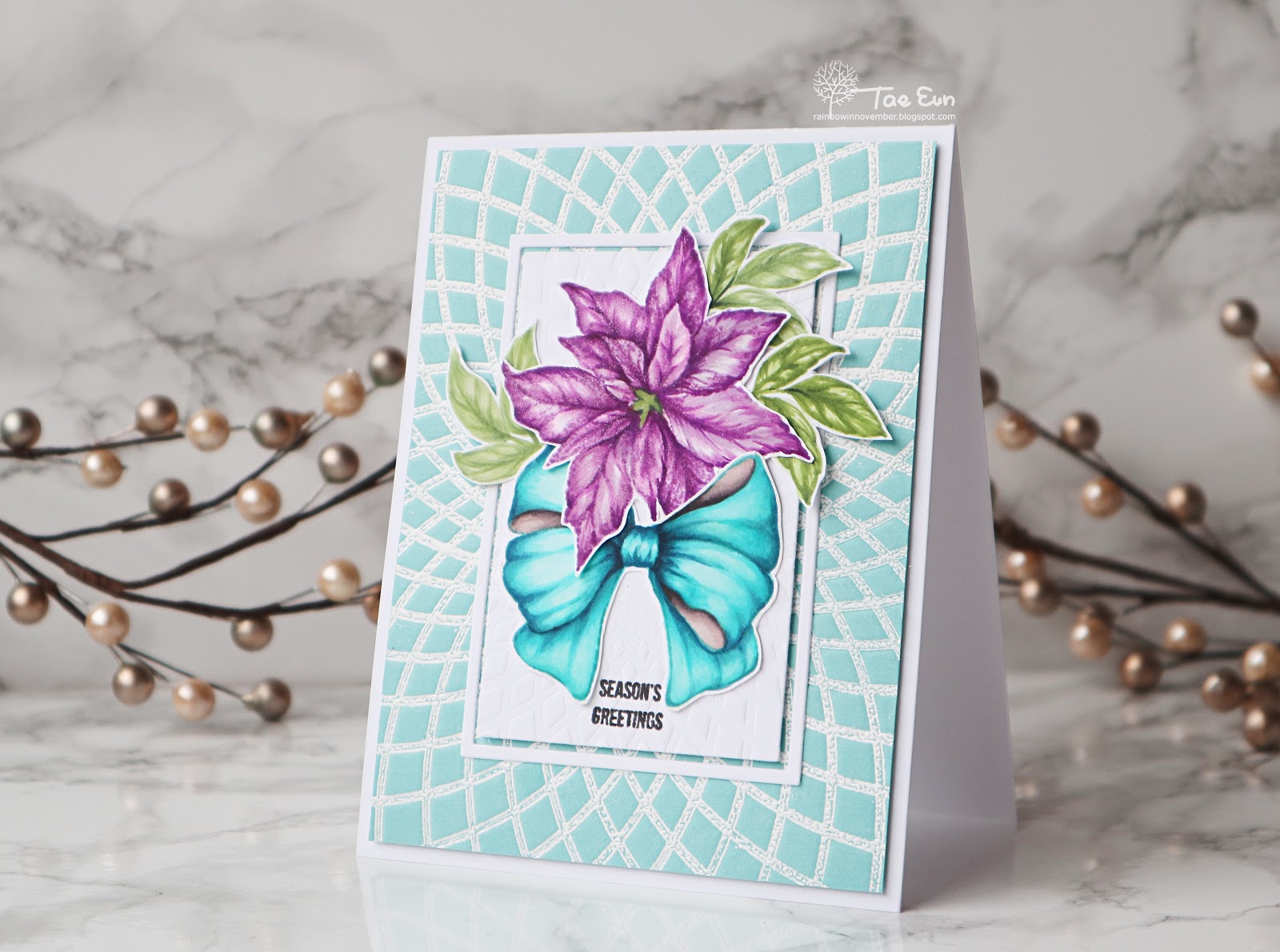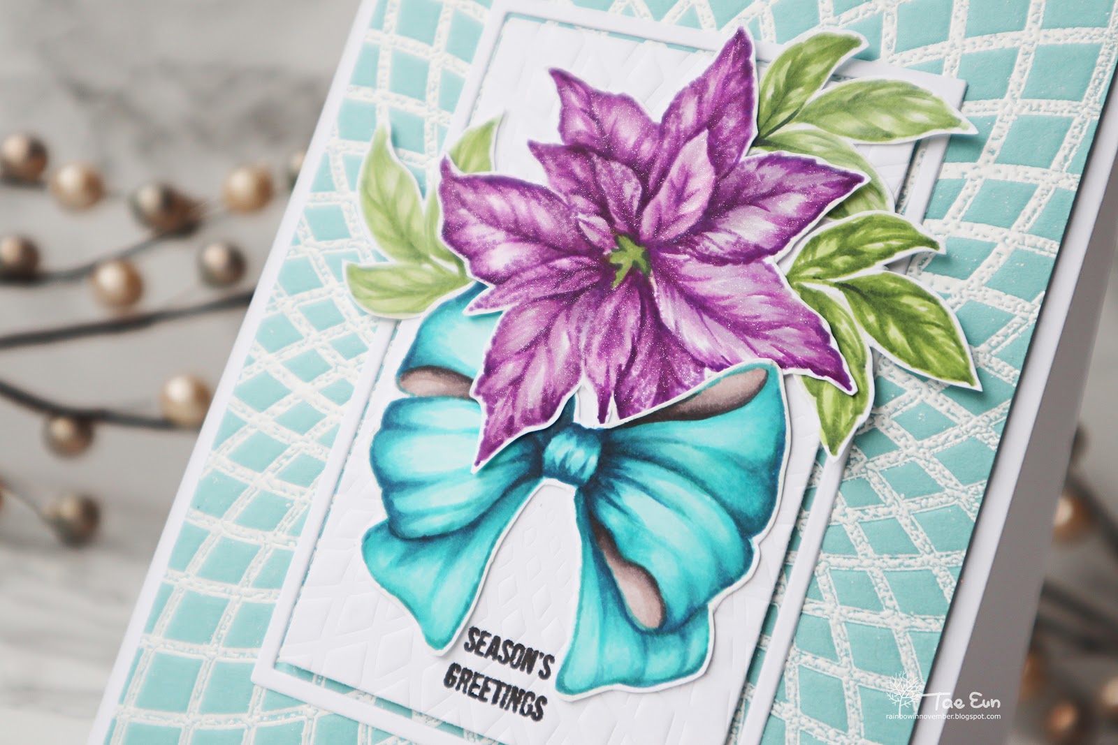 I then started coloring the poinsettia and the bow from Holiday Bow set. I stamped the bow in Lagoon, the poinsettia in Midnight Violet and the leaves in Frayed Leaf mini inks to do some no line coloring. I colored them with Altenew Artist Markers and fussy cut them all.