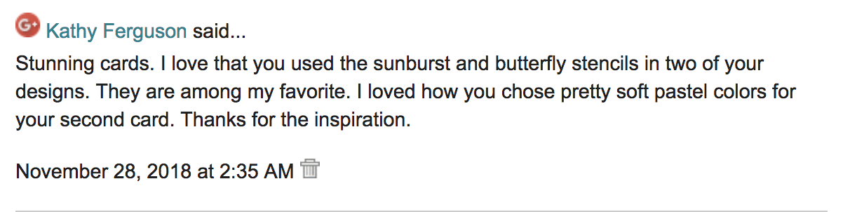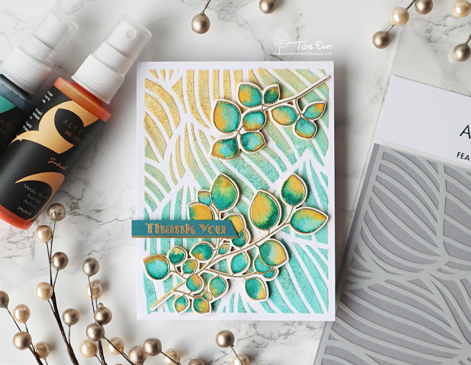 Altenew November 2018 Stencil and Ink Spray Release includes 9 new unique stencil designs and 6 new metallic shimmer ink spray colors. I’ve had the pleasure to play with three new stencils and 2 gorgeous ink sprays and made three cards showcasing Sunburst, Flowing Butterfly and Feathered Leaves stencil.