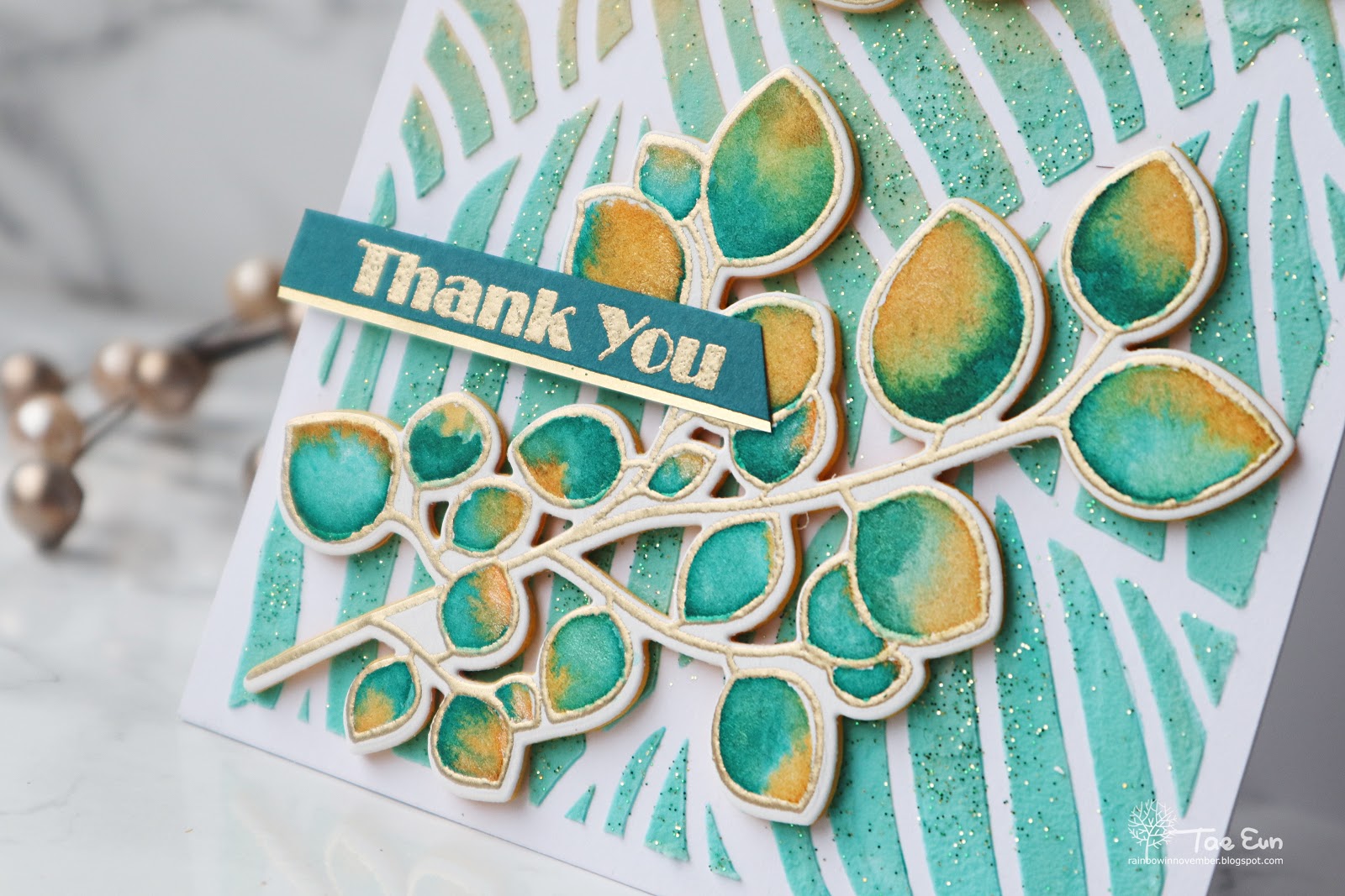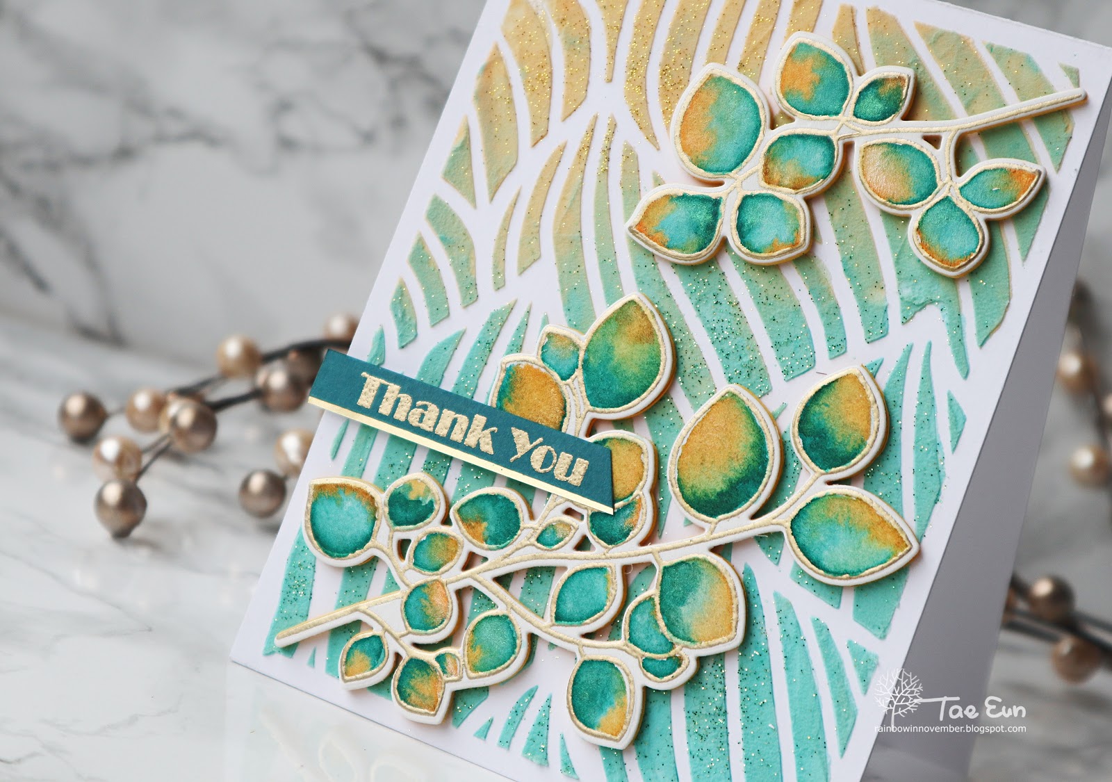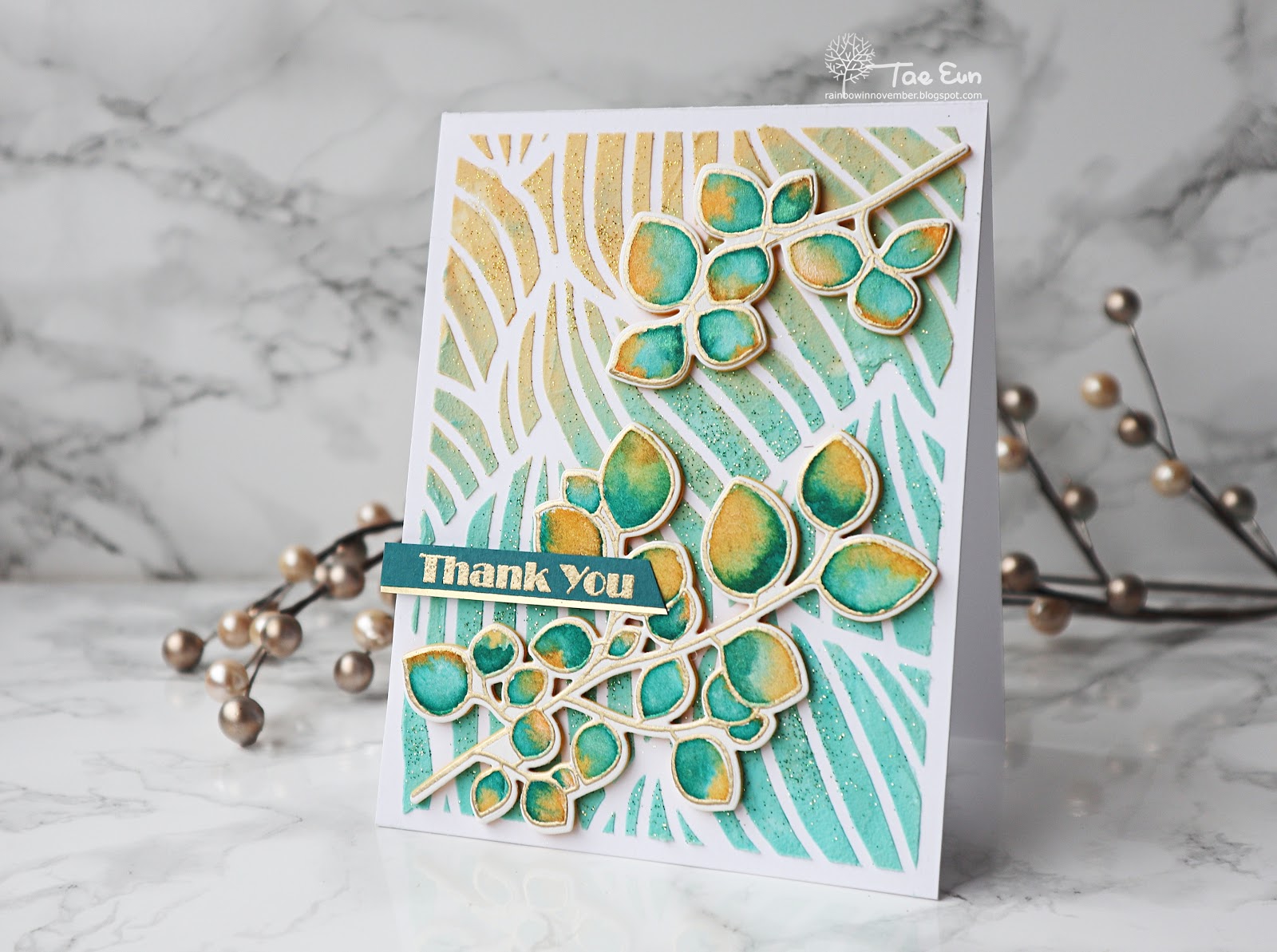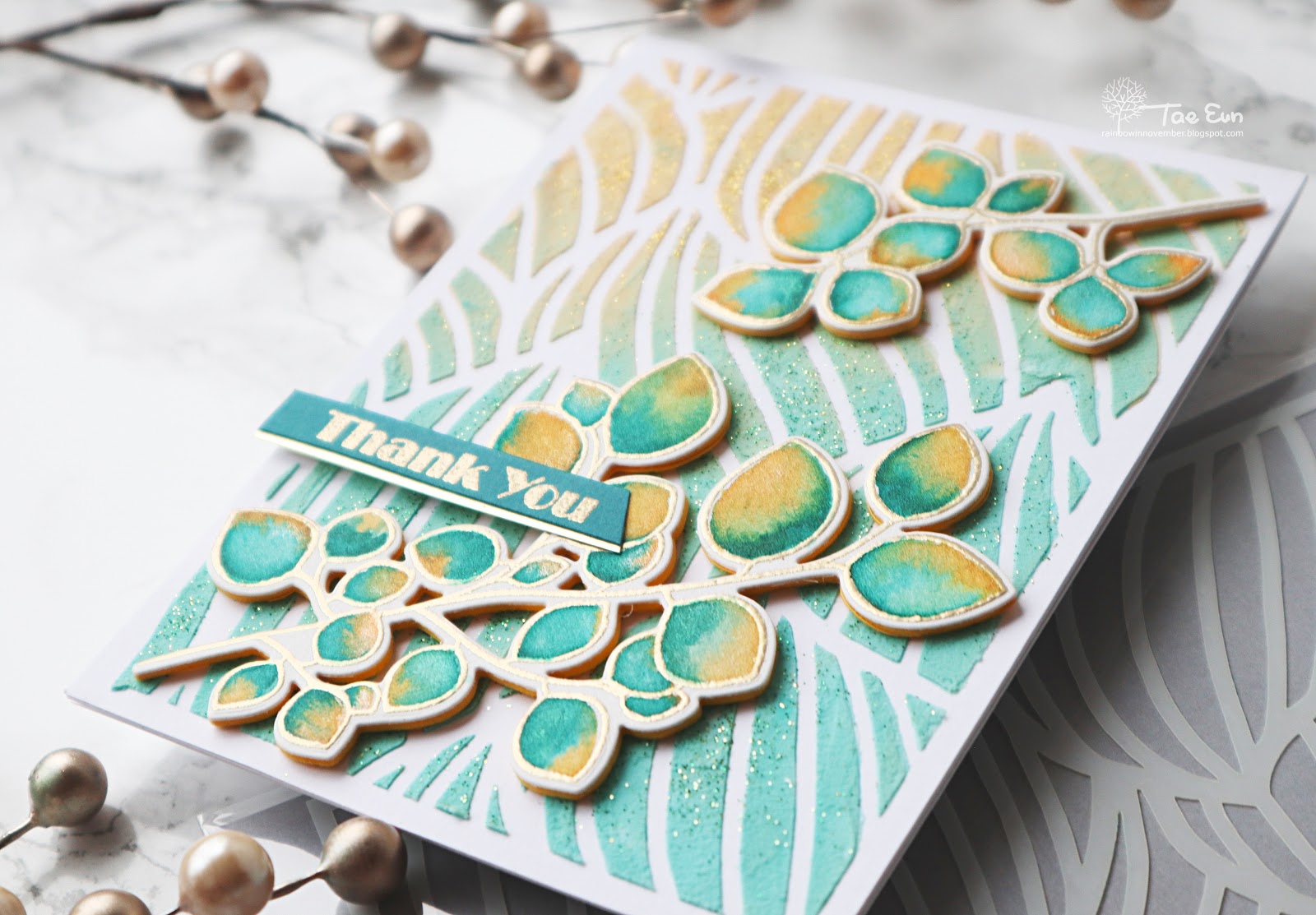 I gold heat embossed the branches from Leaf Canopy on some watercolor paper and colored them using Lagoon and Sunkissed metallic shimmer spray. I then cut them using the coordinating die and set them aside. The shimmer of these sprays is just gorgeous! The photos don’t do justice to these beautiful colors and shimmer!