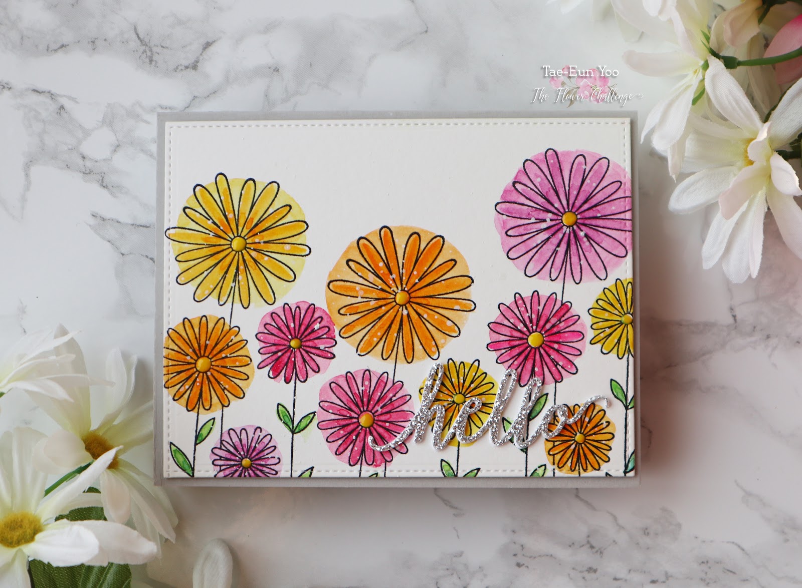 I stamped the Daisies three times in black pigment ink and clear heat embossed the images. I watercolored them in a loose way and splattered opaque white ink over the whole panel.