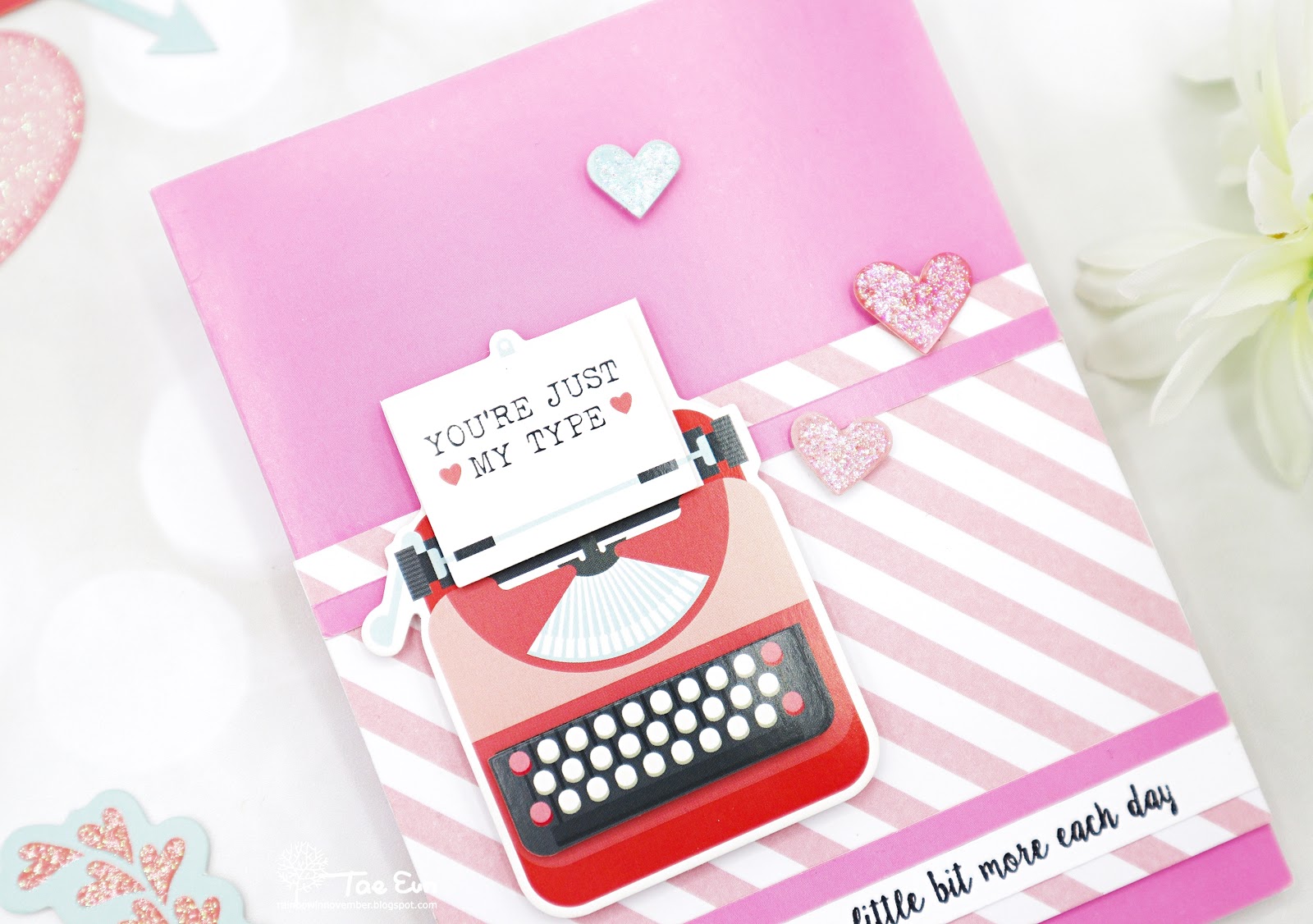 It was a super quick and easy card again. I cut the striped patterned paper, backed it with some white cardstock and foam mounted it on the pink cardbase from the kit. I added two strips of pink cardstock along with the sentiment strip. The sentiment is from You’re My Type clear stamp set of the kit. I stamped it in a black pigment ink and clear heat embossed it. I then foam mounted the typewriter and three 3D hearts. For more shine I covered the hearts with glittery Stickles.