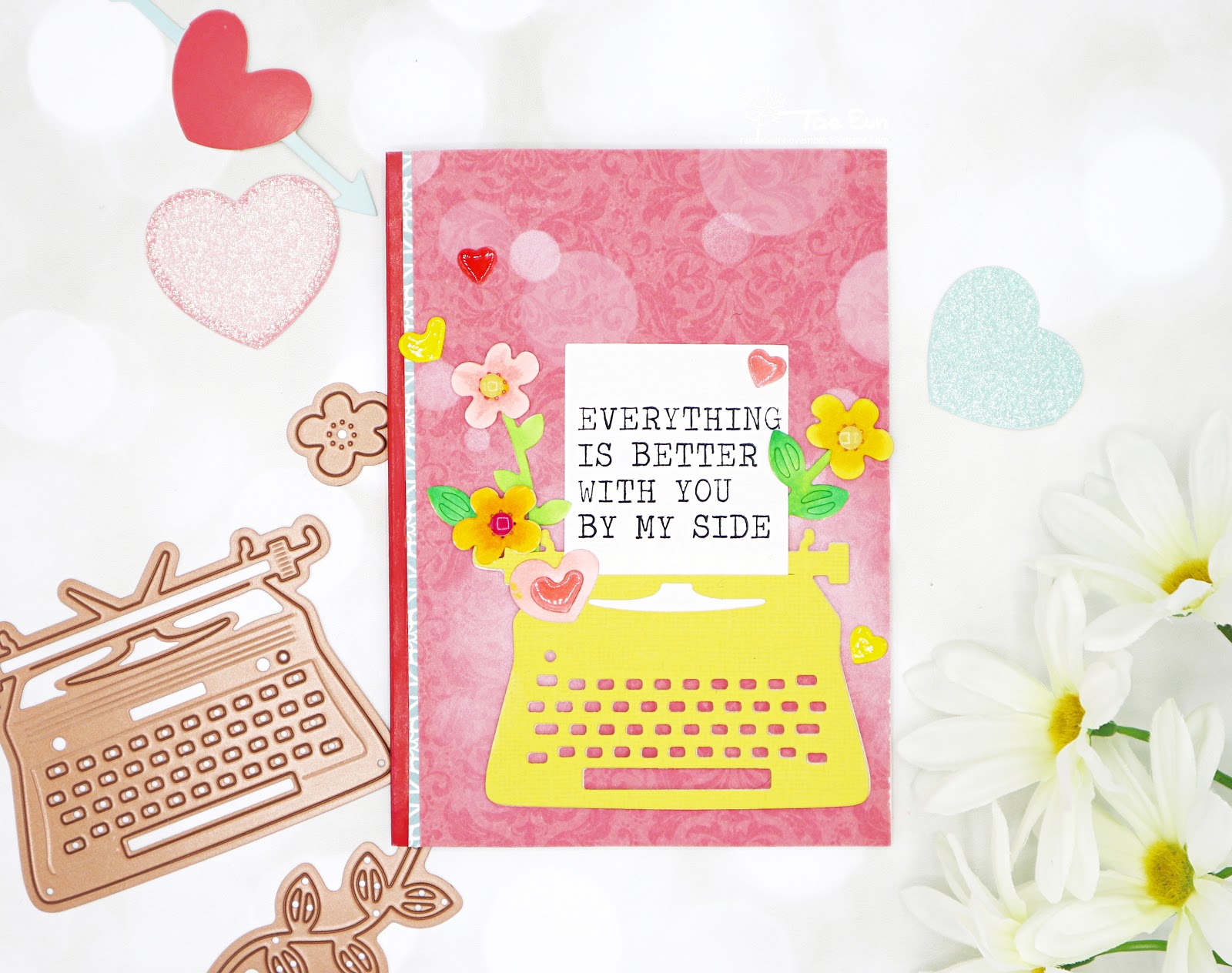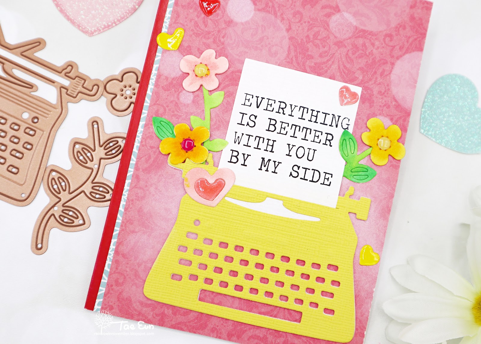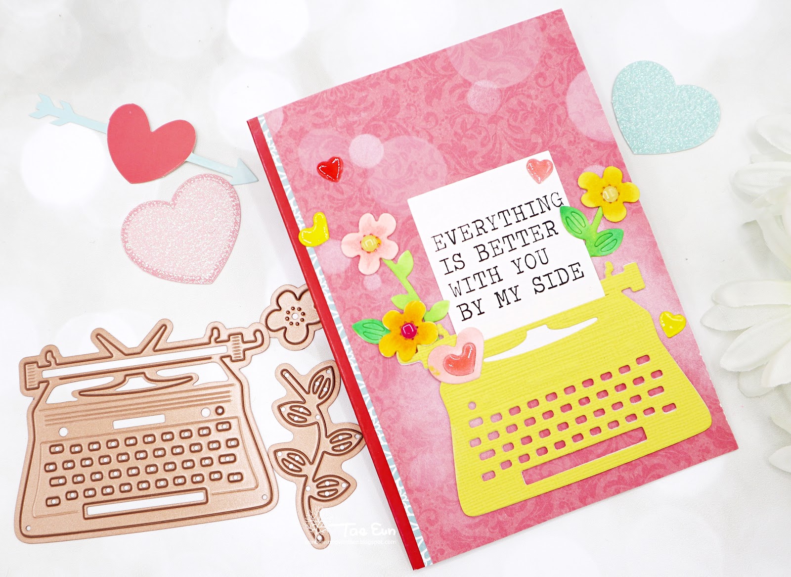 Next card is showcasing the cute die set of the Kit. In the die set are included a typewriter, small flowers, branches, hearts and adorable sentiments.
