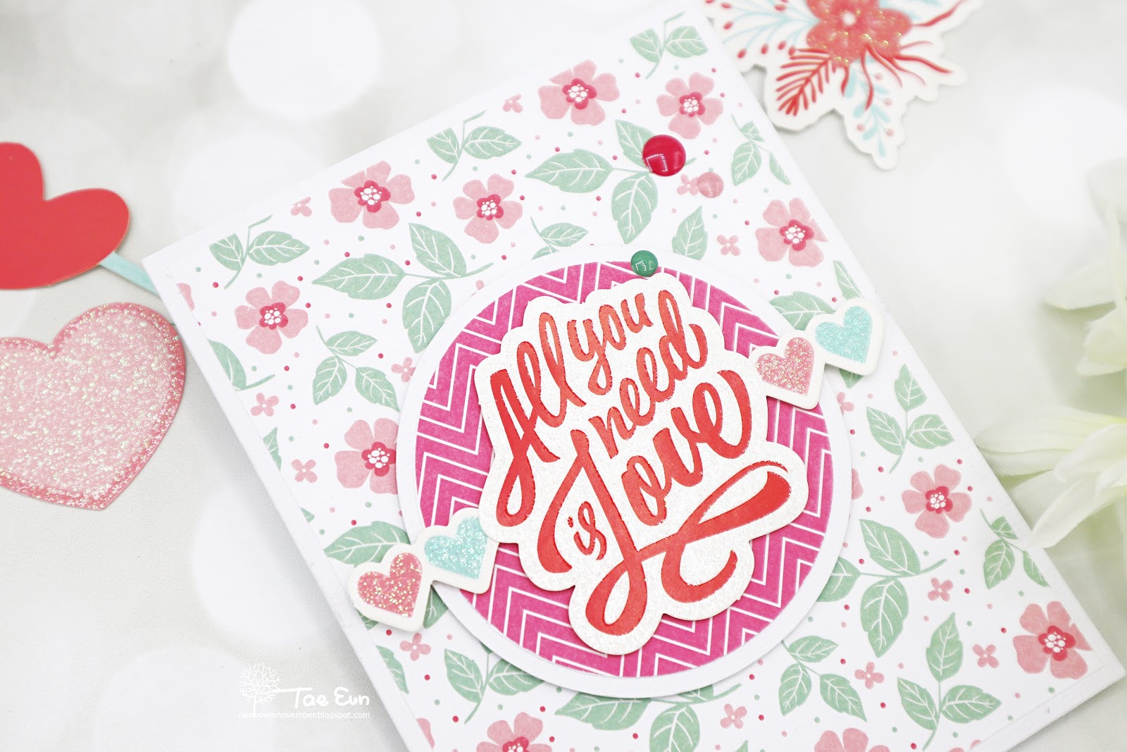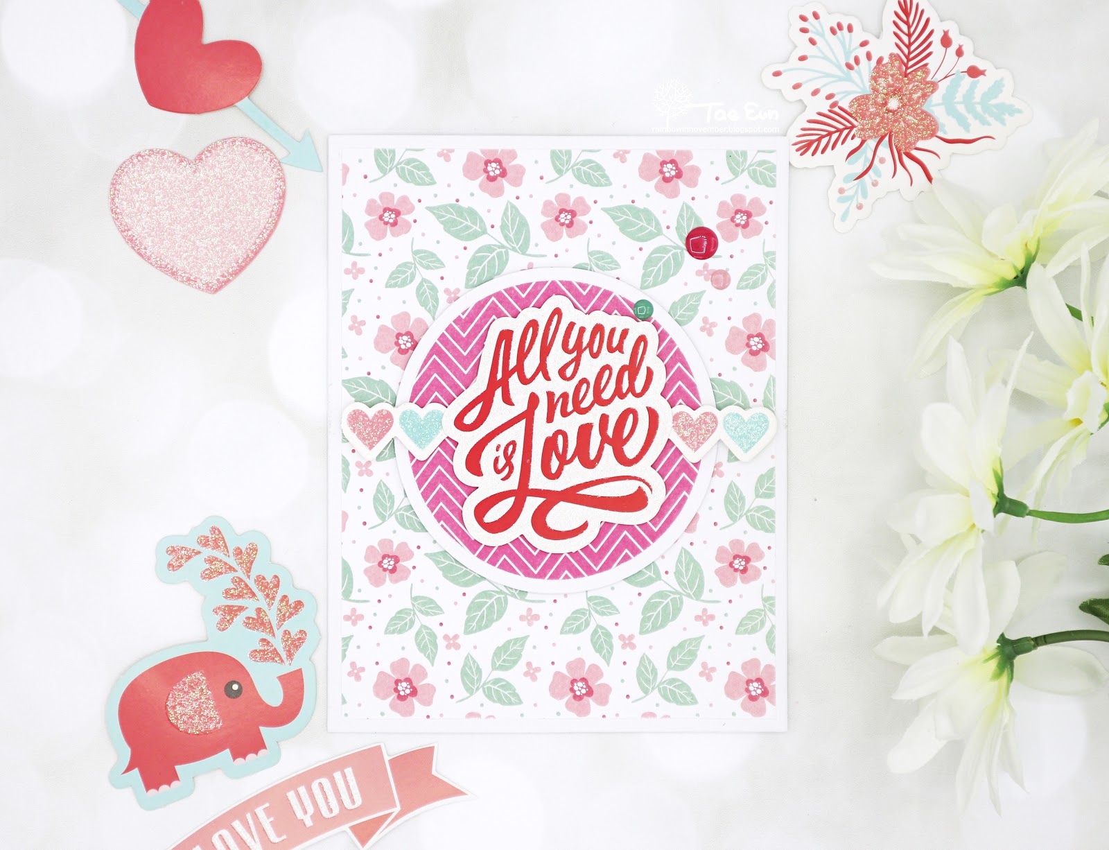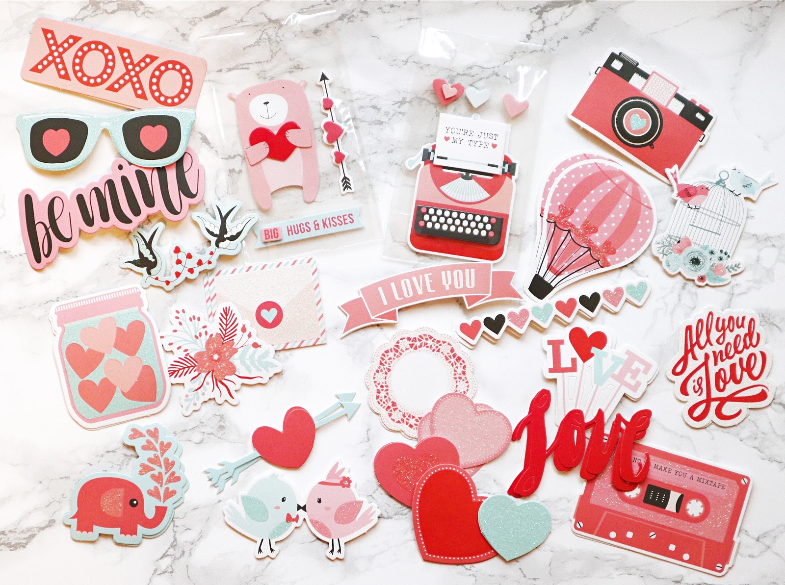 I have the pleasure to play with the kit! And I can say, it is perfect to send some love to your family and friends! There are even 3D foam tapes and a double sided tape so you can start making cards right away!