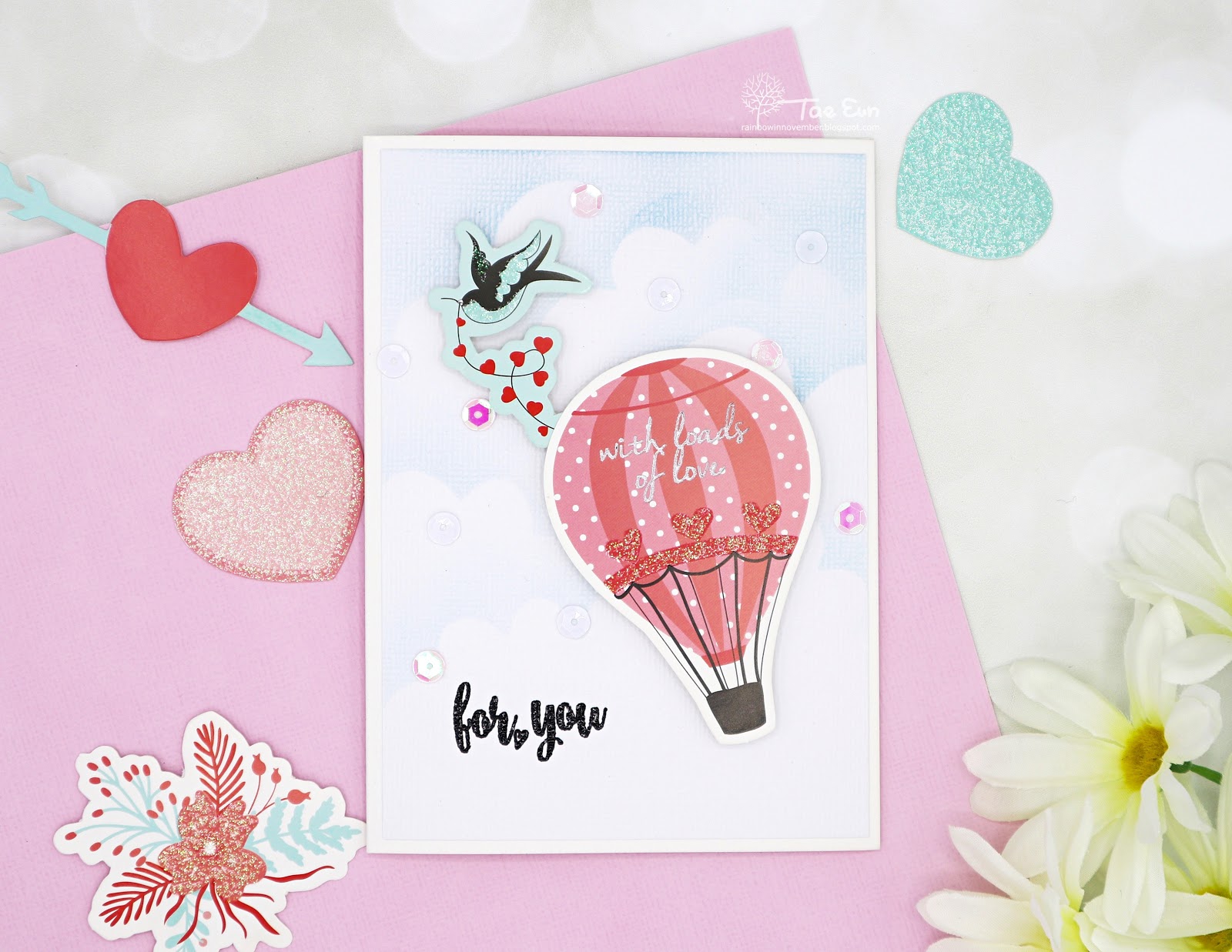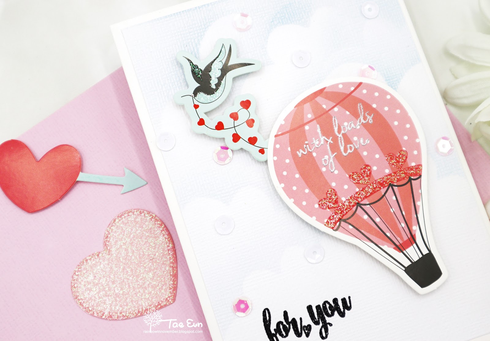 To make this card I used mainly the die cut shapes. First I made the sky background by blending Tumbled Glass DI on the white cardstock from the kit. I cut the clouds from some printer paper to make cloudy sky. I then stamped the sentiment from You’re My Type clear stamp in black pigment ink on the background panel and clear heat embossed it. I added a silver heat embossed sentiment saying”with loads of love” on the hot air balloon as well. I adhered the heart string underneath the hot air balloon after cutting out a bird holding the end of the string and foam mounted it on the background.