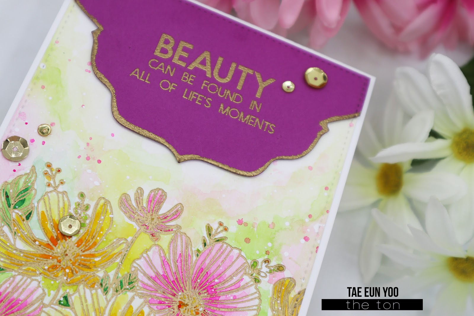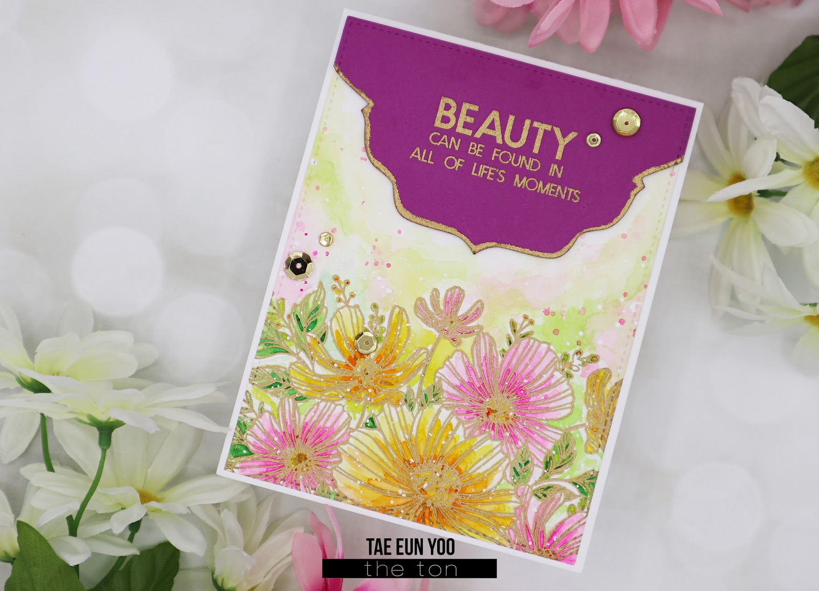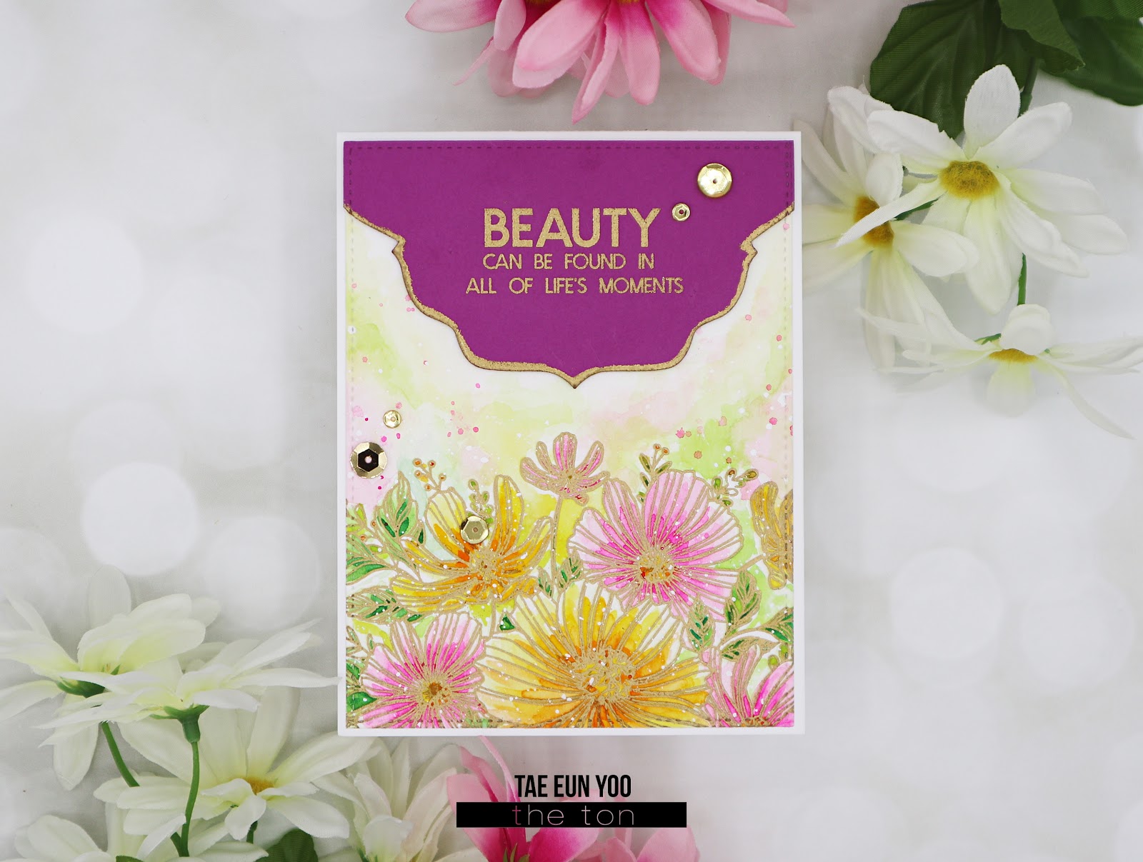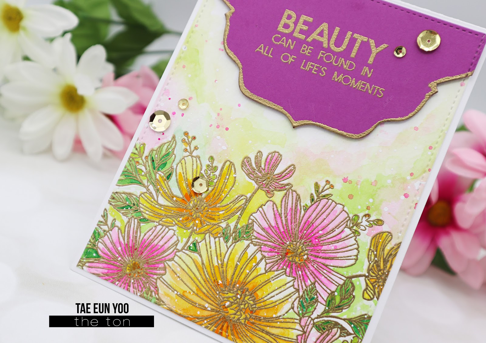 I gold heat embossed the Smiling Cosmos image on a watercolor paper panel and colored it with Color Burst. After the panel was dry I splattered some pink and opaque white watercolor on the panel.