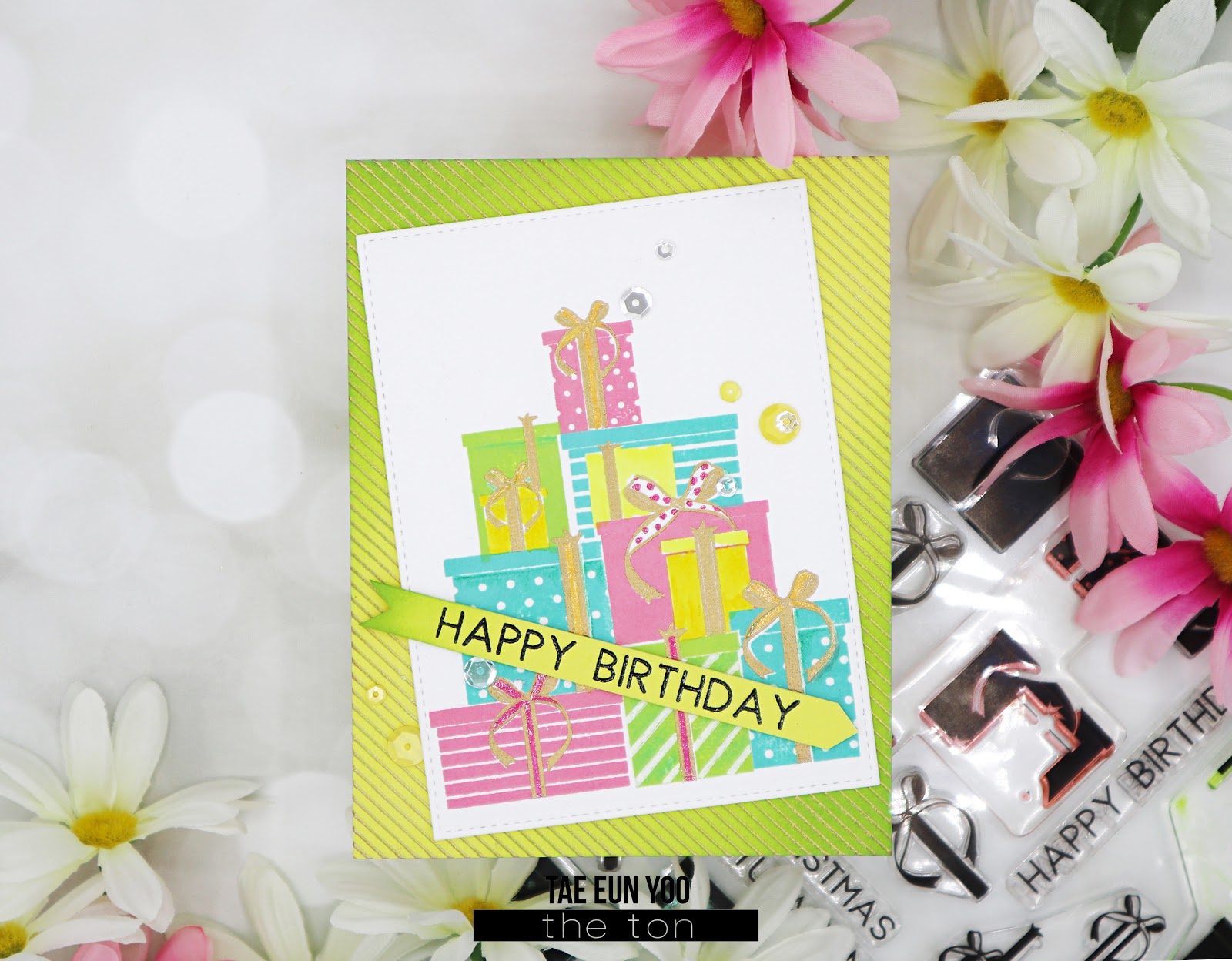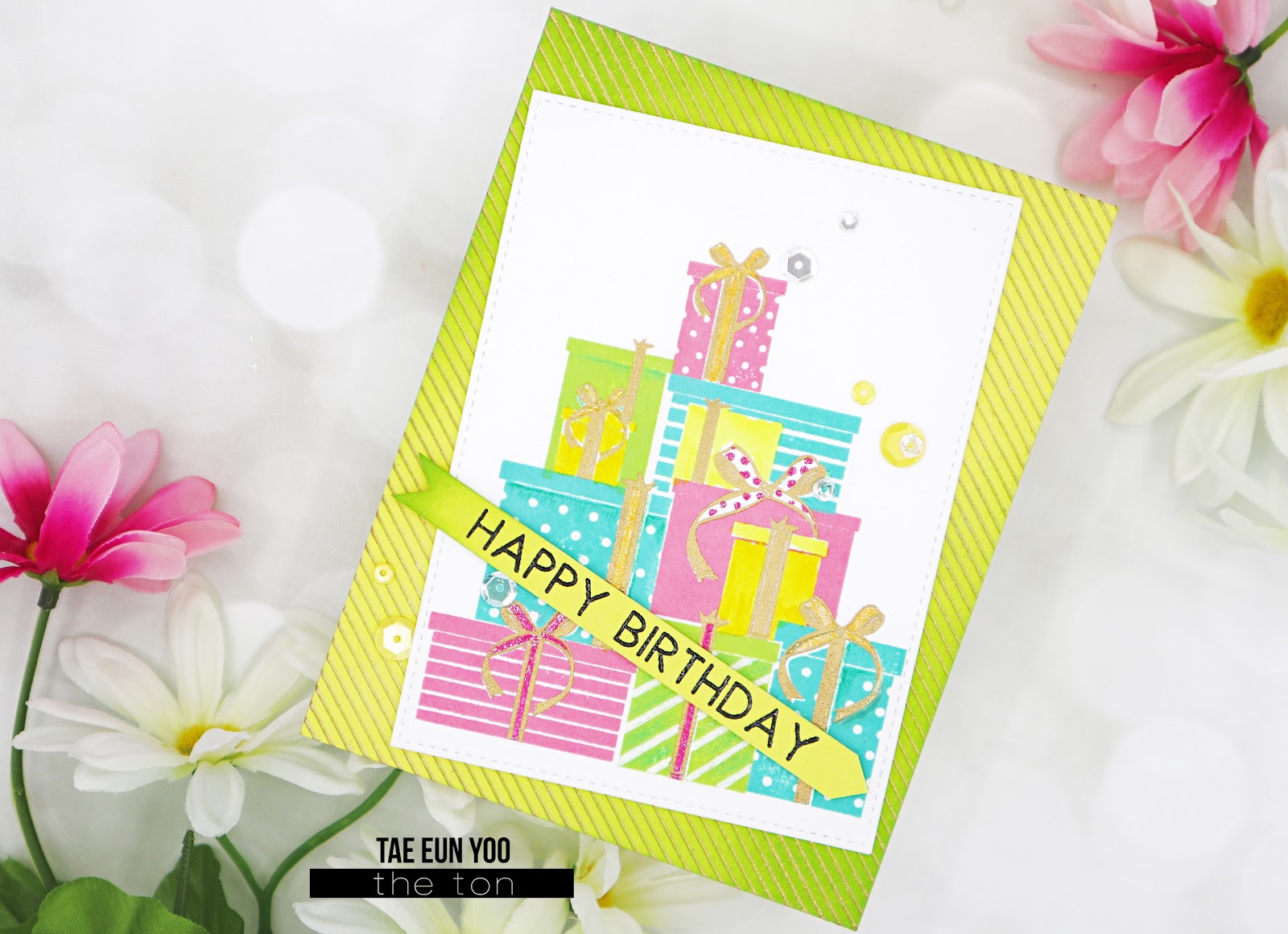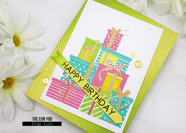 I started off by stamping the stack of gift boxes in Soft Garnet, Bright Emerald and Soft Garden on a white cardstock. I gold heat embossed the ribbons and colored three boxes using yellow Copic markers which stay white after stamping all three layers.