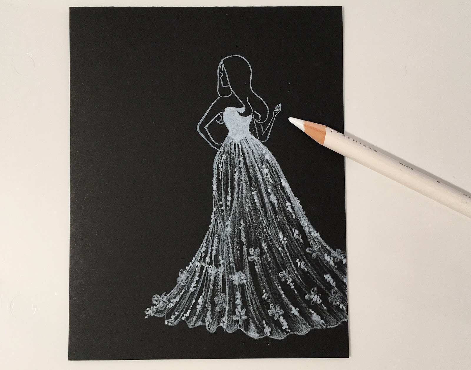 I stamped the lady from Born Classy stamp set by The Ton in Hampton white pigment ink and colored her in a white Prismacolor pencil. I found a lot of gorgeous sketches of dresses in white on dark paper on Pinterest and was inspired by them.