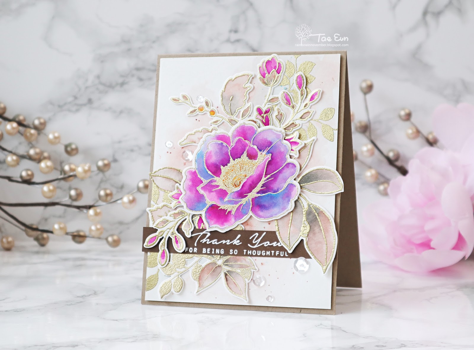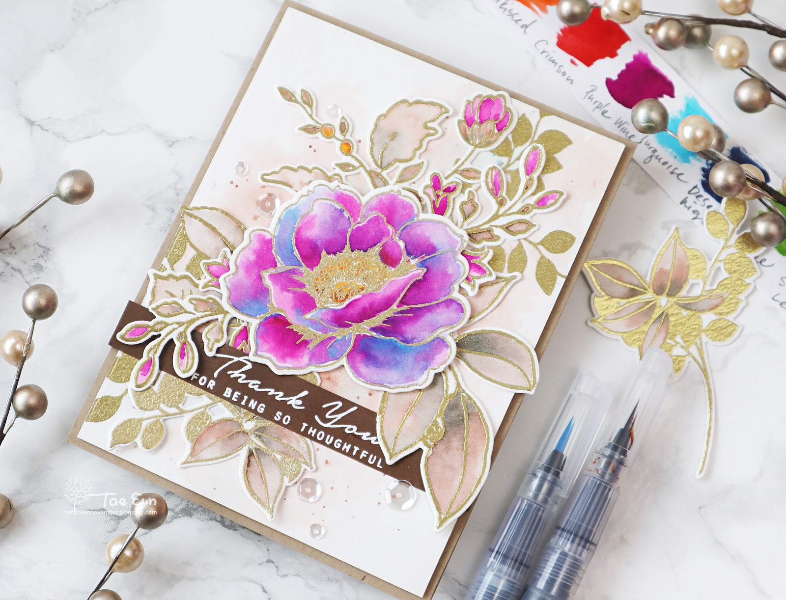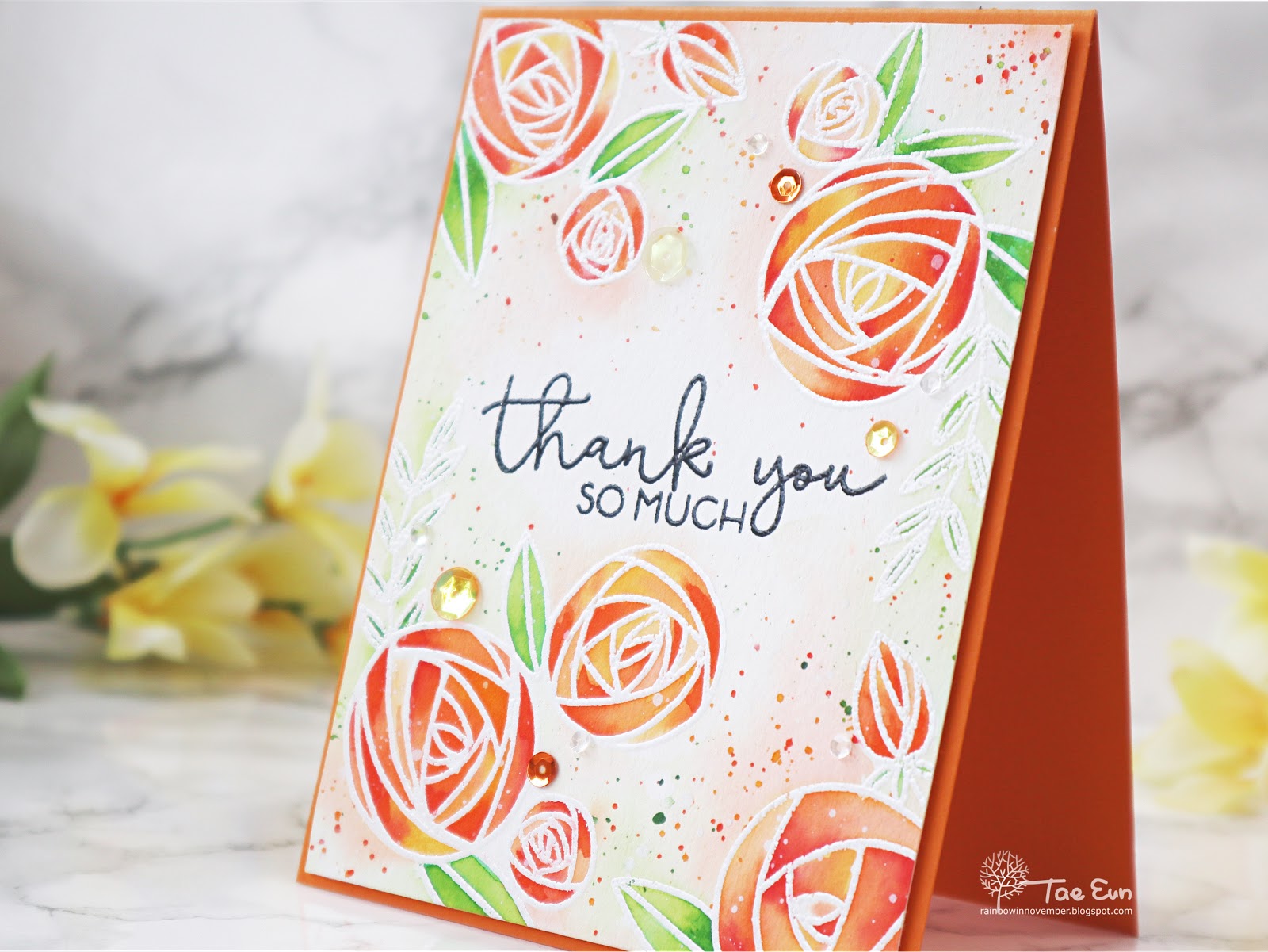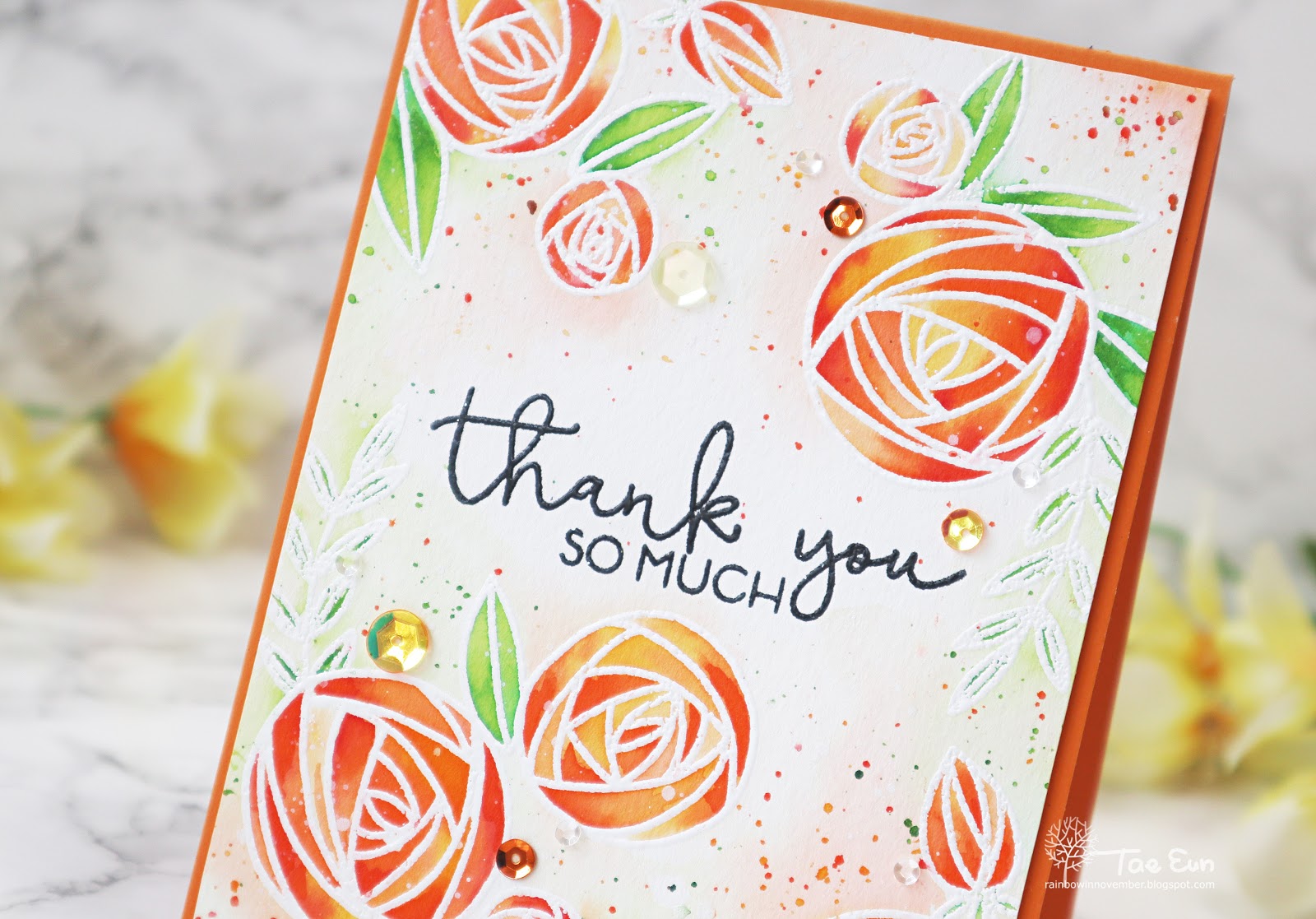 I started off by stamping the sentiment from Rennie Roses set in black pigment ink and clear heat embossing it on the center of a Canson watercolor paper panel. I then white heat embossed the cute roses and leaves from Rennie Roses set. I used the mask stencil to mask the roses if needed.