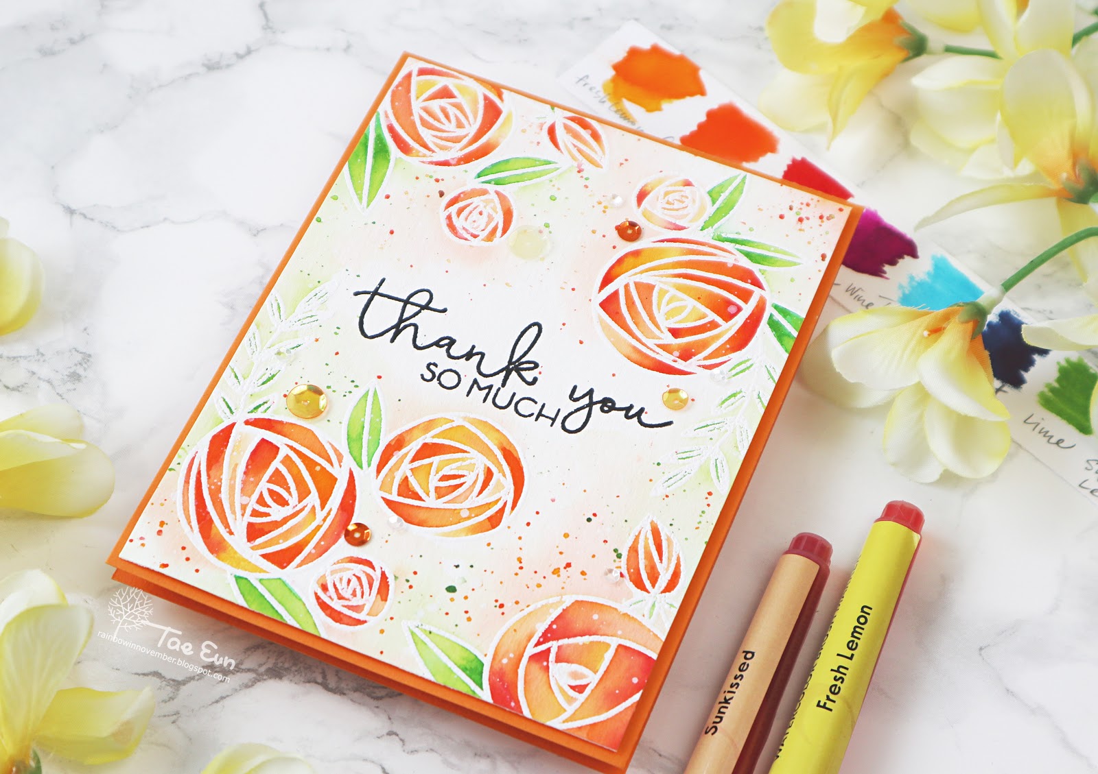 After the heat embossing was done, I started coloring the image and background. I colored the roses in Fresh Lemon, Sunkissed and Crimson. For the leaves I used Lime and Sweet Leaf. I splattered orange and green colors on the background while masking the images. The white splatters were added without masking the images.