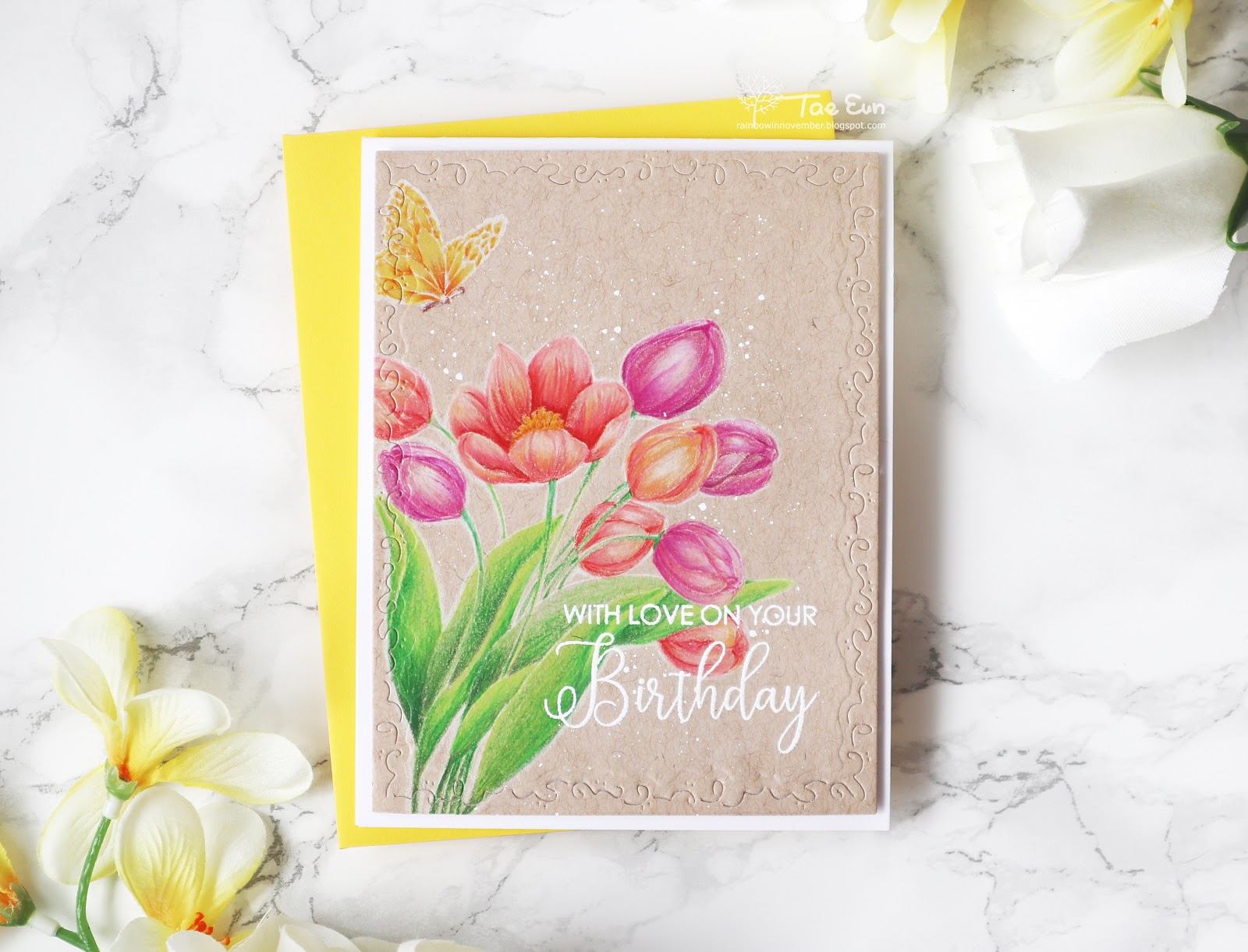 I stamped the bouquet and the butterfly in a white pigment ink on Toned Tan paper. I usually use an embossing ink when I want to no-line color some images on colored paper. This time I tried white ink and it worked very well for me.