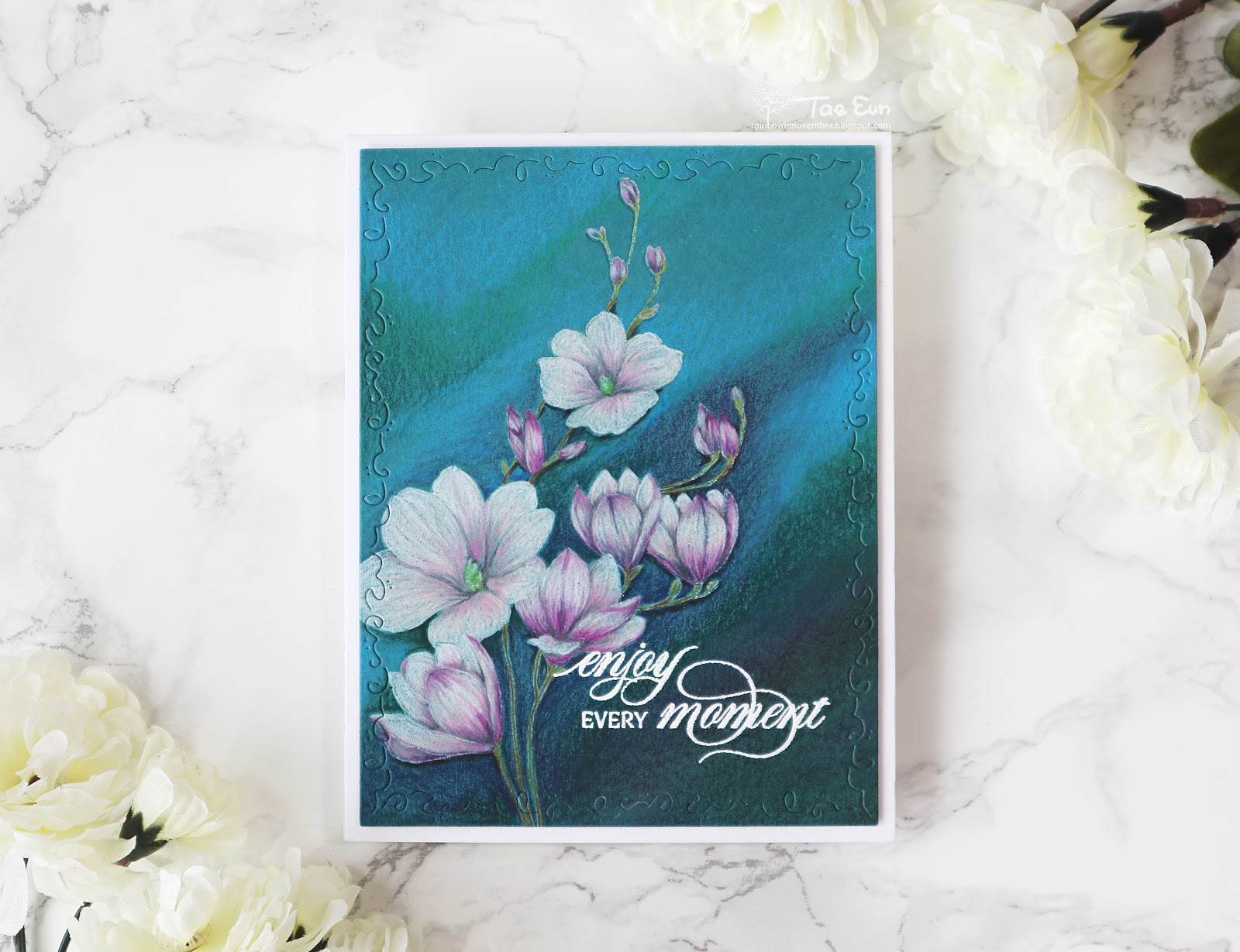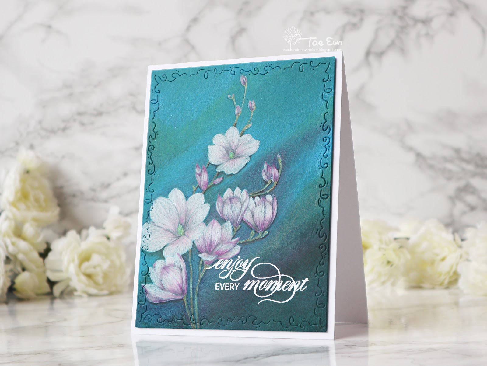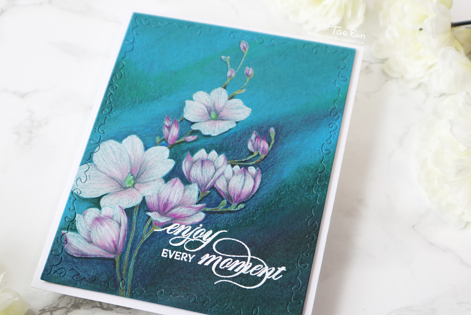 I’ve created two cards for today. Both are featuring beautiful floral stamps from Penny Black and colored using colored pencils. Tulips and magnolias, both flowers are Spring for me!