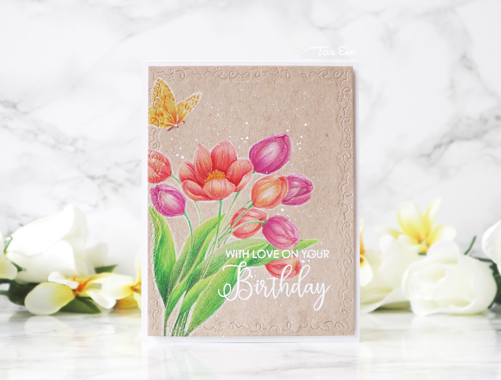 For the first card I’ve colored a beautiful bouquet of tulips using my colored pencils. The stamp set is called Flutterby (40-668), a new cling stamp set by Penny Black. The set includes the little butterfly stamp as well.