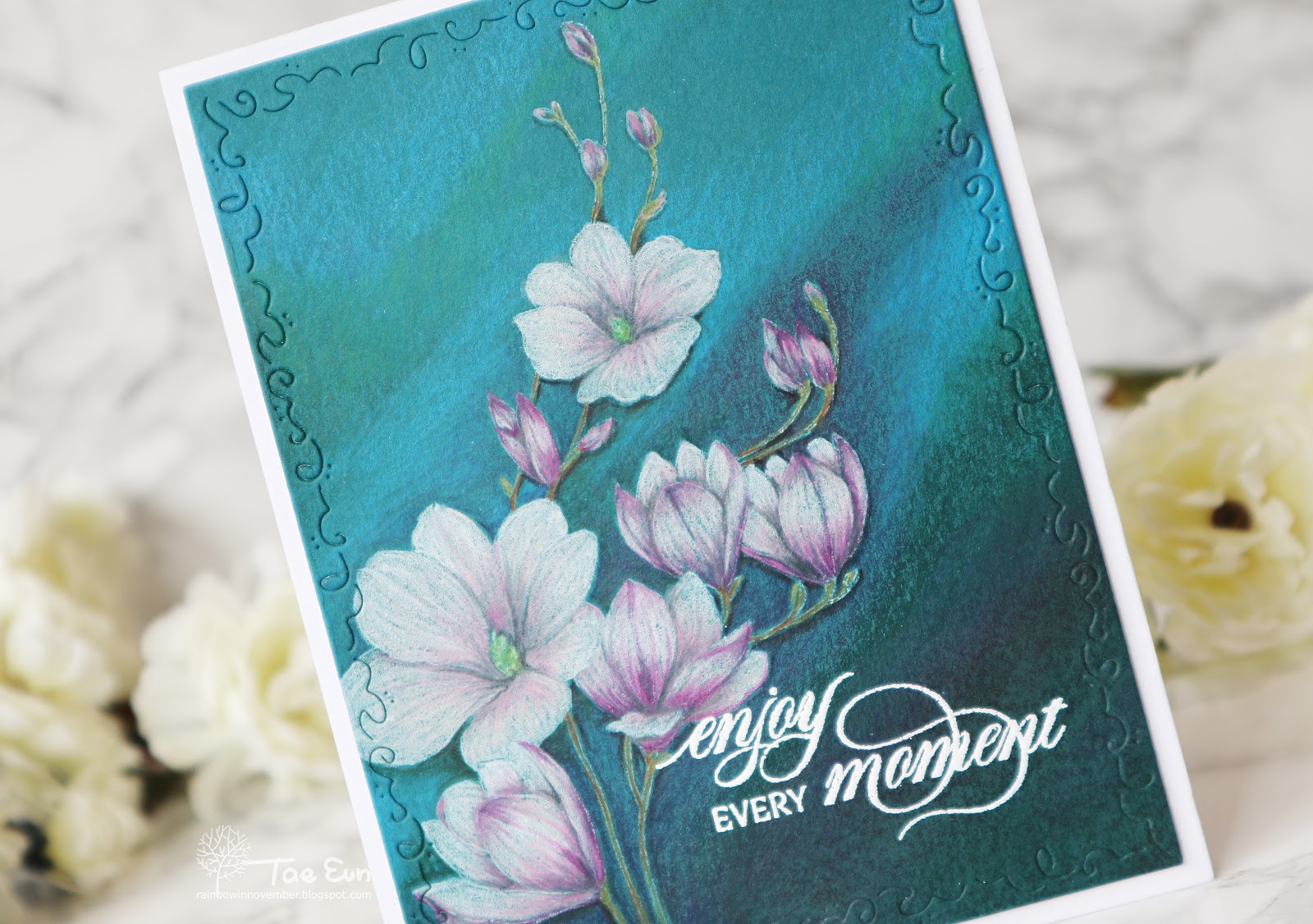 I stamped the image this time on a dark teal cardstock in a white pigment ink. I colored the image using colored pencils. Actually I wanted to gold heat emboss the image after coloring to pop it a bit more but I accidentally moved the stamp on the MISTI tool, so it was impossible.