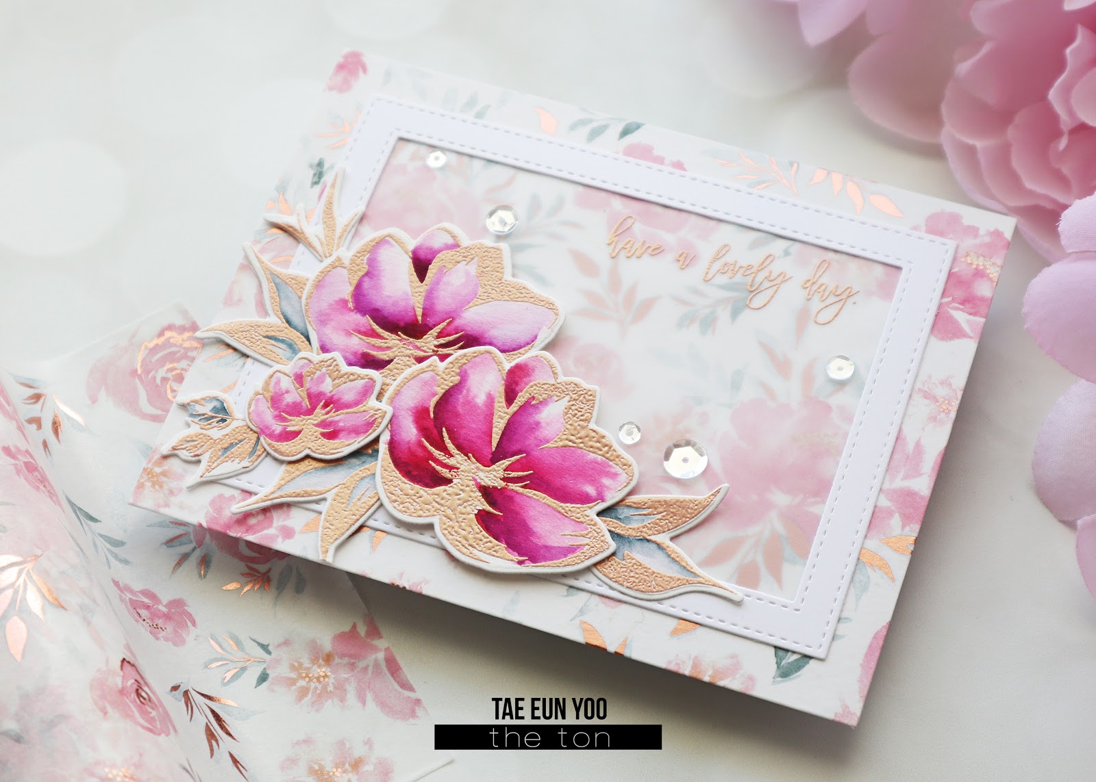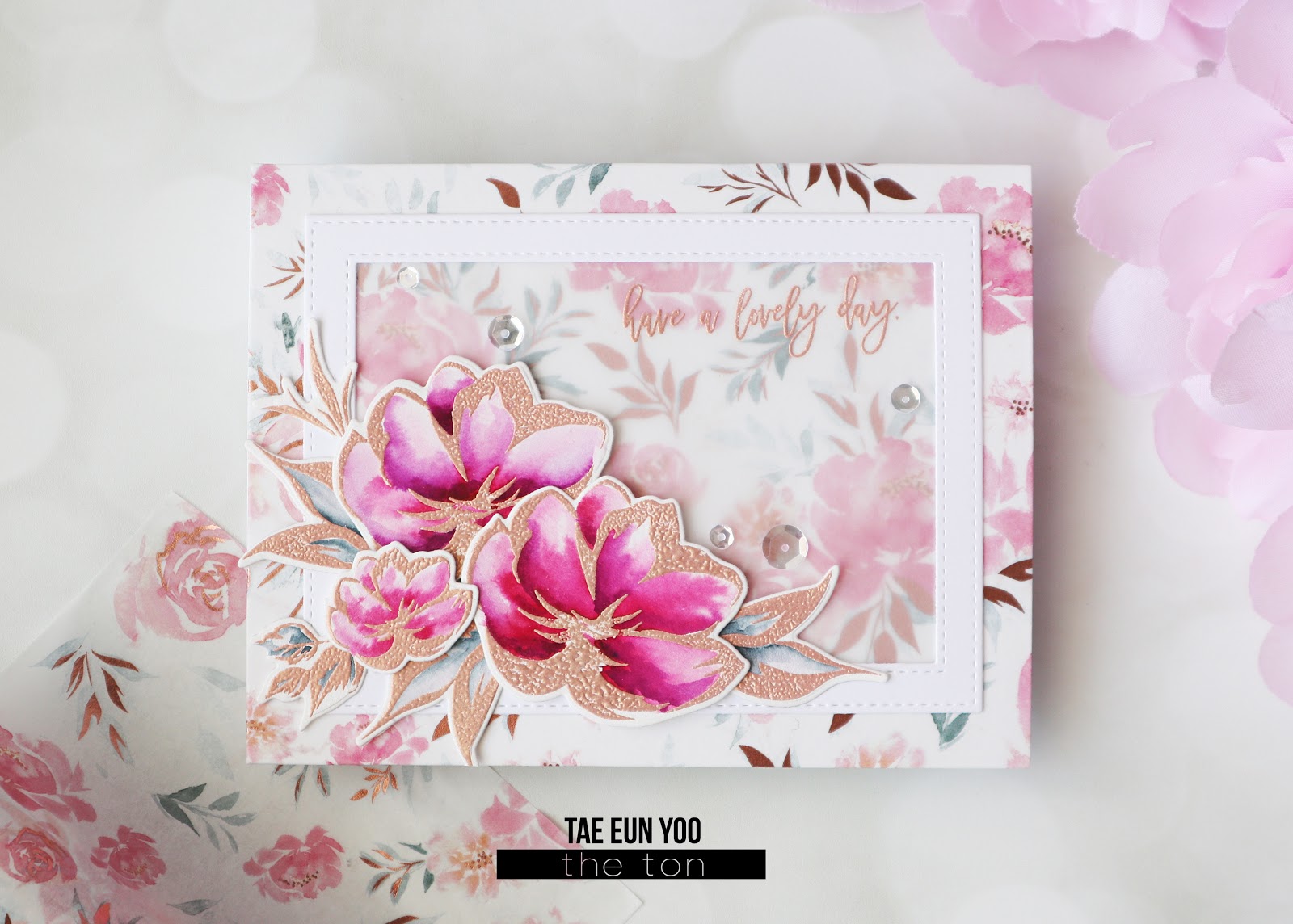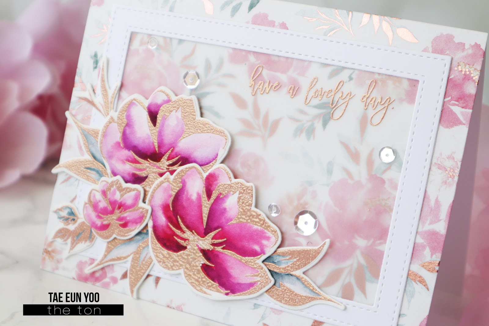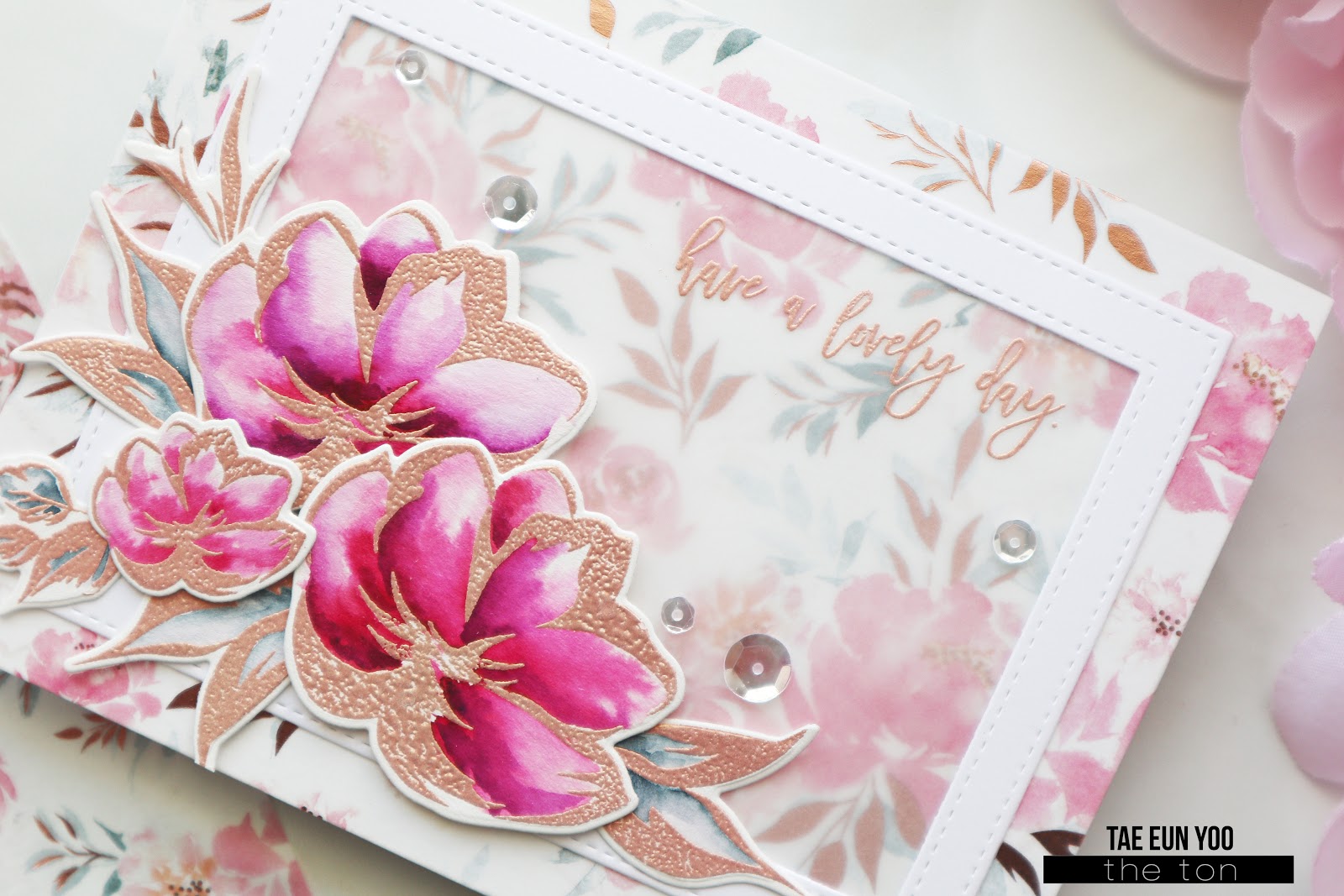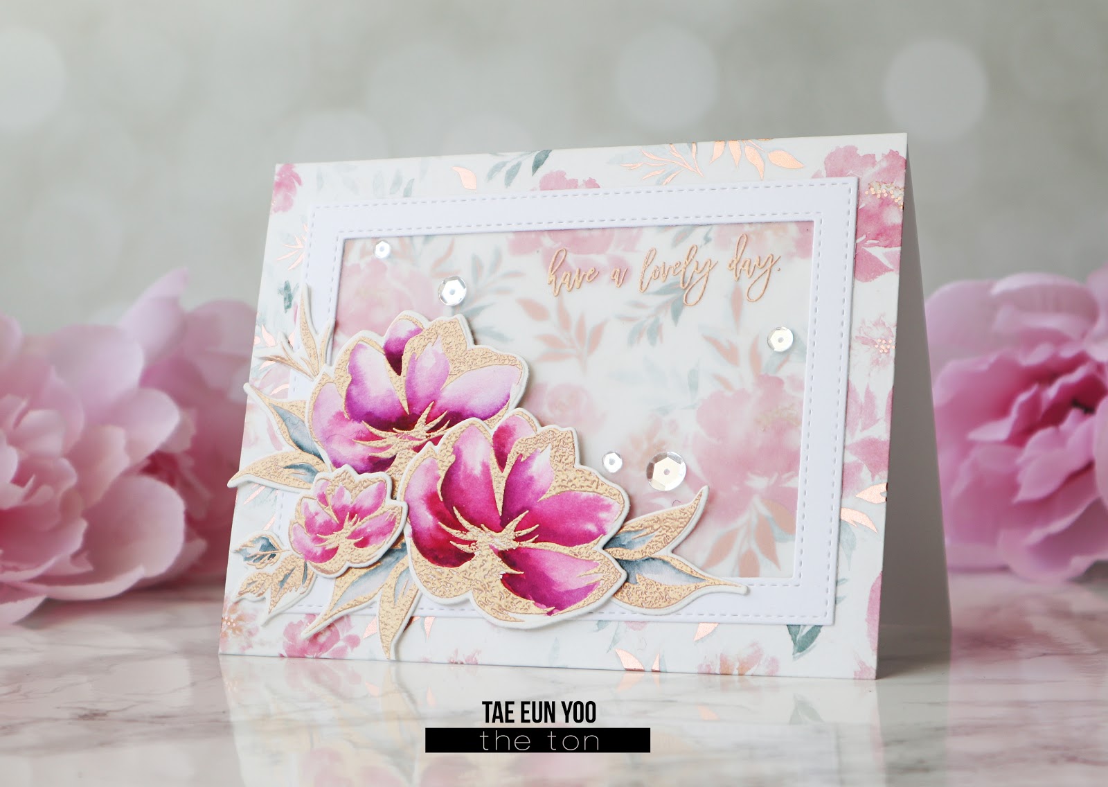 I adhered the frame on the card and arranged the floral elements using some foam adhesives as shown in the picture. I finished off the card by scattering some Glass Slippers sequins.