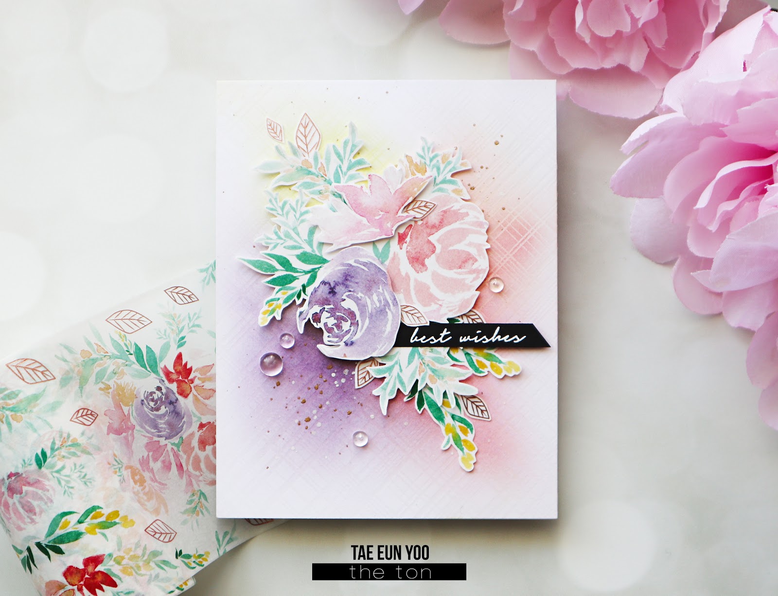 This washi tape is so beautiful. I wanted to show it as it is on the whole panel. The  Pink Peonies washi tape is 4.5 inch wide, so you can cover a A2 panel completely with it. I added floral images as focal point of the card.