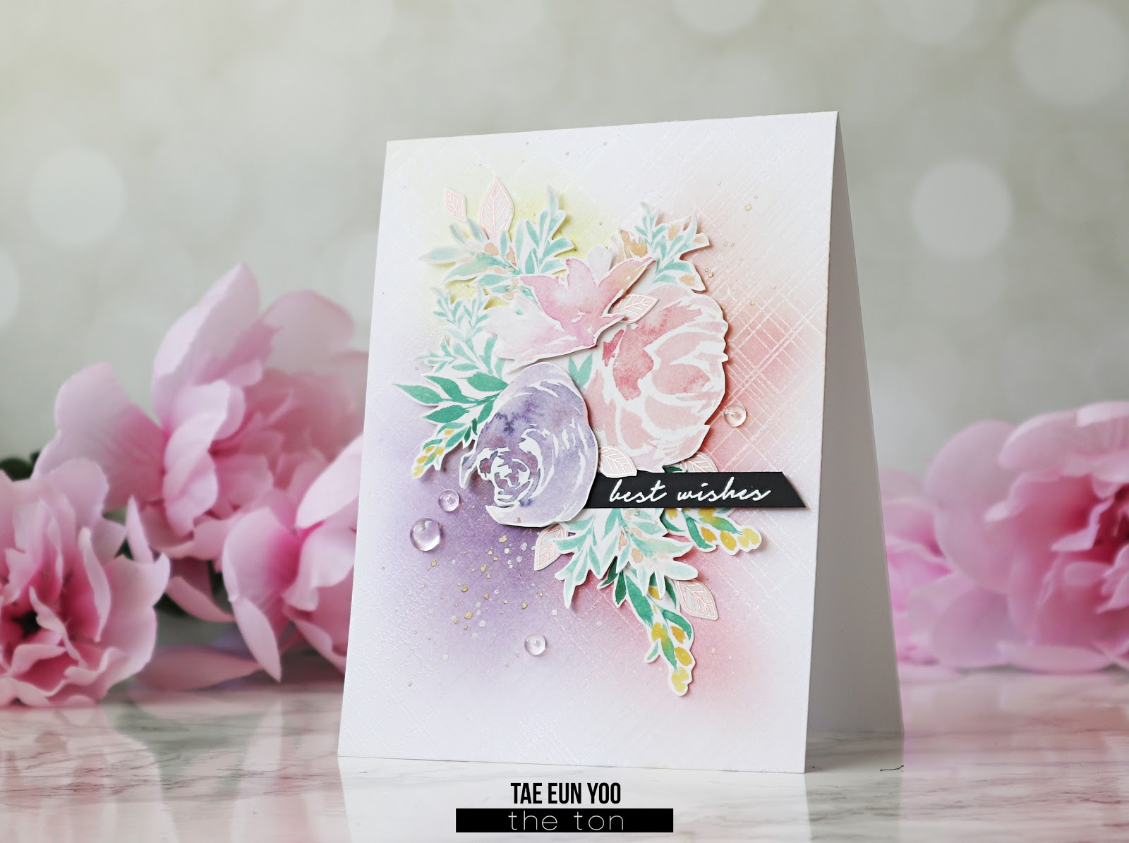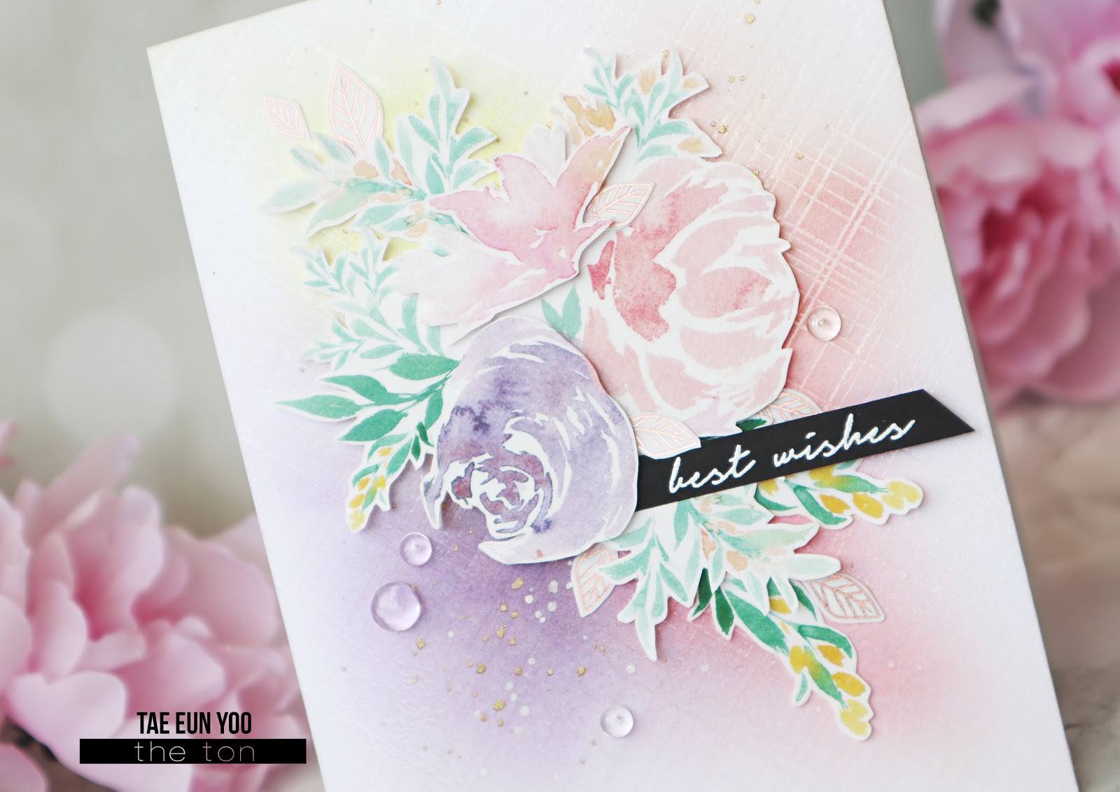 The colors for the background were chosen regarding the colors of the main floral cluster. I blended Soft Garnet, Lemon Drop and Iris Blooms on a white A2 panel and let it dry. I then clear heat embossed Modern Plaid background stamp on it and blended the same colors again. I splattered white opaque ink and gold ink on the background panel and let it dry.