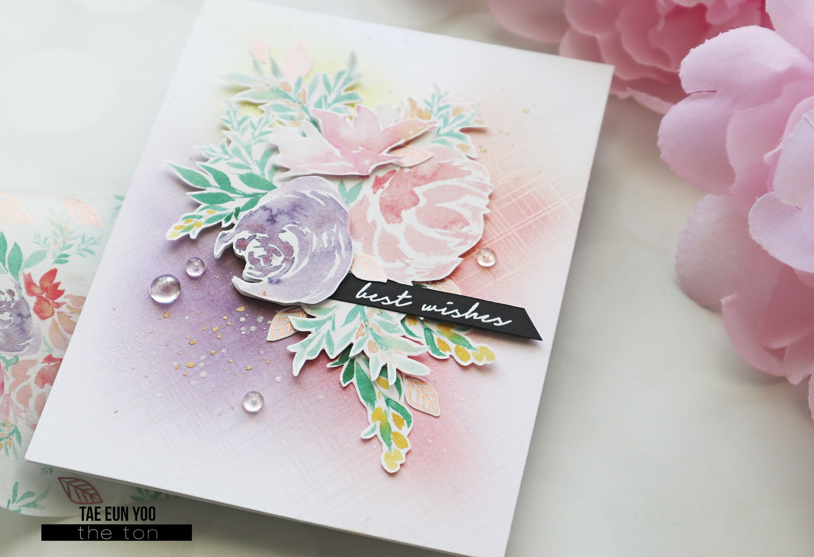 To emphasize the watercolored look I chose the floral images from Watercolor Wreath stamp set. I kept the color combination of the Pink Peonies washi tape by heat embossing the images in Rose Gold,  colored the flowers in Fuchsia, Peony and Wisteria Color Burst powders and the leaves in Payne’s gray watercolor. After done with coloring I cut the images using coordinating dies  and set them aside.