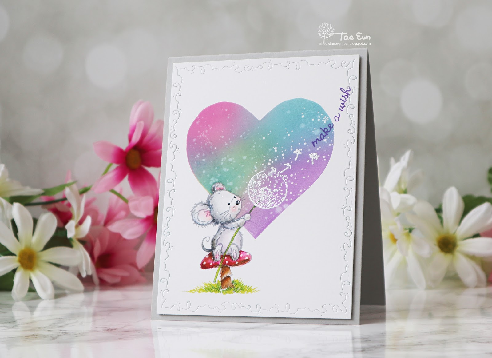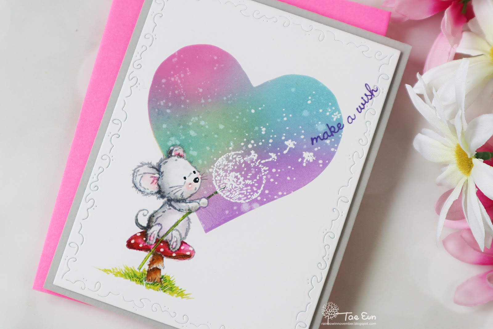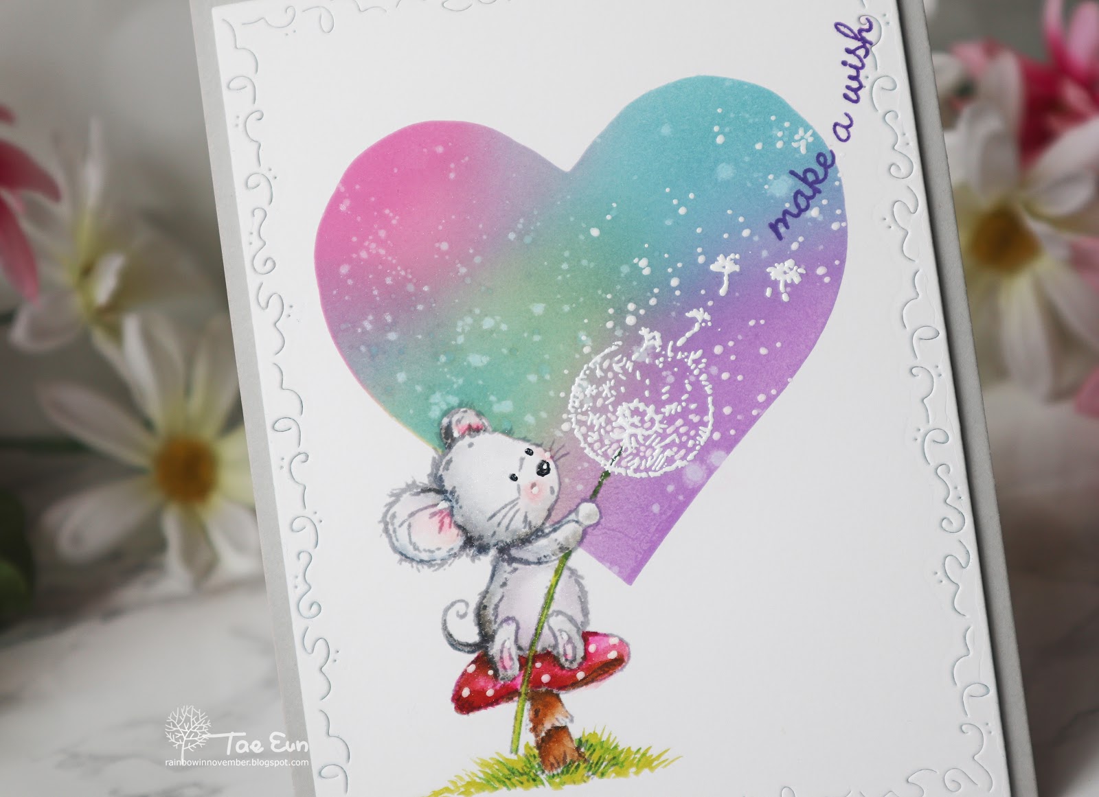 To start off I made a negative mask for the heart and a mask for the mouse. I stamped the mouse sitting on the mushroom in Shadow Grey Archival ink on a Bristol smooth paper. I didn’t ink up the blow-ball to white heat emboss it later. I then adhered the masks on the panel to ink blend in the heart.
