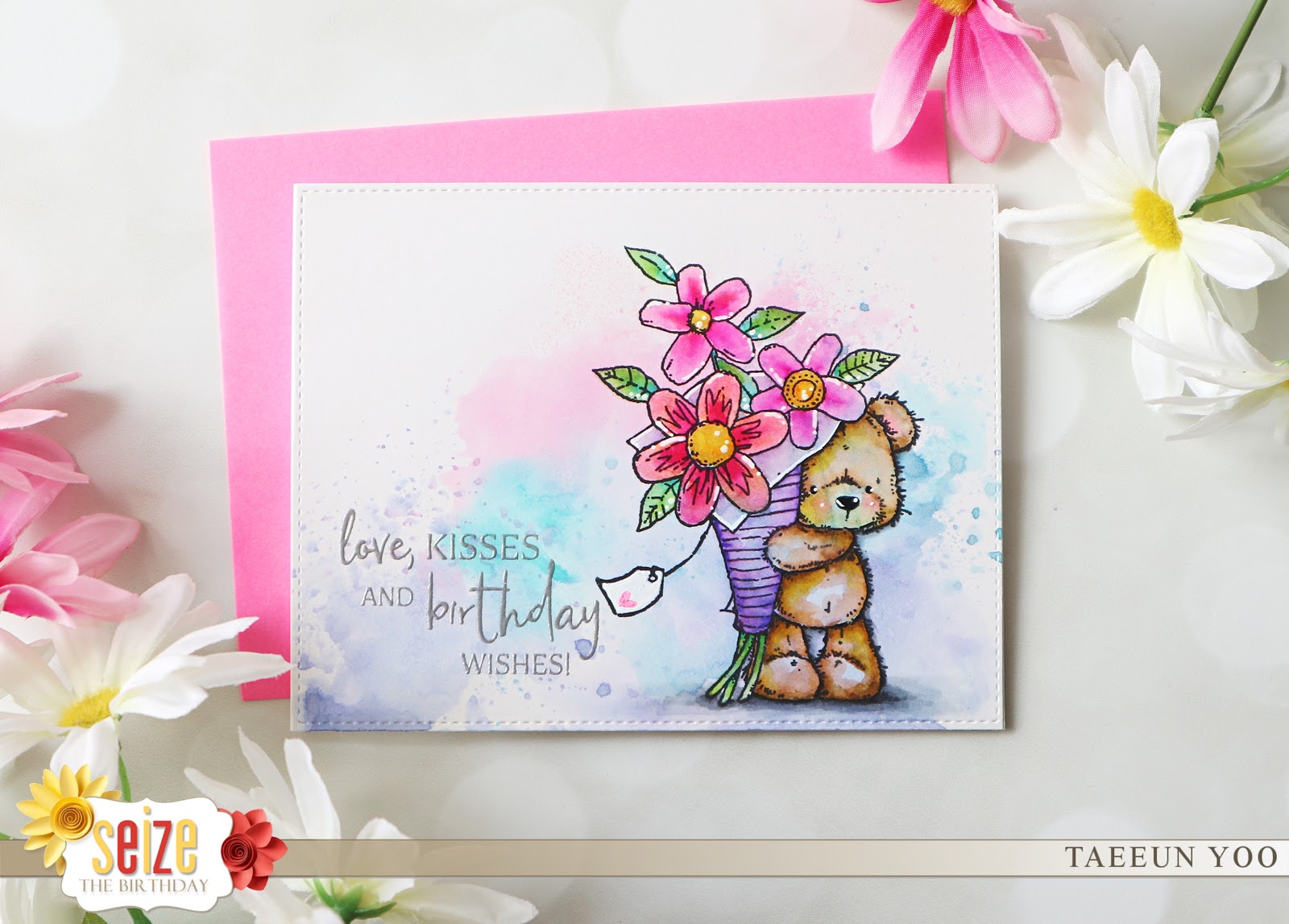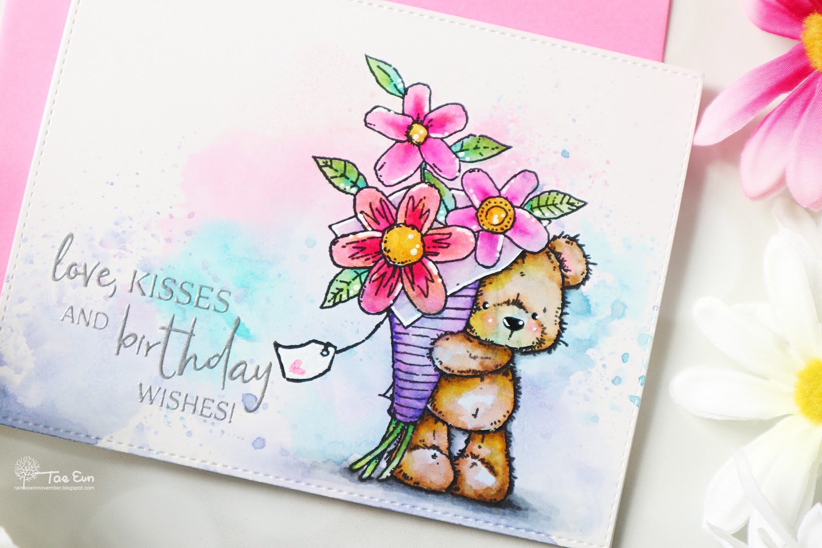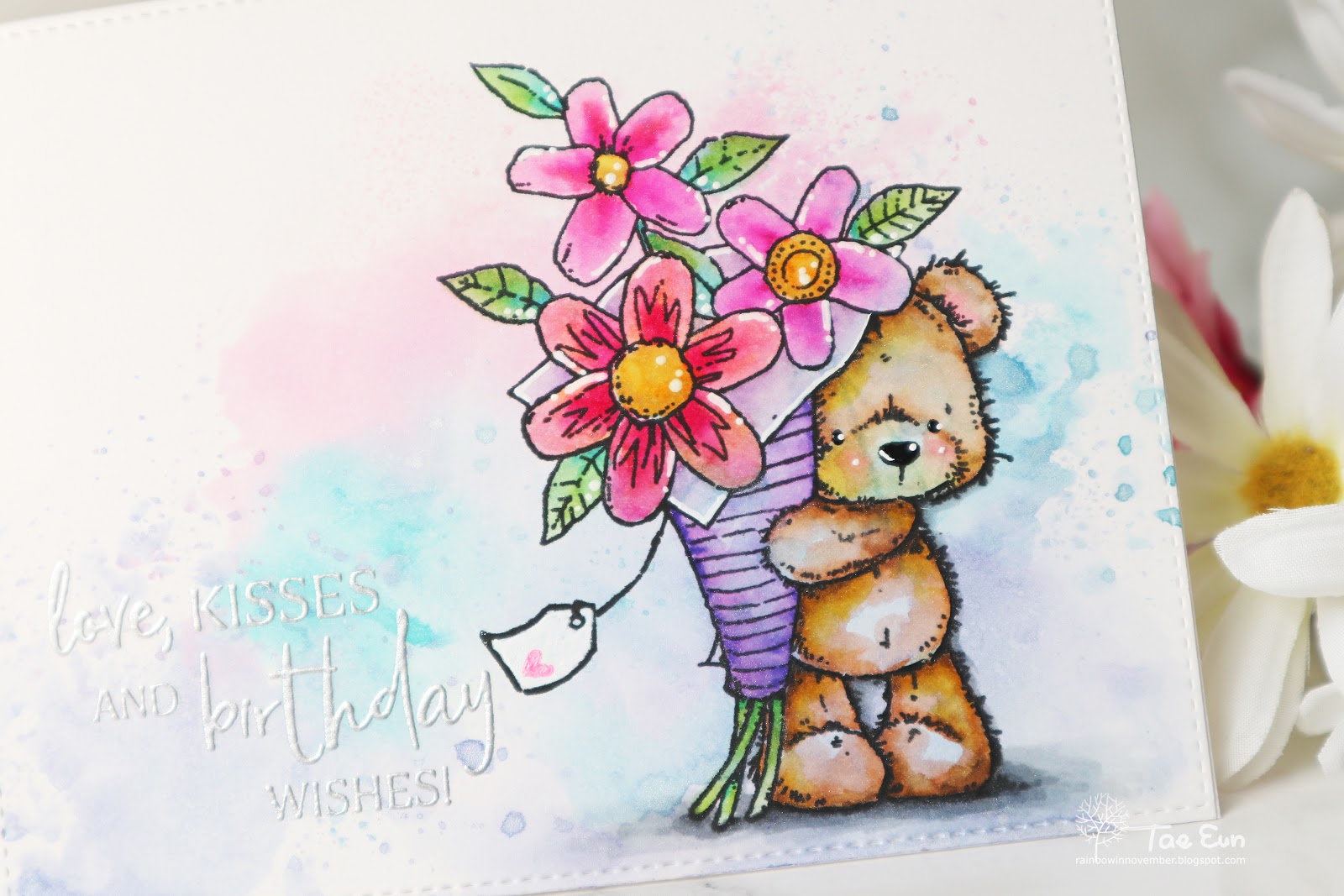 I then stamped the cute bear holding a bouquet ( Flower Teddy 30-543 ) on the panel in black pigment ink. I colored the image using Zig brush markers and used a WOS clear glitter pen to blend the colors. As I stamped the image on a ink smooshed panel, I lifted the purple ink on the bear using clear water and some paper towel before coloring.