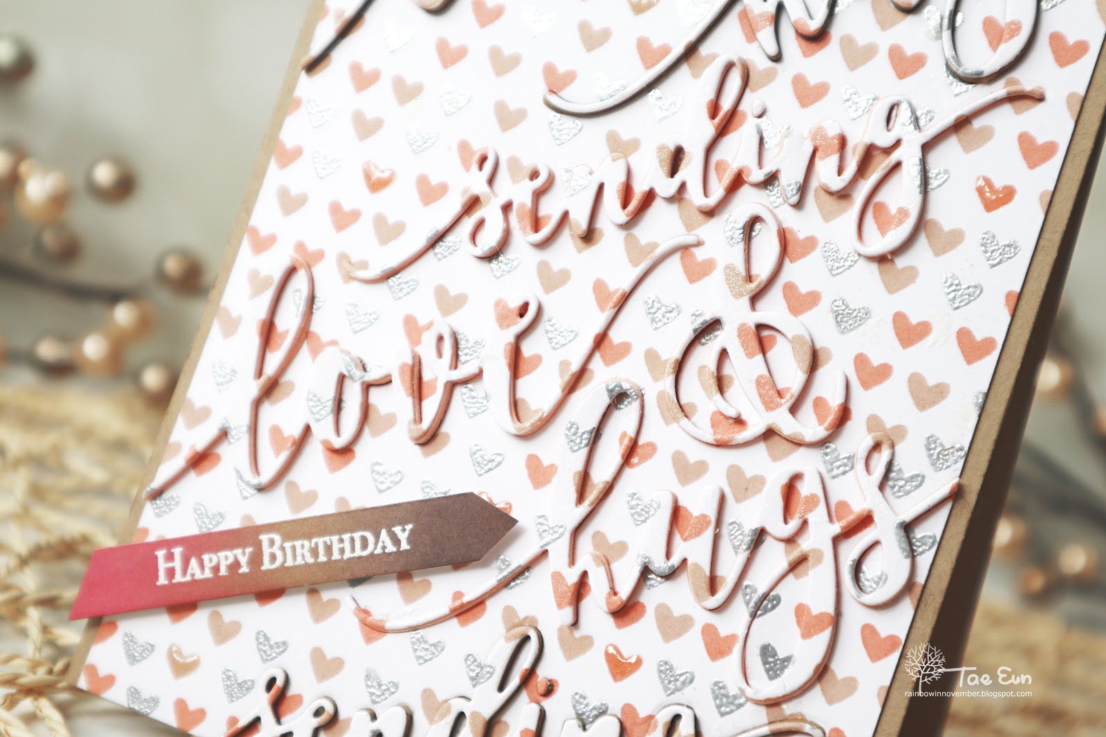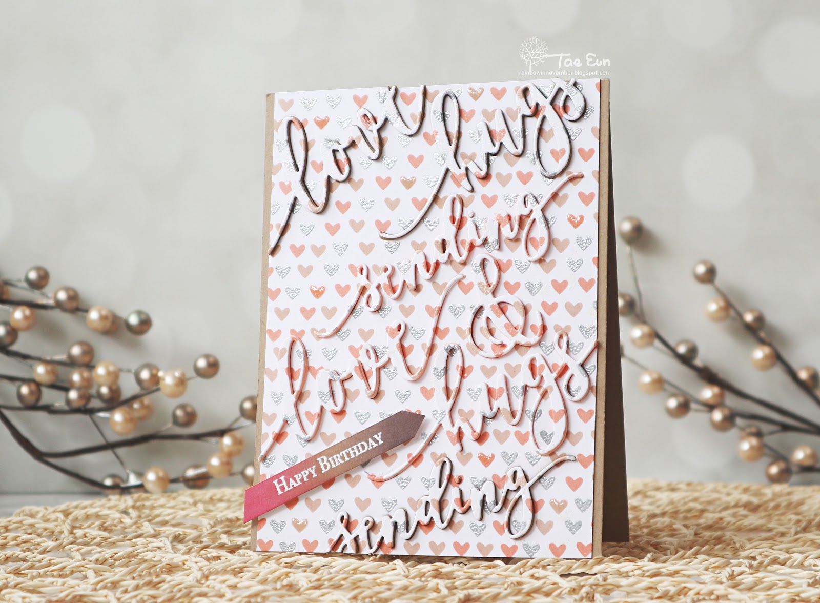 To start off I stamped an A2 sized white panel with Toned Hearts stamp set by The Ton. It is a three step background stamp. I chose Peach Blossom and Warm Hazelnut along with silver heat embossing as my color combination.