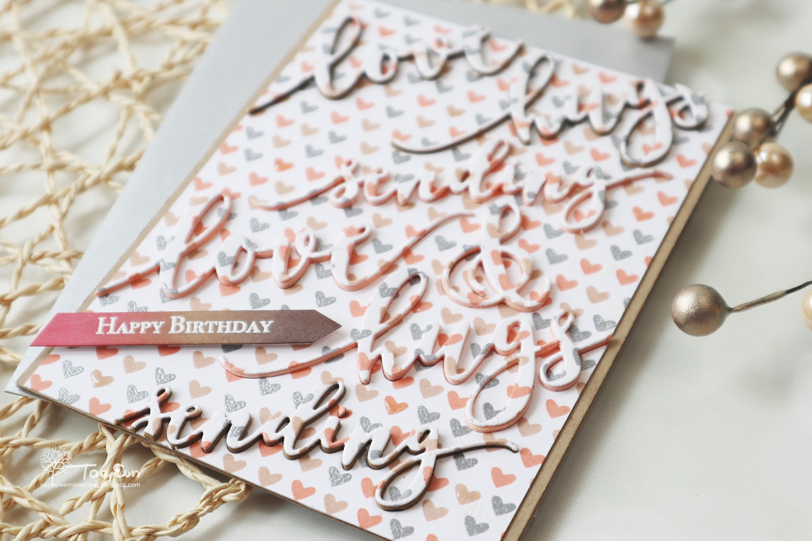 I adhered the negative die cut panel on a kraft cardbase. The die cut sentiments were raised on the die cut fun foam and inlaid in their places. The sentiment strip was ink blended in Peach Blossom, Warm Hazelnut and Dark Roast. I white heat embossed the sentiment from Motorcycle Boss set and foam mounted the strip on the card. To finish off I added clear glitter on the die cut sentiments and glossy accents on some of the little hearts 💕 .