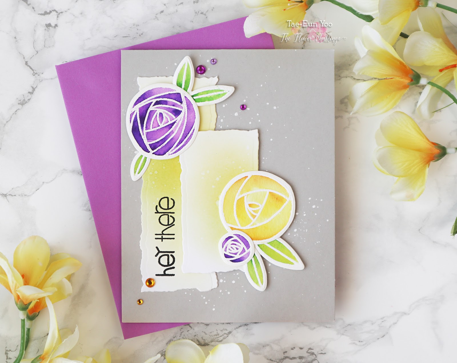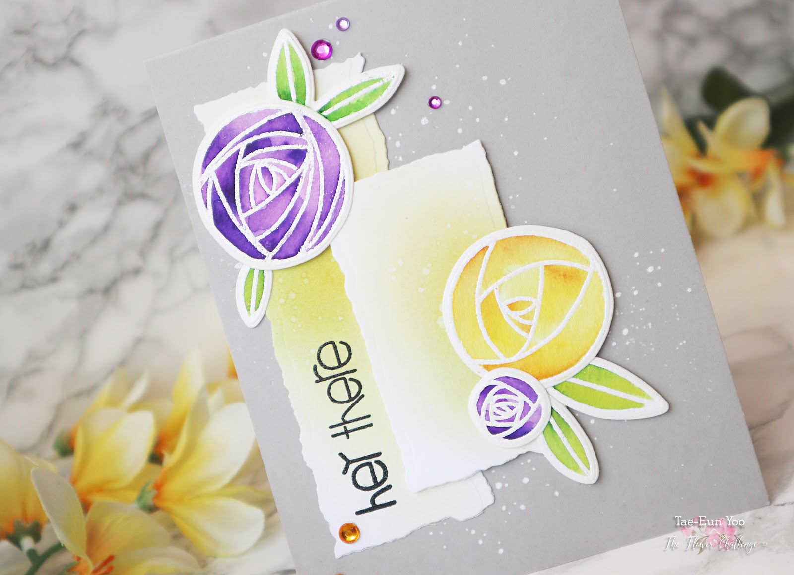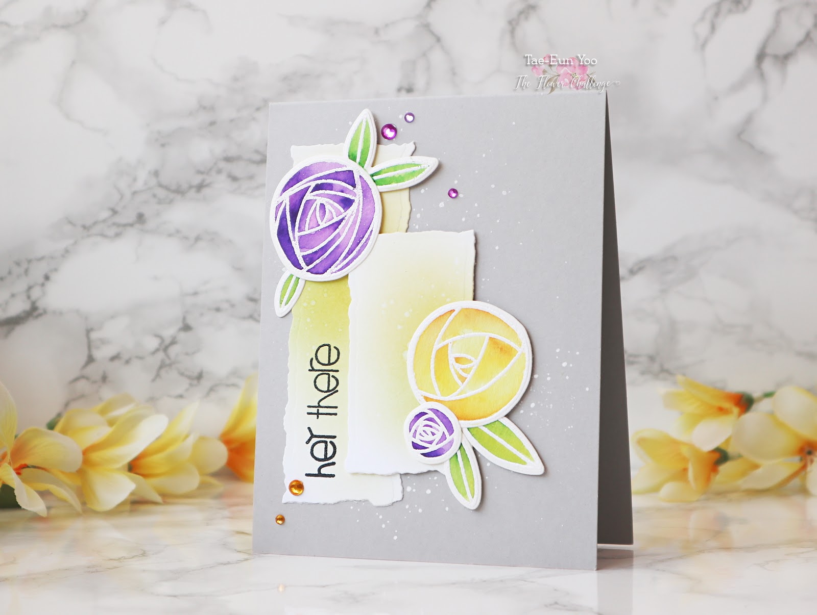 I started off by white heat embossing the cute roses and leaves from Rennie Roses set by Altenew.  I colored them using Color Burst powders in yellow and purple, cut them using coordinating dies and set them aside.
