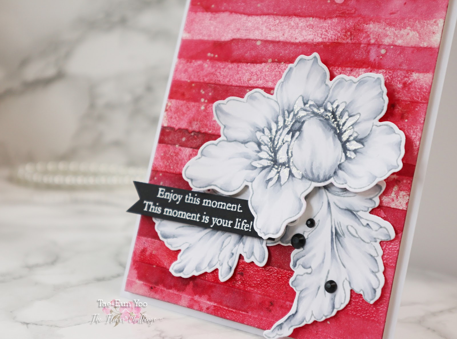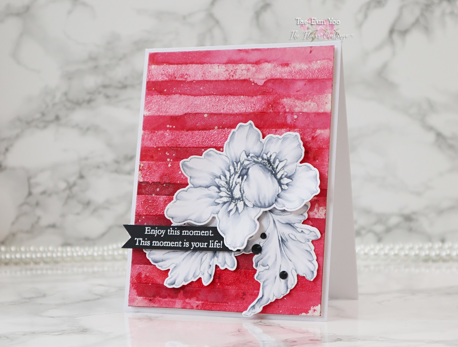 For this card I used Watercolor Stripes stencil , Crown Bloom stamp set and Moments in Time by Altenew.