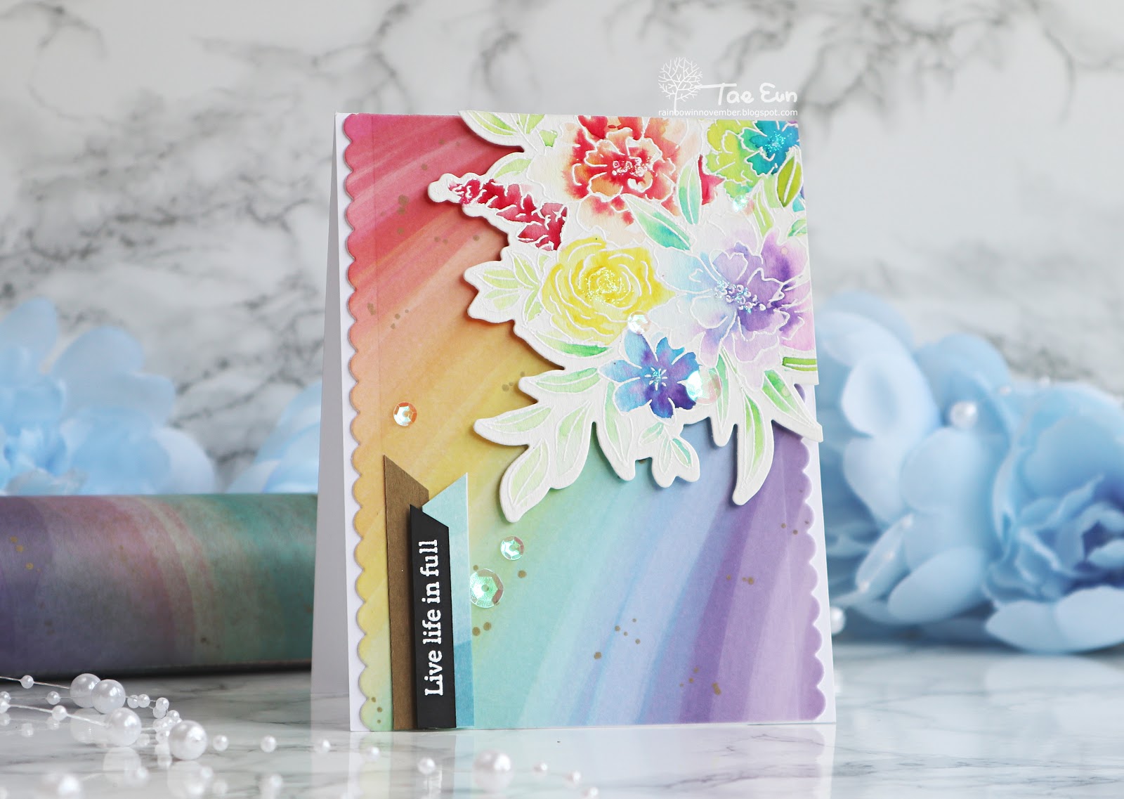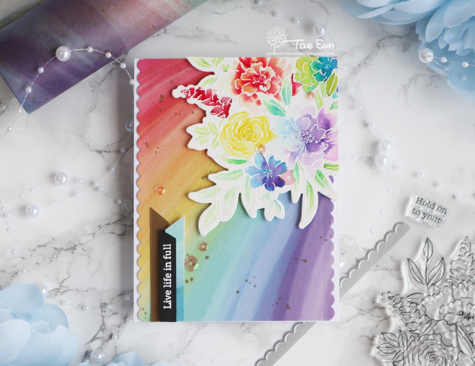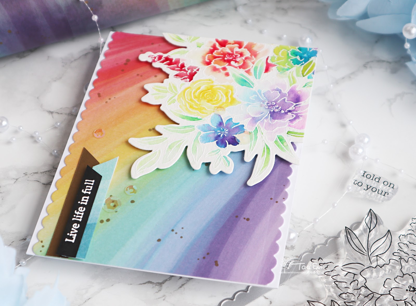 The big floral cluster is from Floral Cluster stamp set. I white heat embossed the image on a watercolor paper panel and colored it using color burst powders in rainbow colors. I then die cut the image and set it aside.