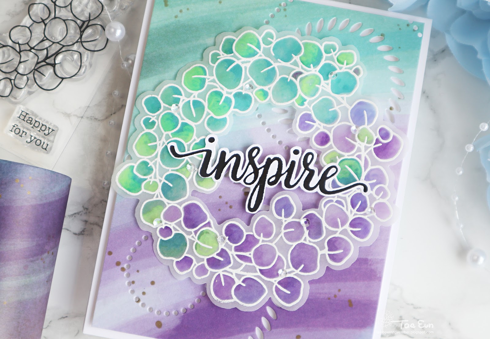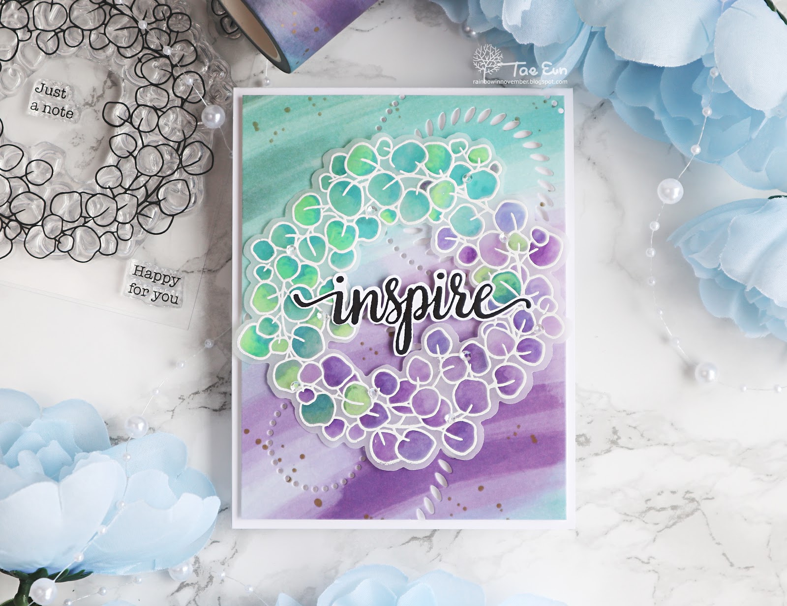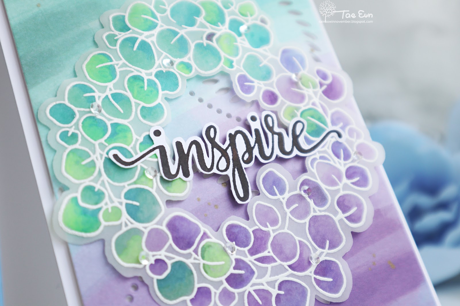 I white heat embossed the leafy wreath from Eucalyptus Fantasy stamp set on some vellum and die cut it using coordinating die. I colored the wreath on the back of the vellum using some alcohol markers in the same colors like the background panel.