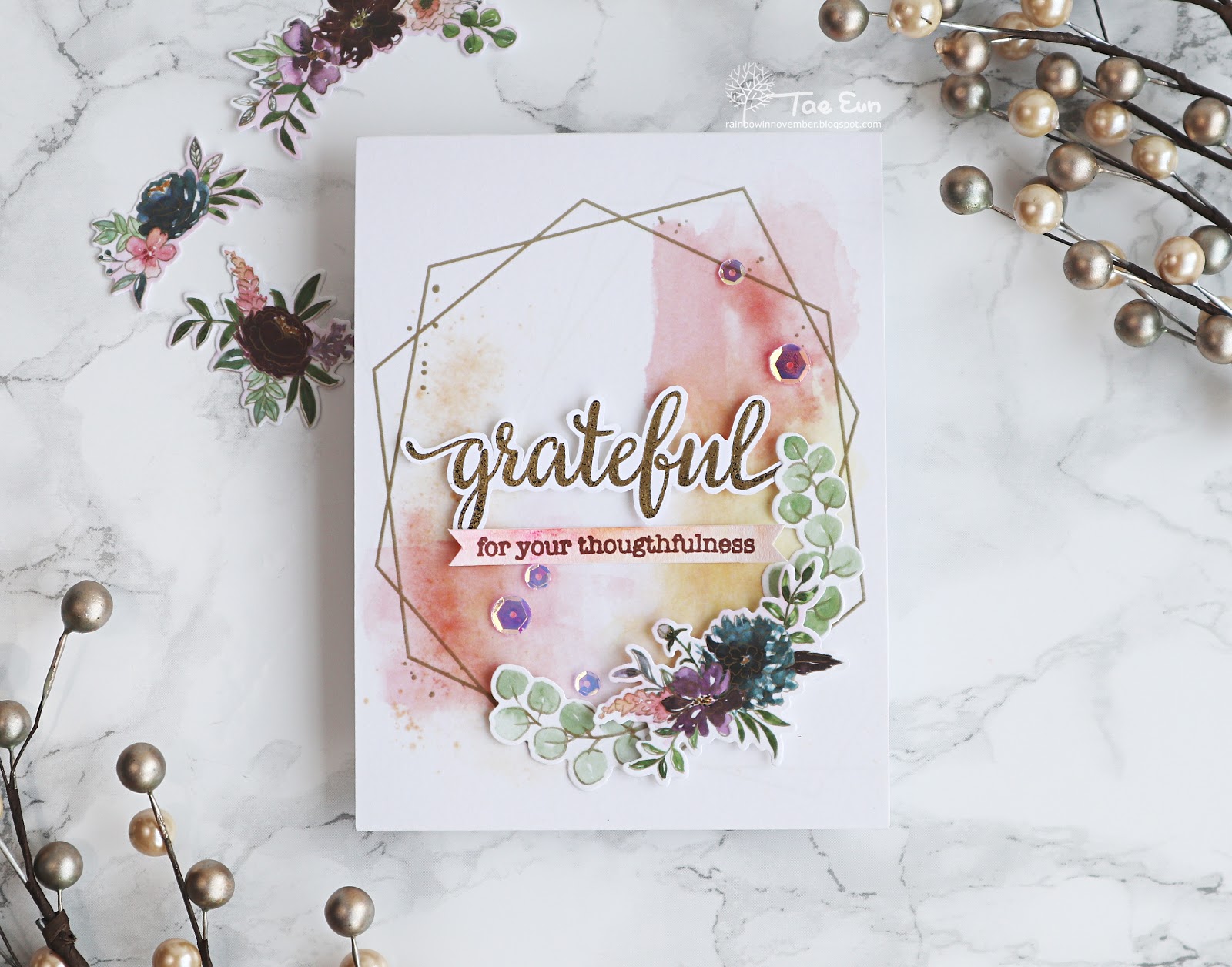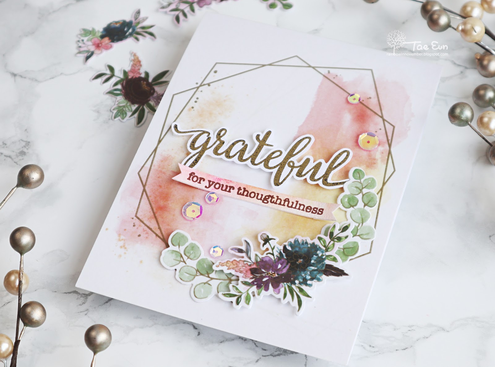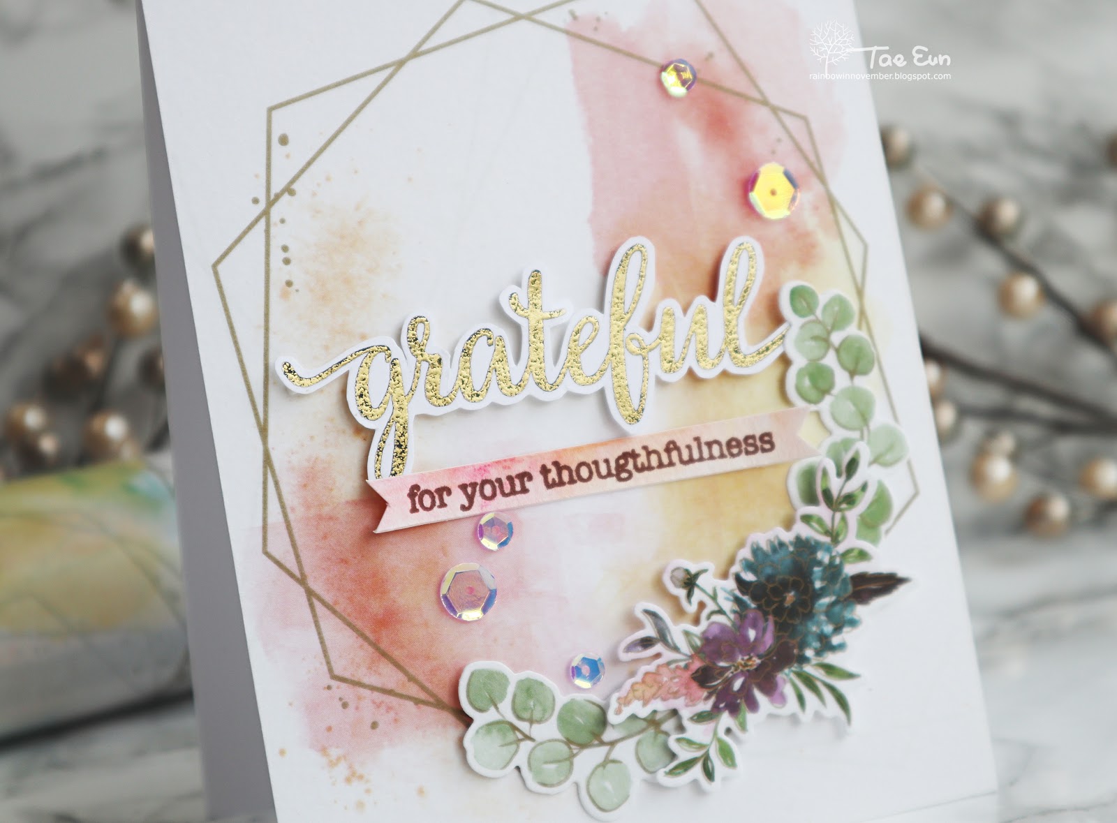 The sentiment is from Floral Cluster stamp set. First I stamped the “grateful” in black and heat embossed it in gold. I fussy cut the sentiment and added it to the card using foam adhesives. The sentiment strip was cut from a panel I watercolored in the colors I picked from the background panel. The sentiment was stamped in brown. I glued the middle part of the strip directly on the card and slightly curled the fishtail ends up.