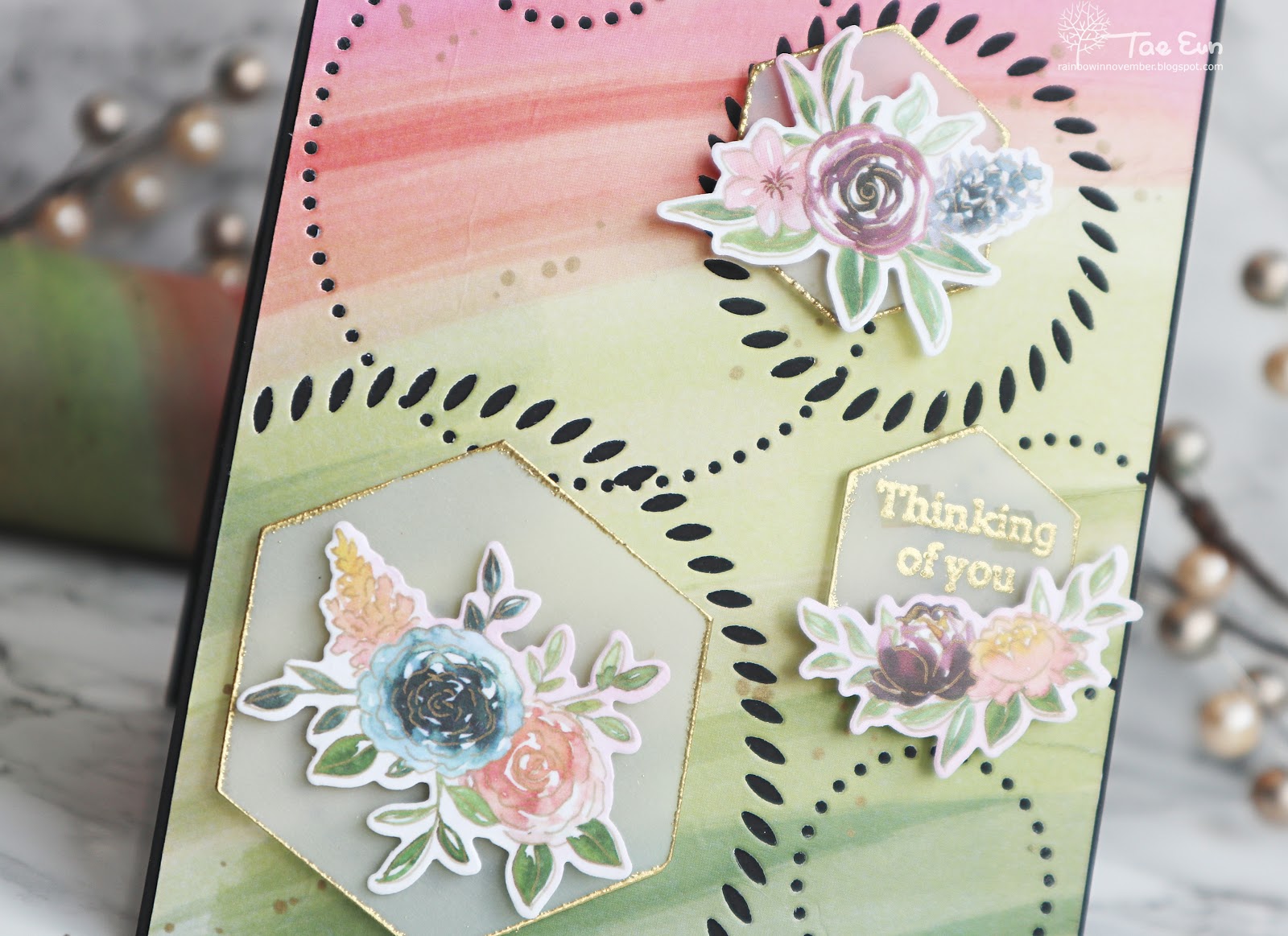 I cut some vellum hexagon to give the floral clusters their mat to sit on. I used Basic Label Frames die set. I gold heat embossed the sides of the hexagon, and gold heat embossed the sentiment from Just a Little Lovely stamp set on the smallest hexagon.