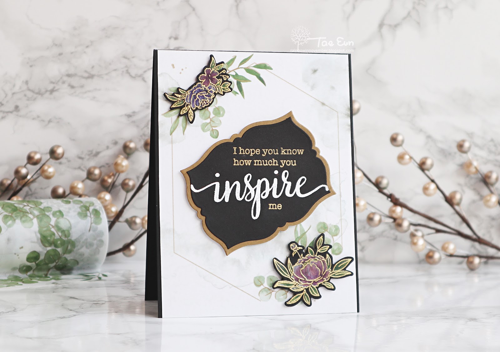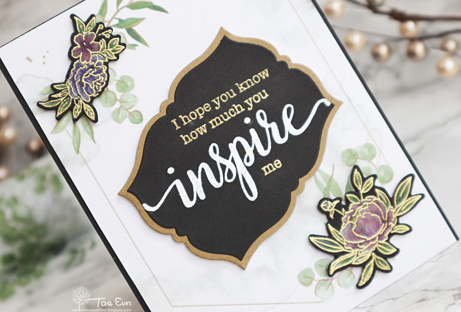 The background is a A2 sized frame design from Eucalyptus Fantasy Washi tape. I adhered it on a white cardstock, narrowed down the panel a little bit and adhered it on a black cardbase. The small floral clusters from Floral Elements stamp set were gold heat embossed on some black sketch paper and colored using Luminance colored pencils. I then die cut the images using Floral Elements die.