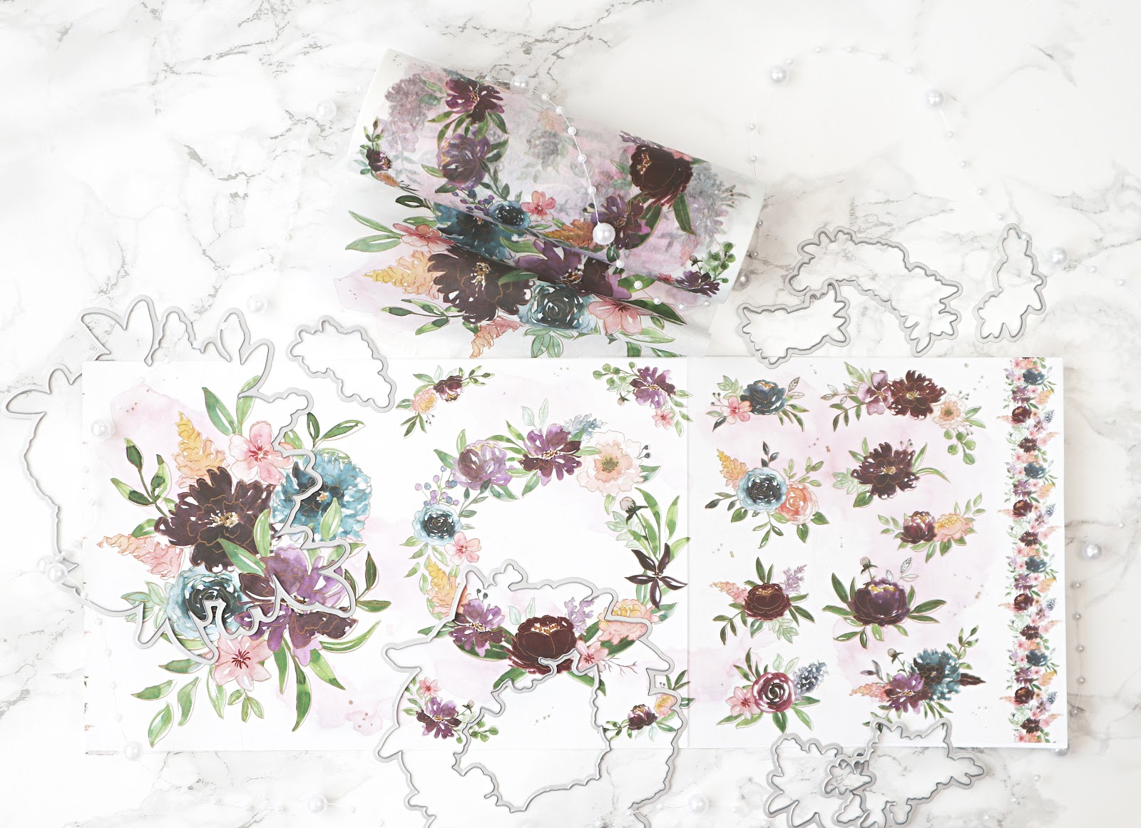 I’ve made five cards to share with you for today, but first I want to show you the wide washi tapes. Each washi tape includes three different designs in A2 size, along with floral border designs in case of Eucalyptus Fantasy and Painted Florals washi tape. After I received the washi tapes I adhered the tape on white cardstock to see the whole design and I used the panels for my cards as the background panel or as main elements after die cutting.